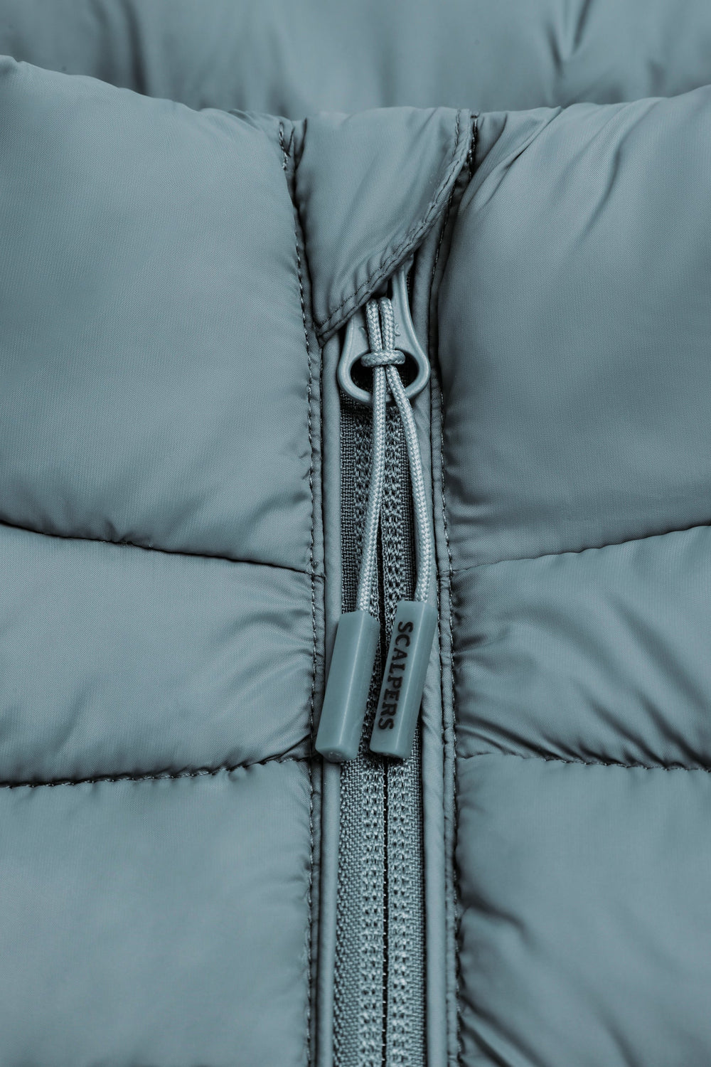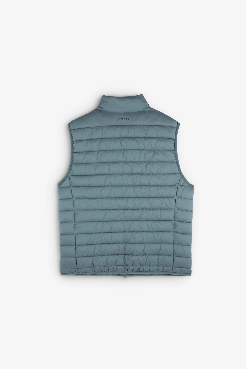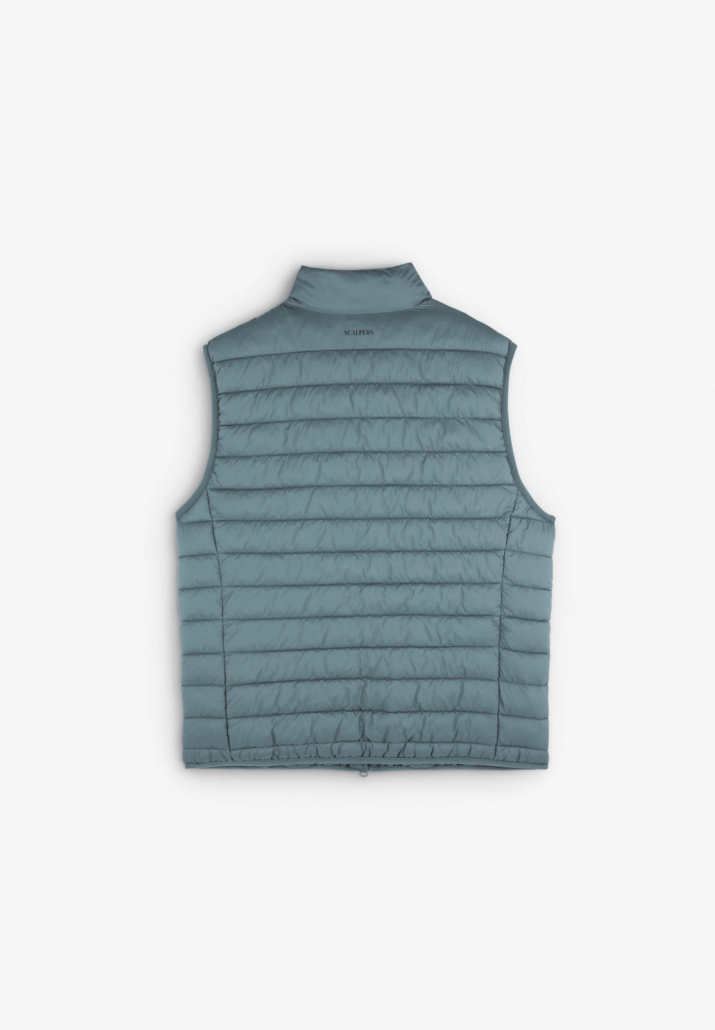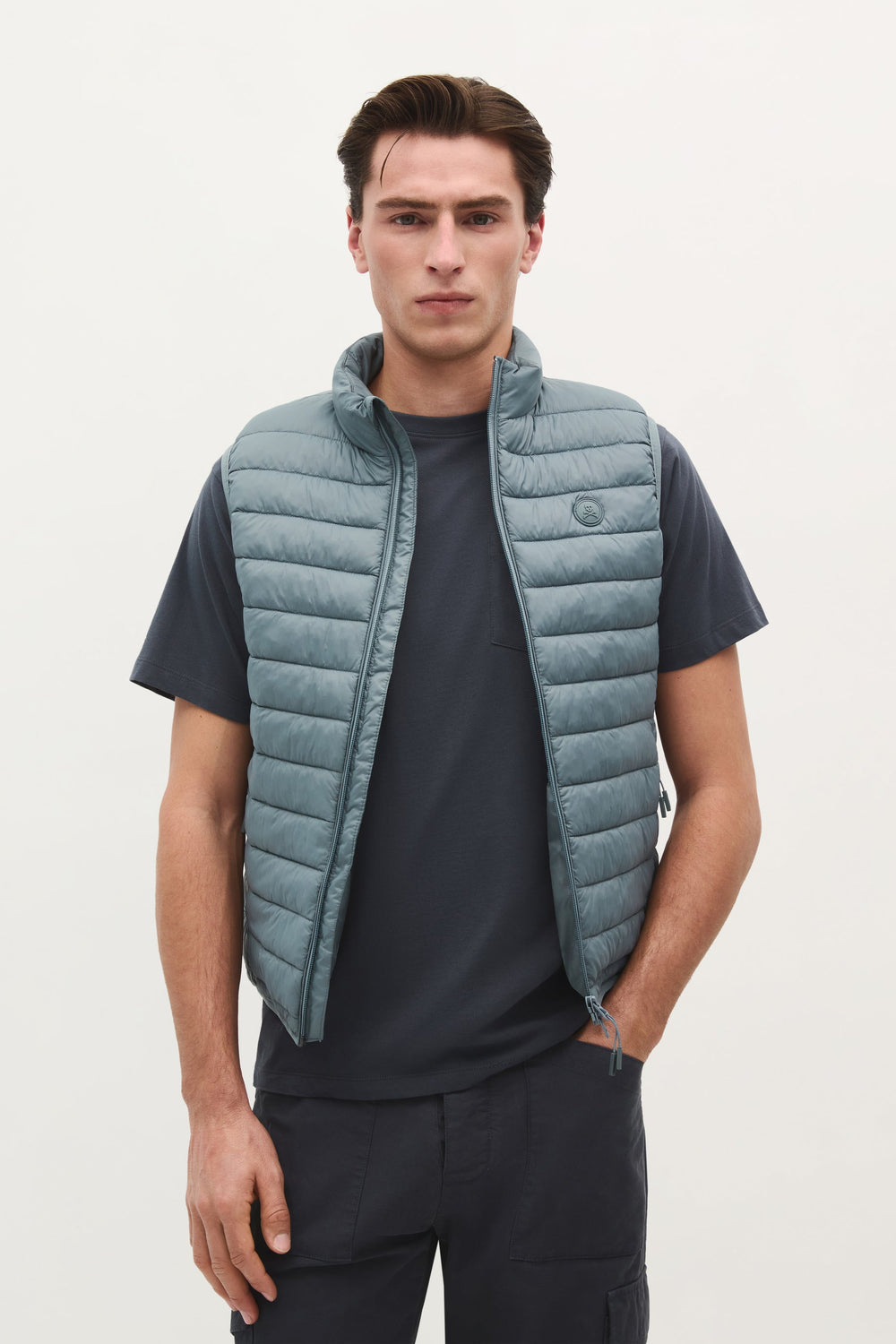 Chaleco acolchado confeccionado en tejido reciclado. Regular fit, cuello subido y cierre con cremallera de doble carro. Manga en sisa y bolsillos laterales con cremallera. Parche de calavera en pecho.