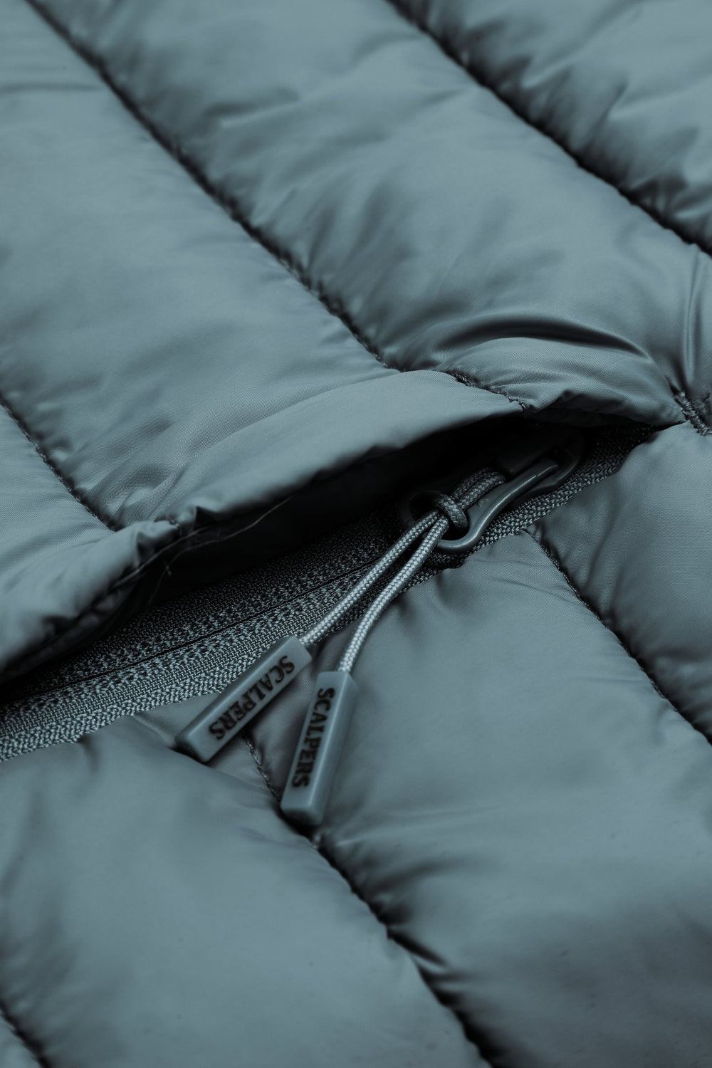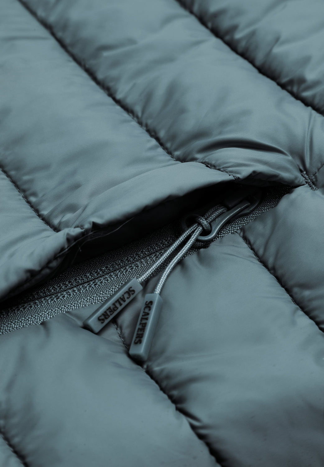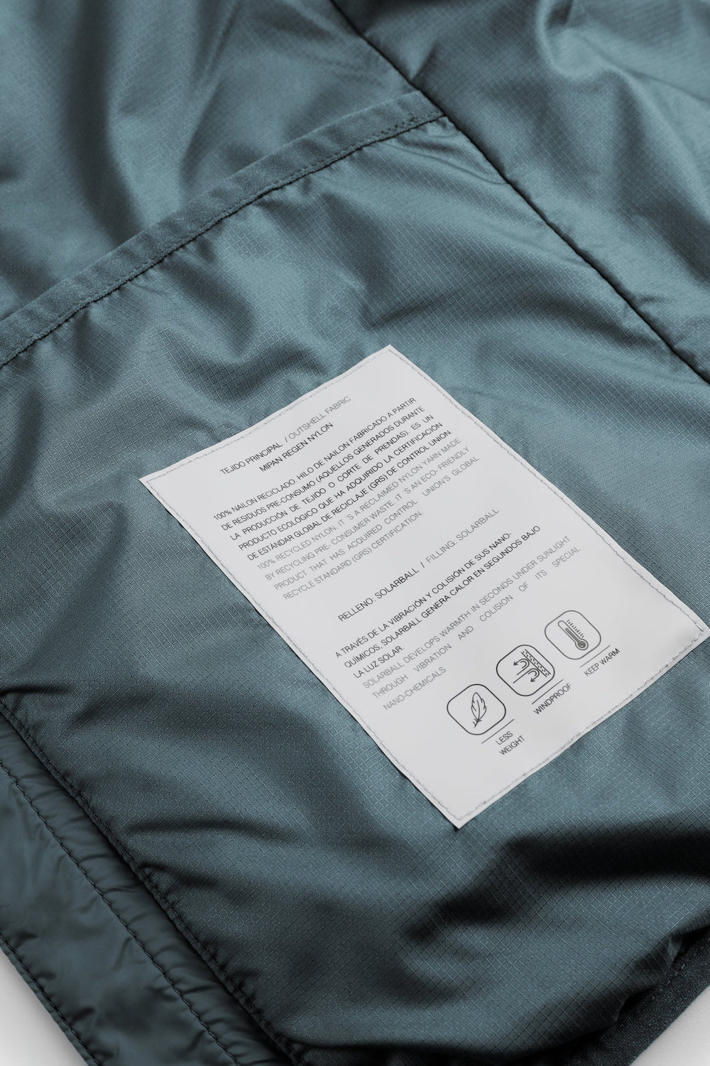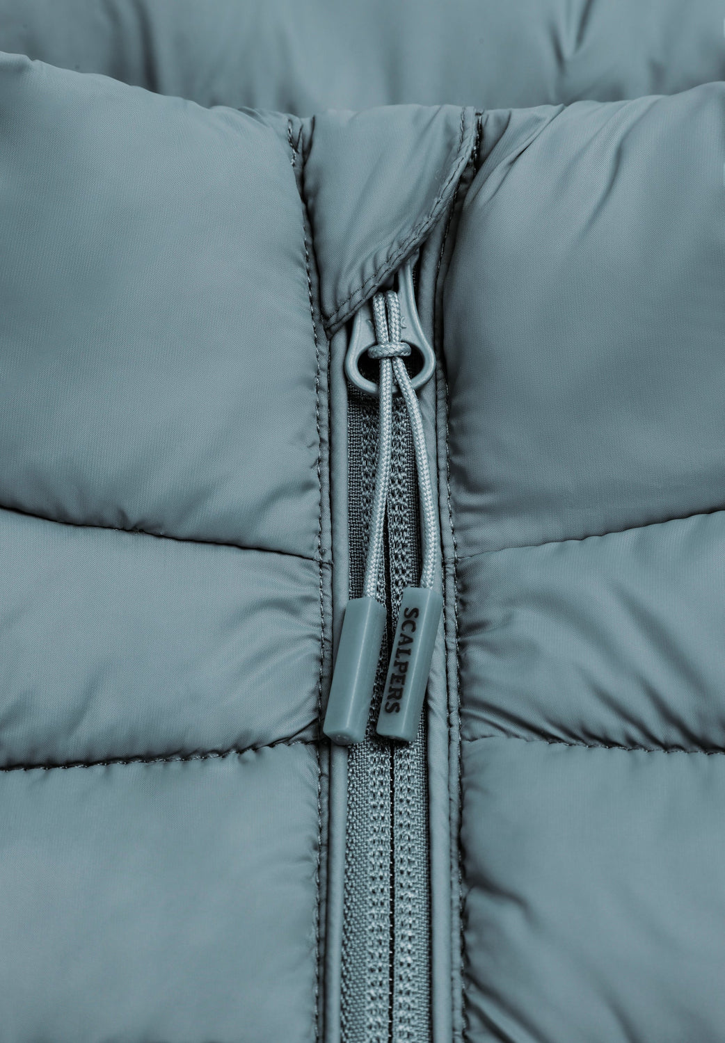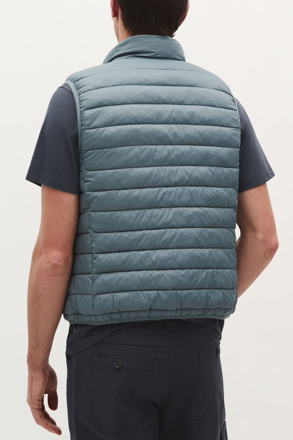 Chaleco acolchado confeccionado en tejido reciclado. Regular fit, cuello subido y cierre con cremallera de doble carro. Manga en sisa y bolsillos laterales con cremallera. Parche de calavera en pecho.
