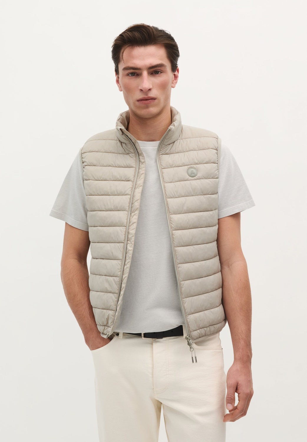 Chaleco acolchado confeccionado en tejido reciclado. Regular fit, cuello subido y cierre con cremallera de doble carro. Manga en sisa y bolsillos laterales con cremallera. Parche de calavera en pecho.