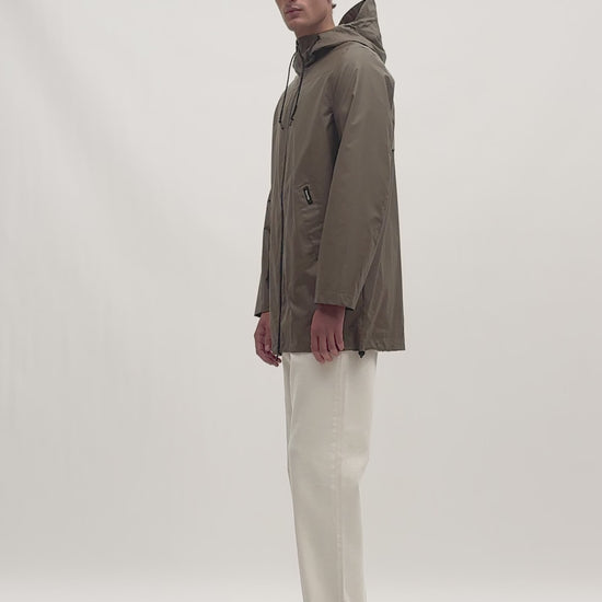 Parka impermeable tipo chubasquero. Confeccionada en 100% algodón resinado. Cuello con capucha ajustable con cordón. Cierre con cremallera termosellada. Manga larga. Bolsillos laterales con tapeta y snap. Detalle en la espalda.