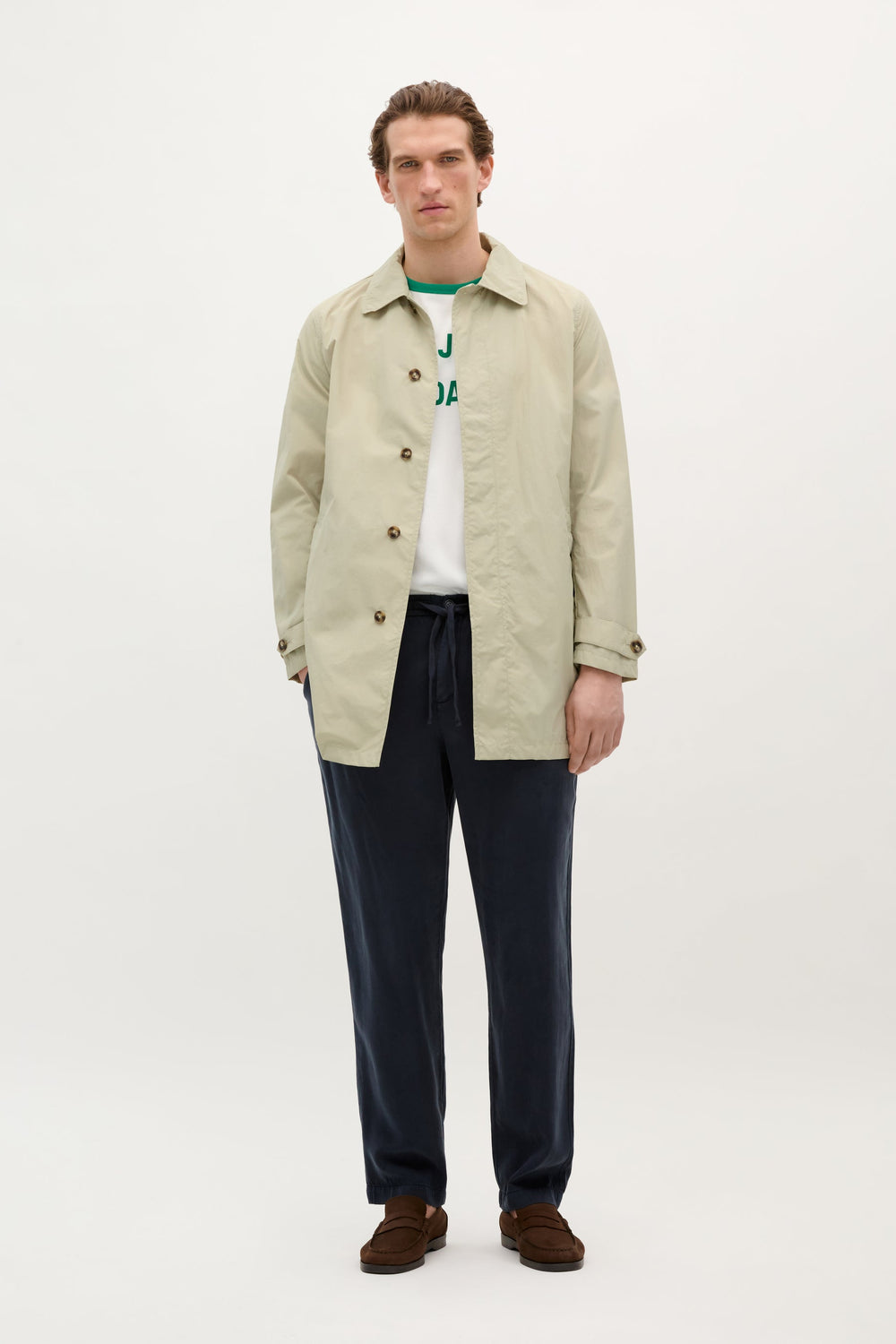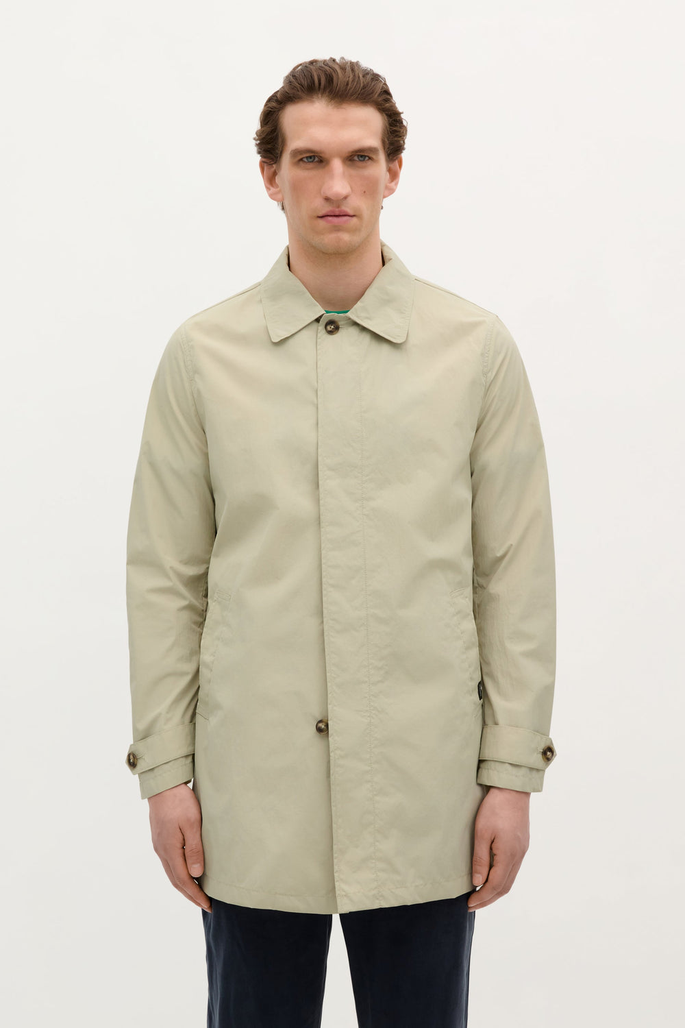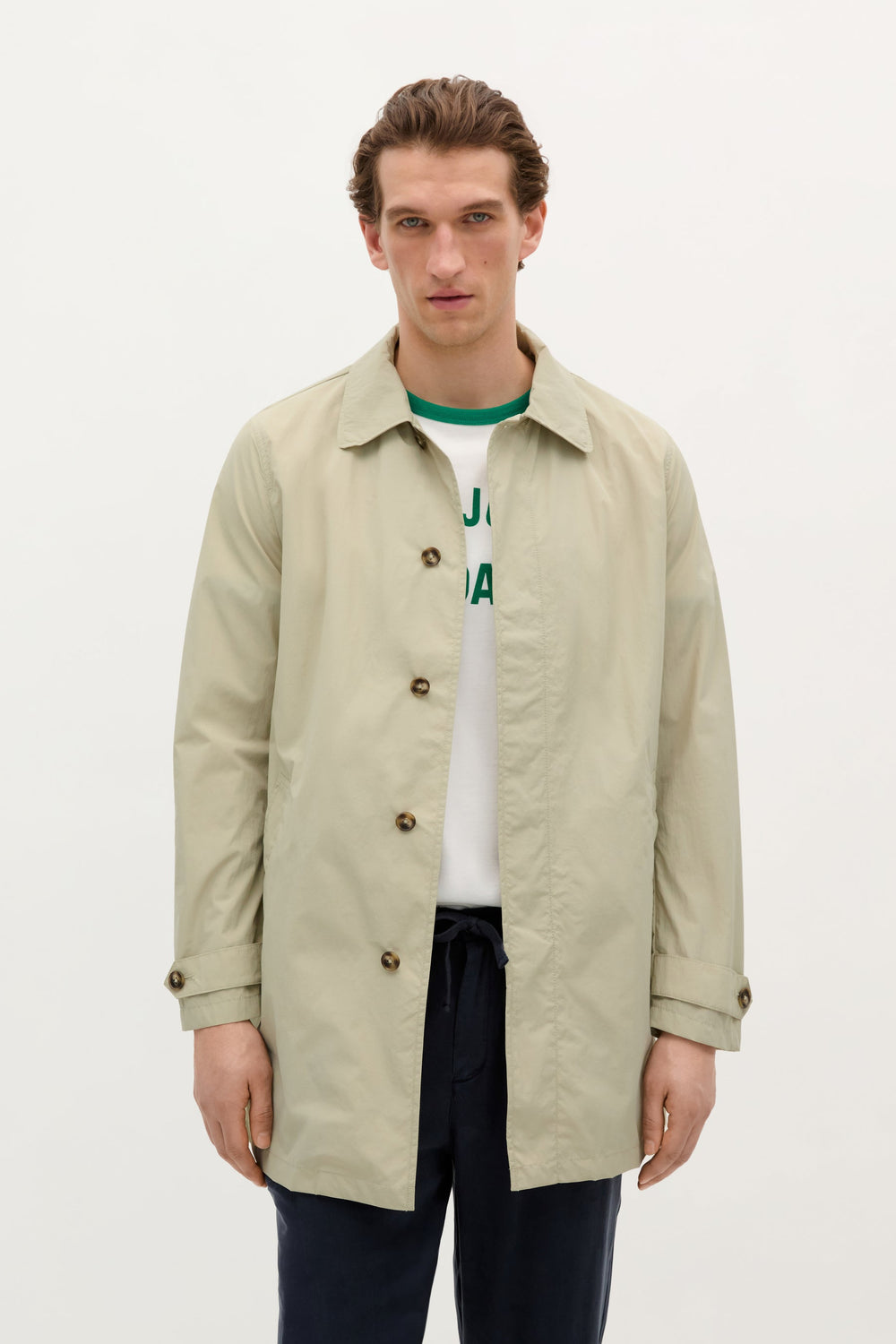 Gabardina ligera. Confeccionada en tejido técnico impermeable, corte Regular Fit, cuello camisero, bolsillos ocultos y terminación con ceñidor de botón en el puño.