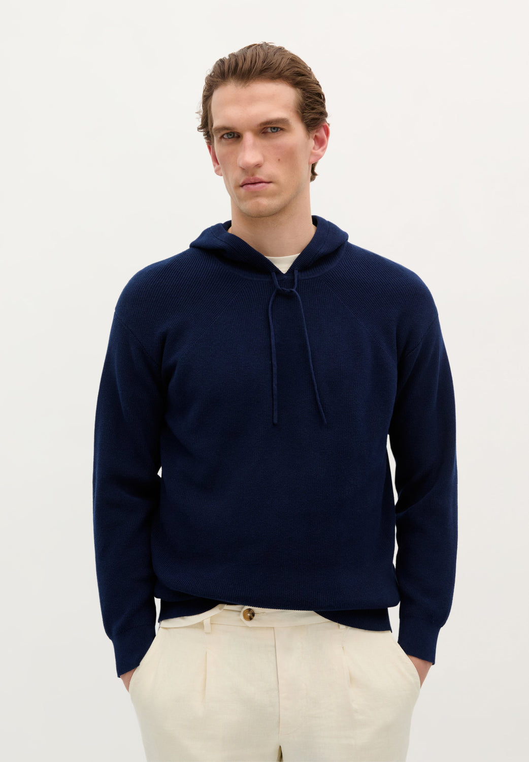 Jersey de punto con capucha. Confeccionado en 100% algodón BCI con cordones ajustables en el cuello. Manga larga y puños acabados en rib.