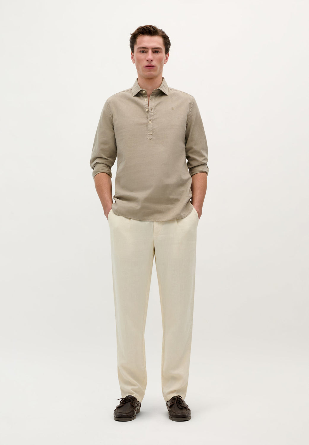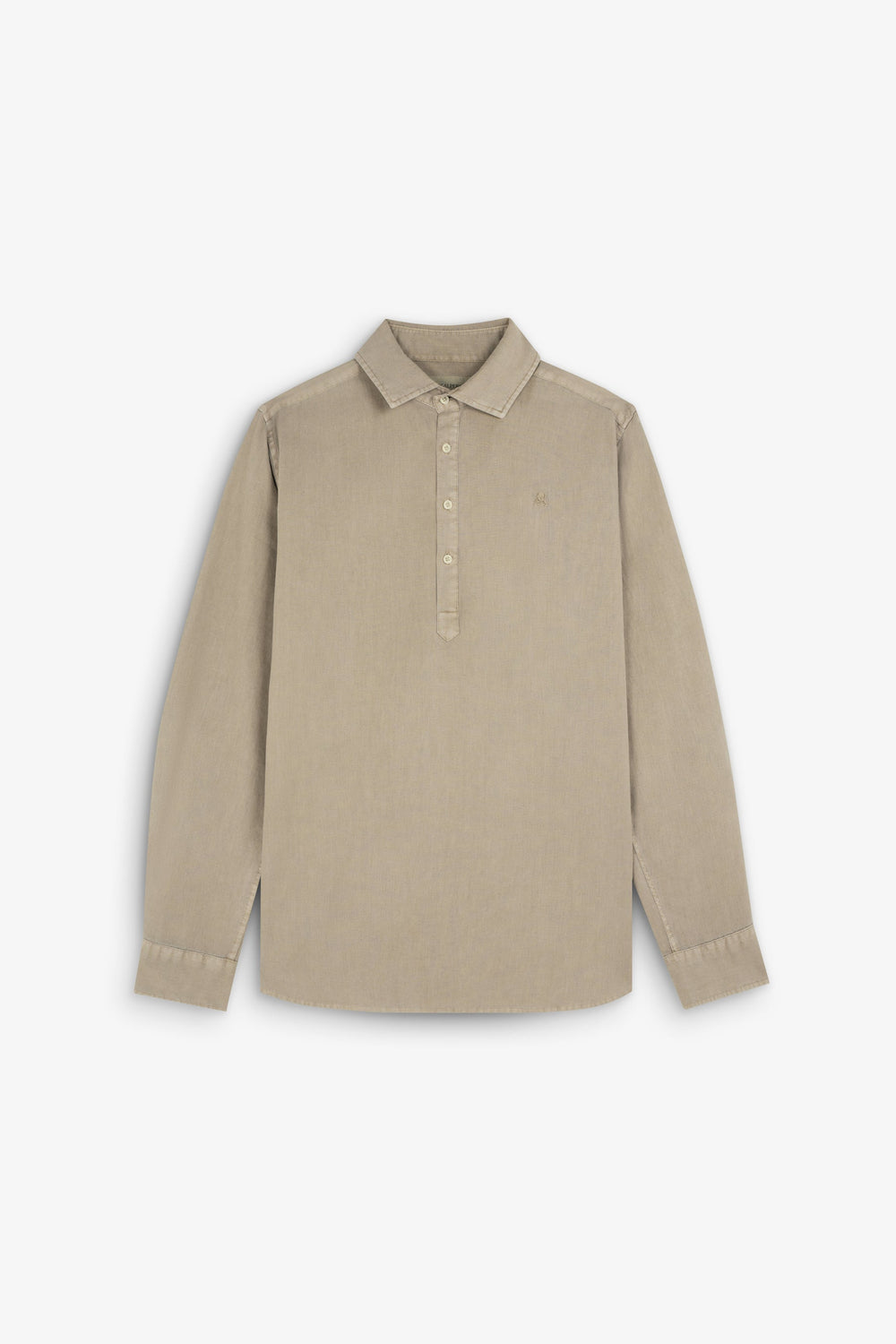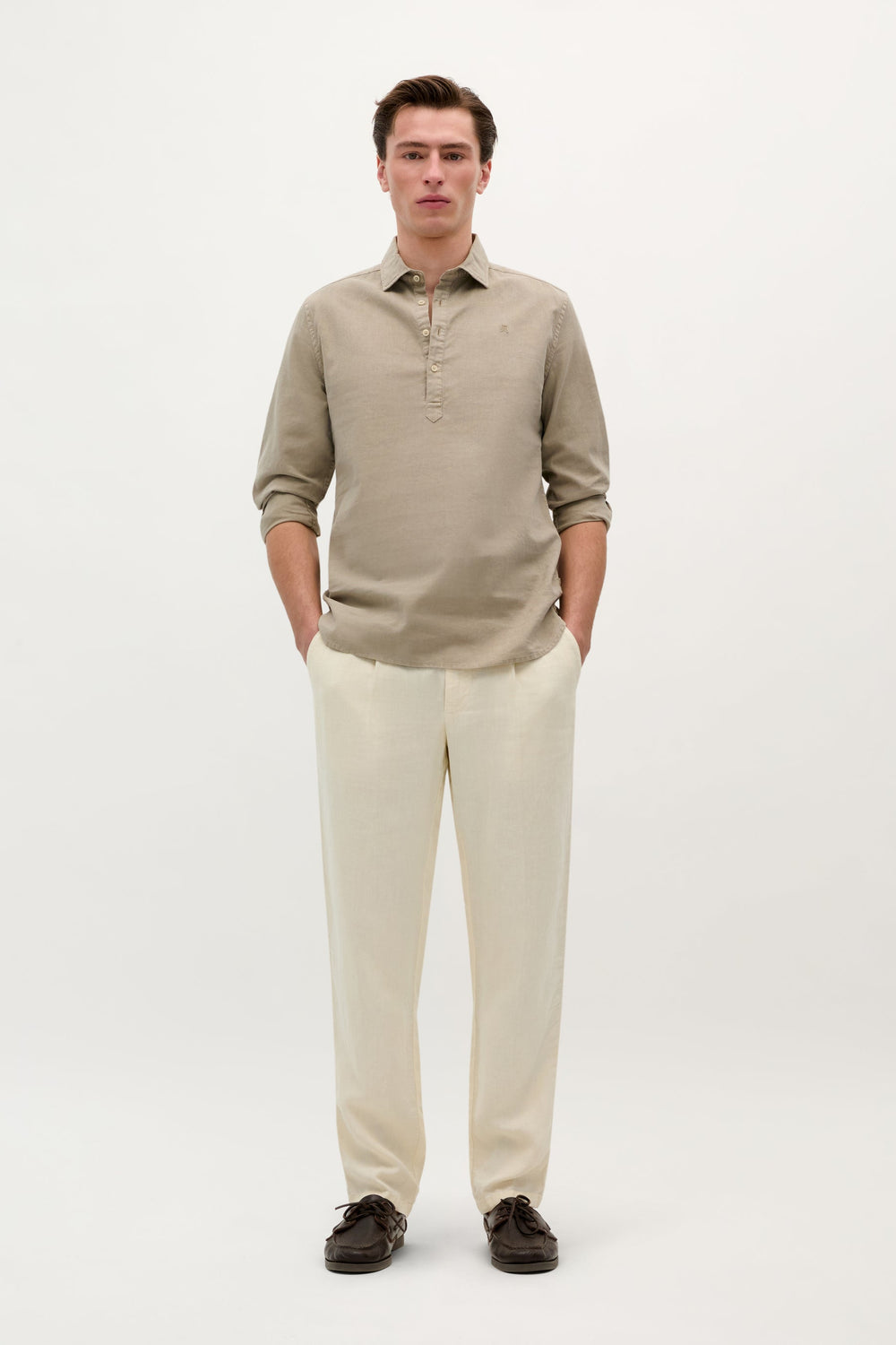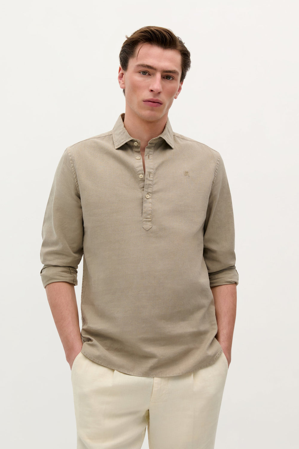 Camisa confeccionada en Algodón y Lino. Cerradura abotonada estilo polo. Manga Larga. Cierre en puños ajustable mediante botón. Monograma bordado a tono en parte frontal.