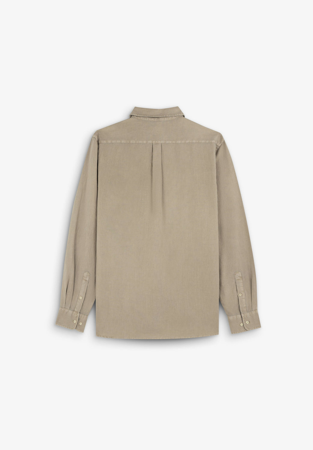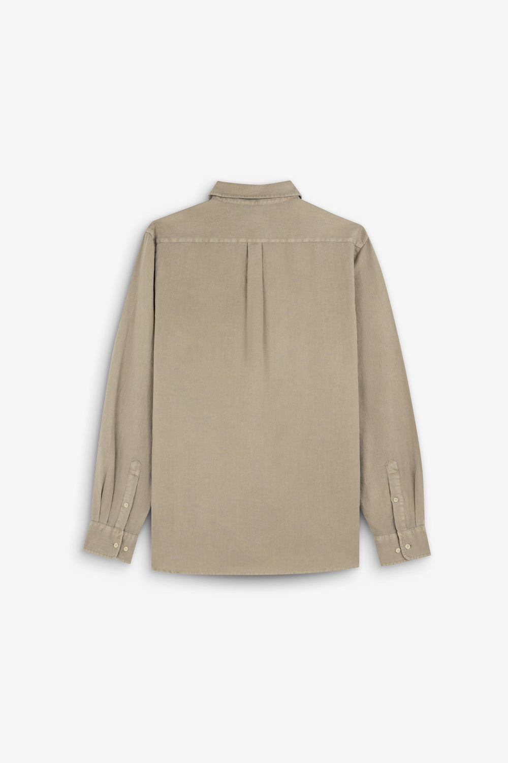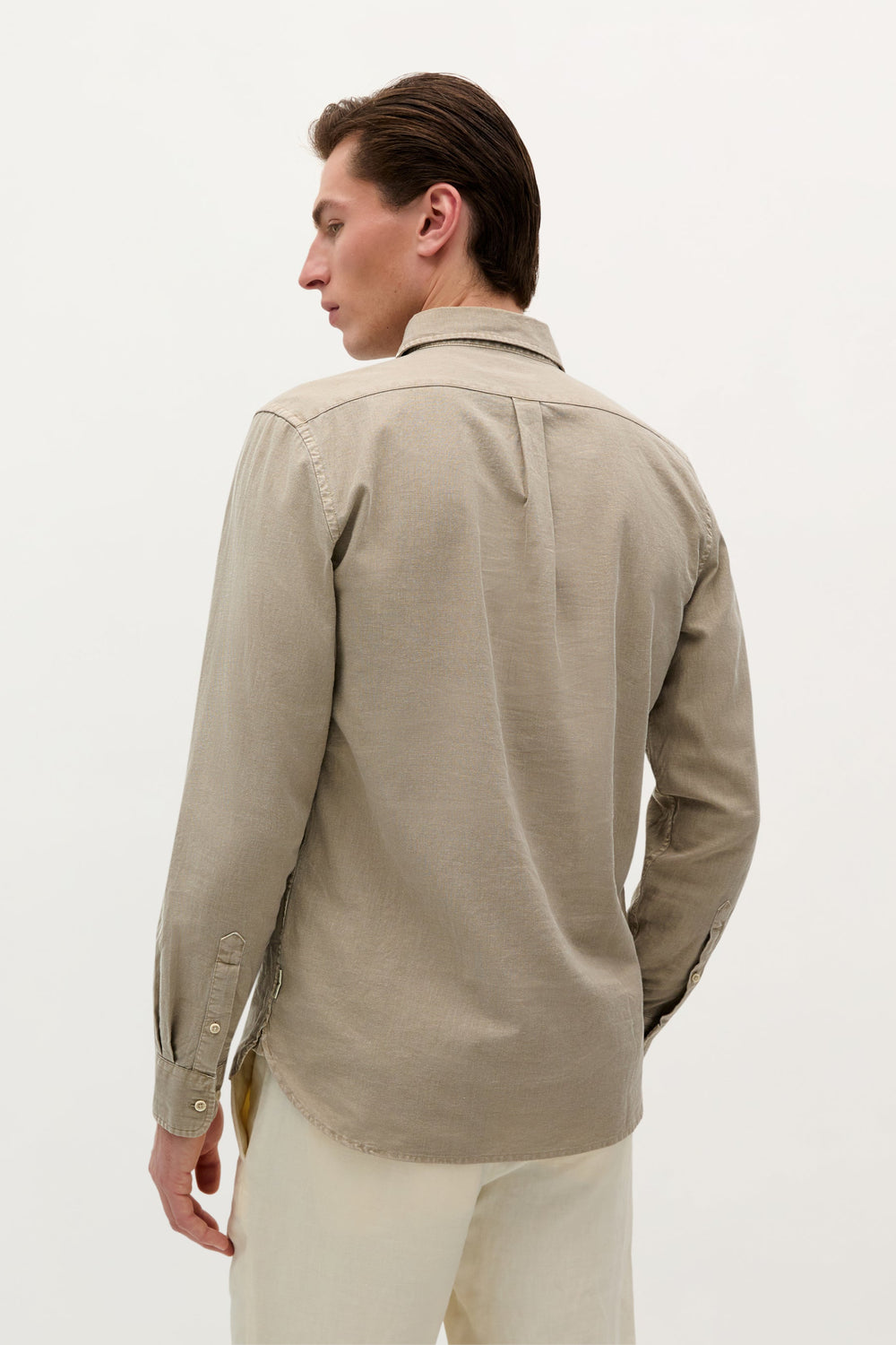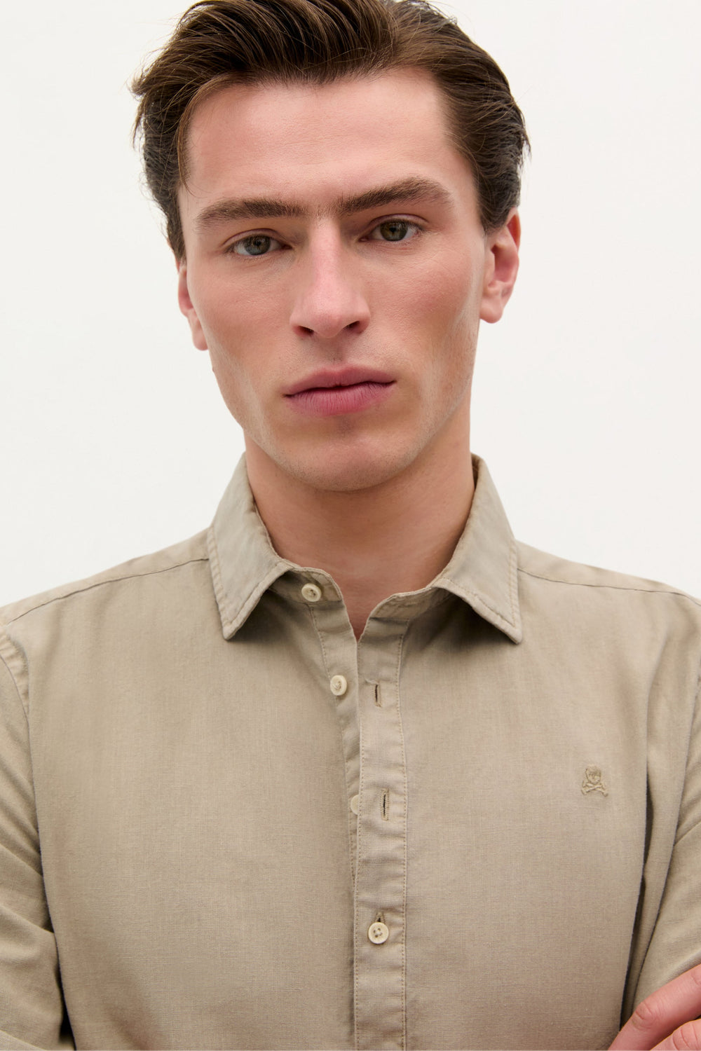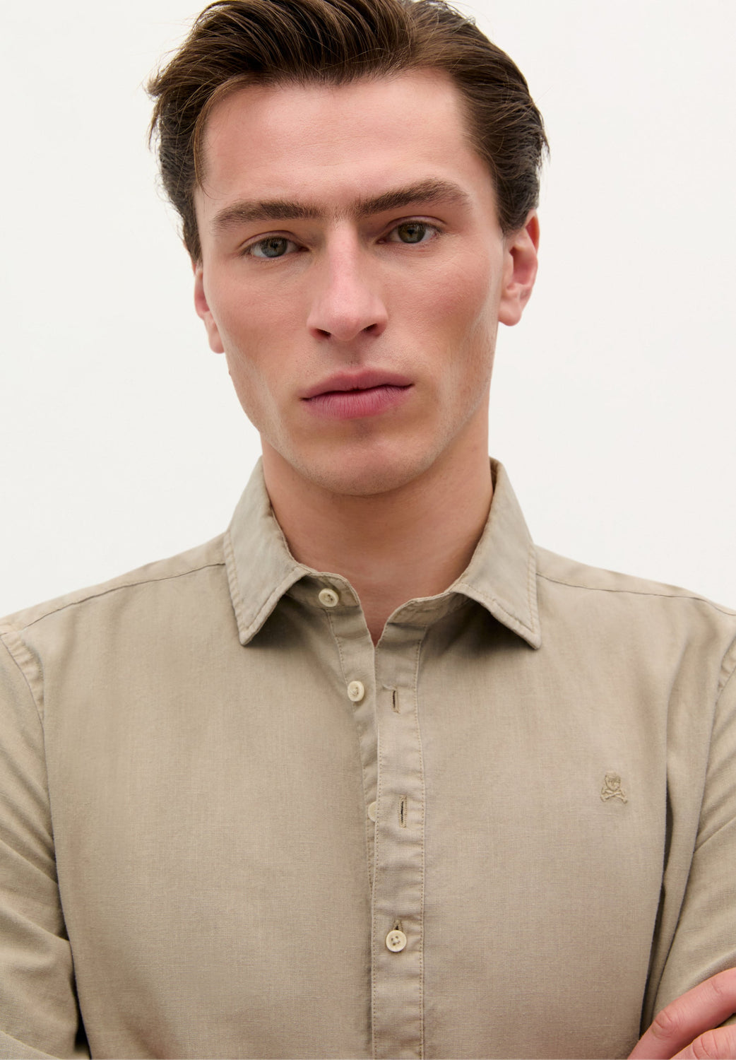 Camisa confeccionada en Algodón y Lino. Cerradura abotonada estilo polo. Manga Larga. Cierre en puños ajustable mediante botón. Monograma bordado a tono en parte frontal.