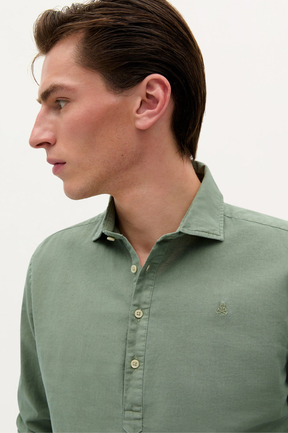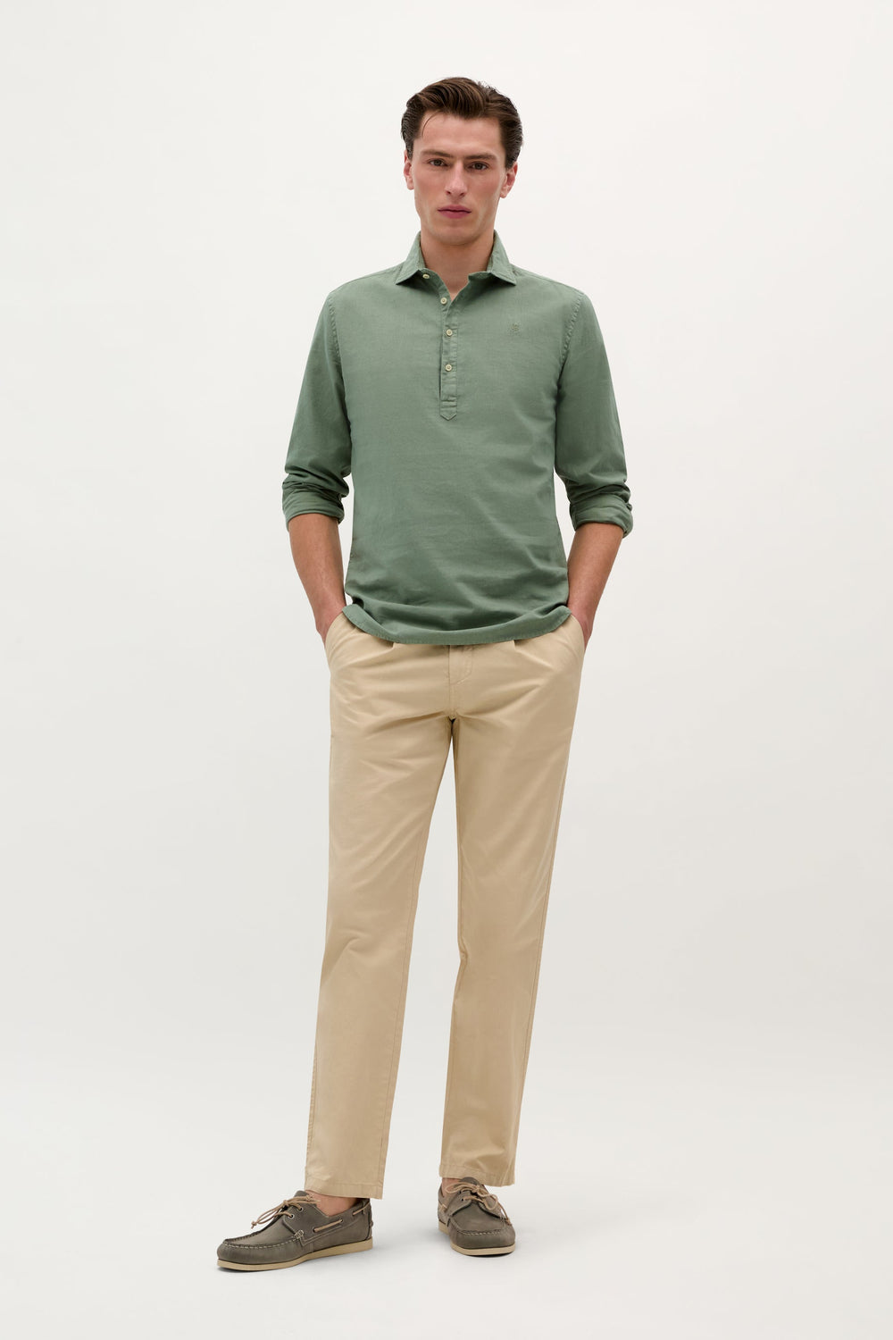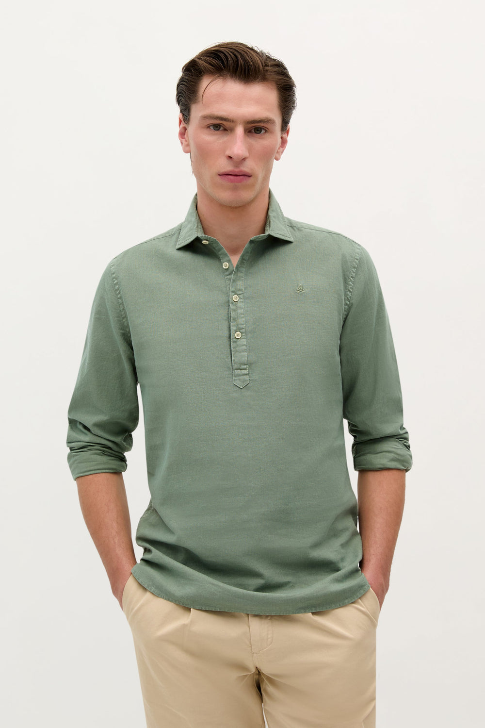 Camisa confeccionada en Algodón y Lino. Cerradura abotonada estilo polo. Manga Larga. Cierre en puños ajustable mediante botón. Monograma bordado a tono en parte frontal.
