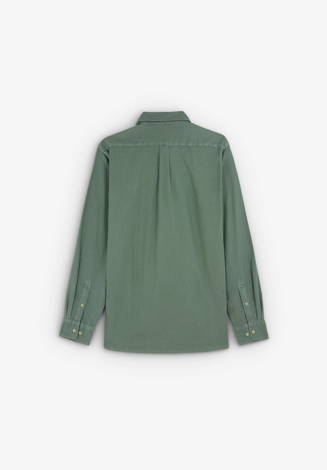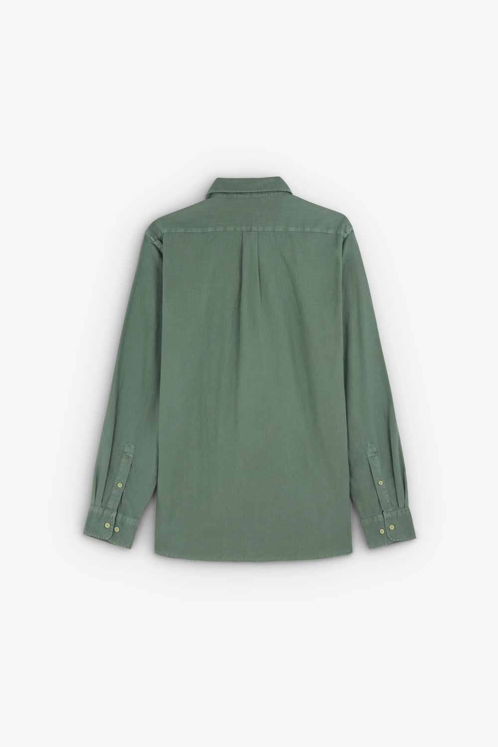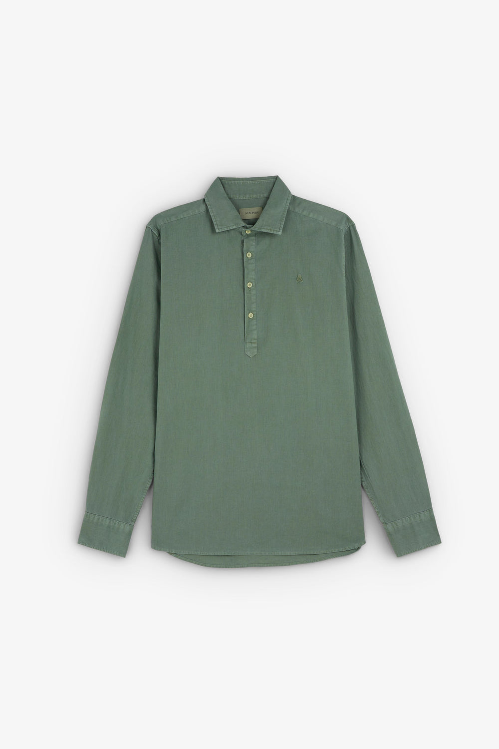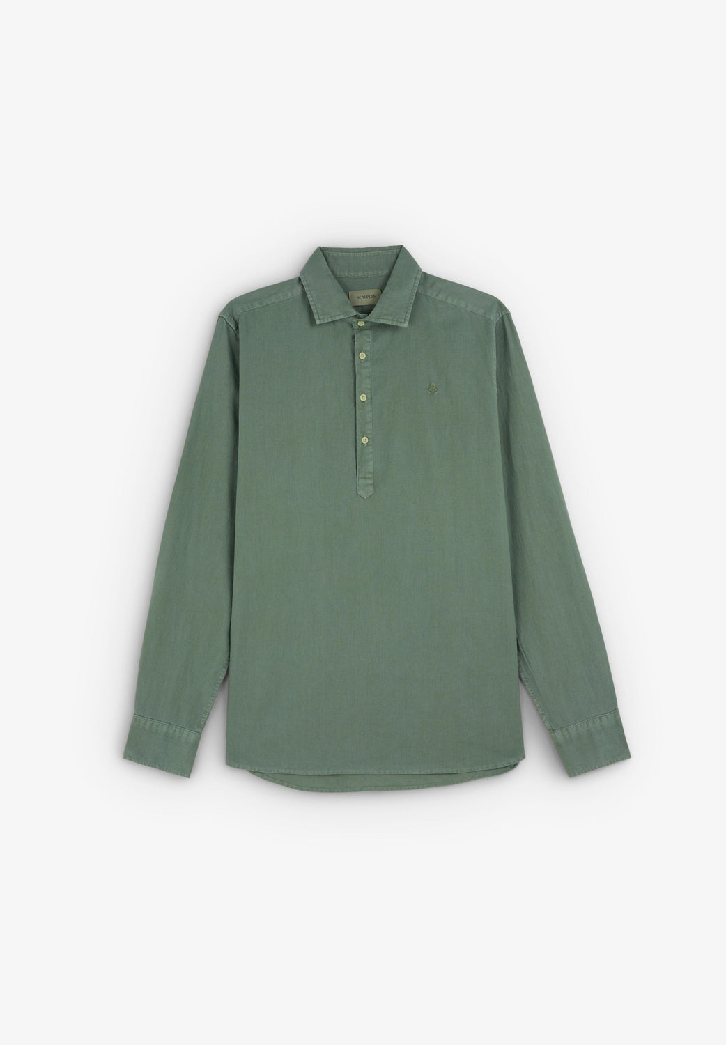 Camisa confeccionada en Algodón y Lino. Cerradura abotonada estilo polo. Manga Larga. Cierre en puños ajustable mediante botón. Monograma bordado a tono en parte frontal.