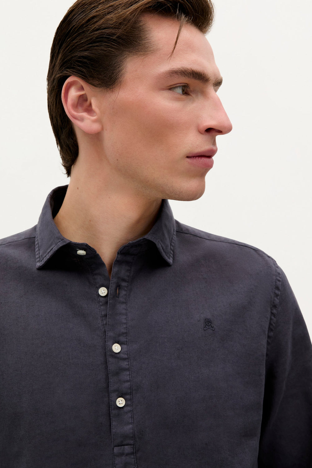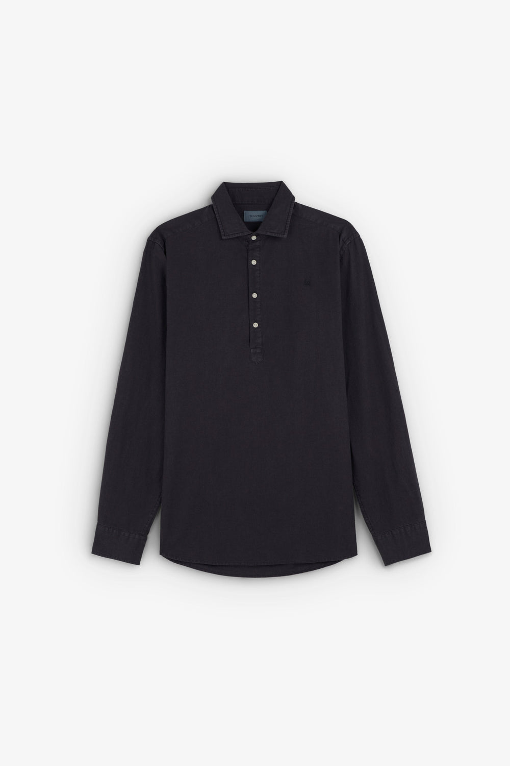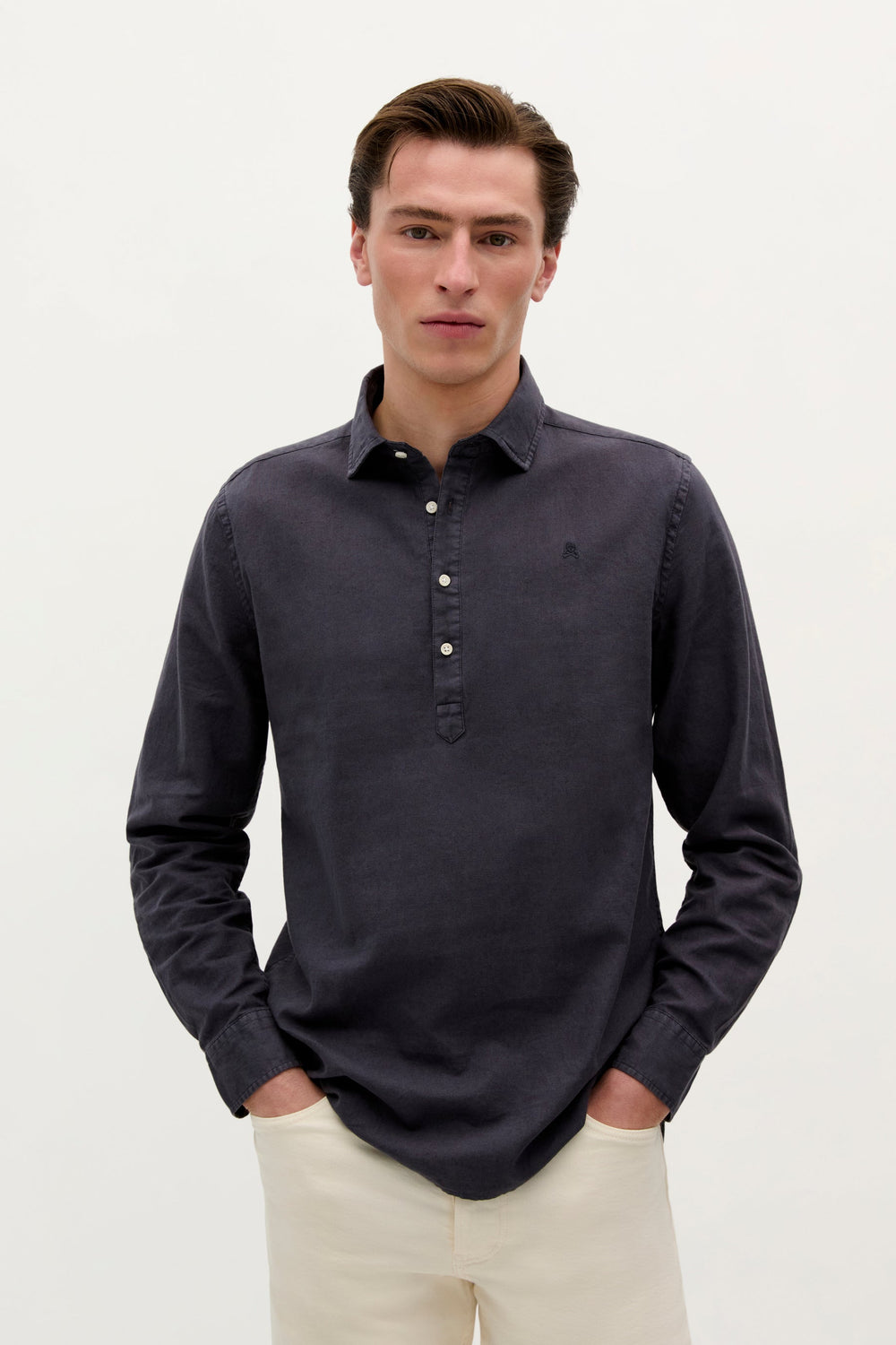 Camisa confeccionada en Algodón y Lino. Cerradura abotonada estilo polo. Manga Larga. Cierre en puños ajustable mediante botón. Monograma bordado a tono en parte frontal.