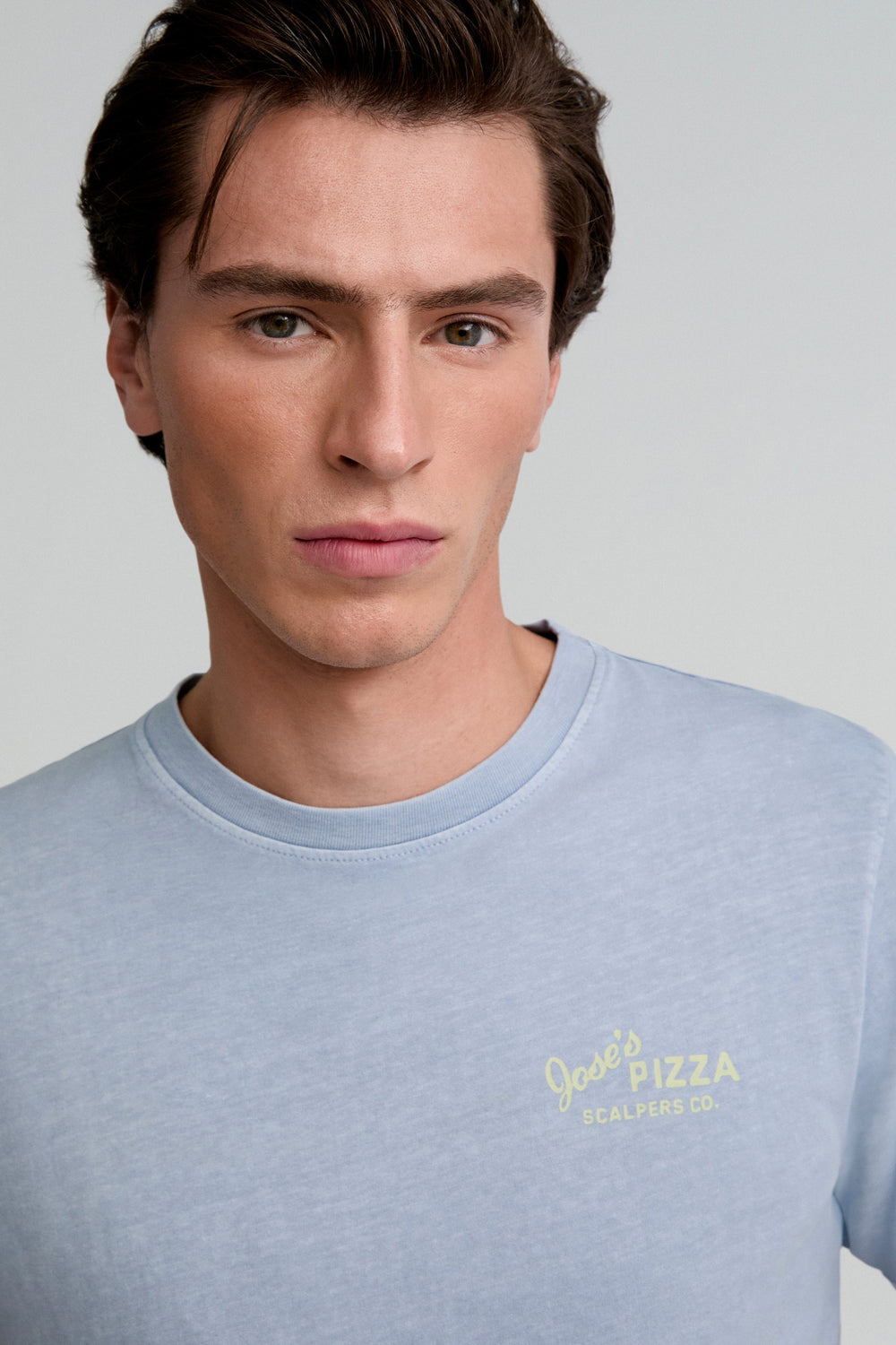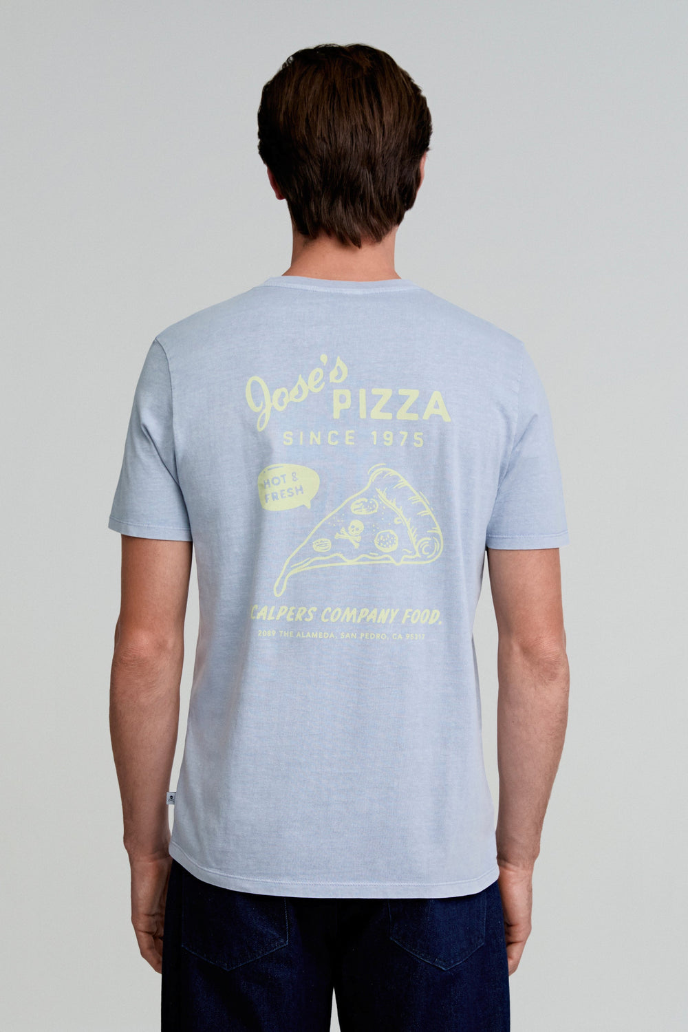 Camiseta confeccionada en 100% algodón BCI. Regular fit, cuello redondo y manga corta. Detalle print de pizza a contraste en parte trasera y pecho.