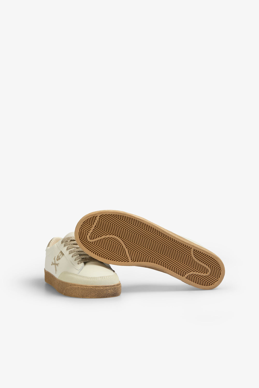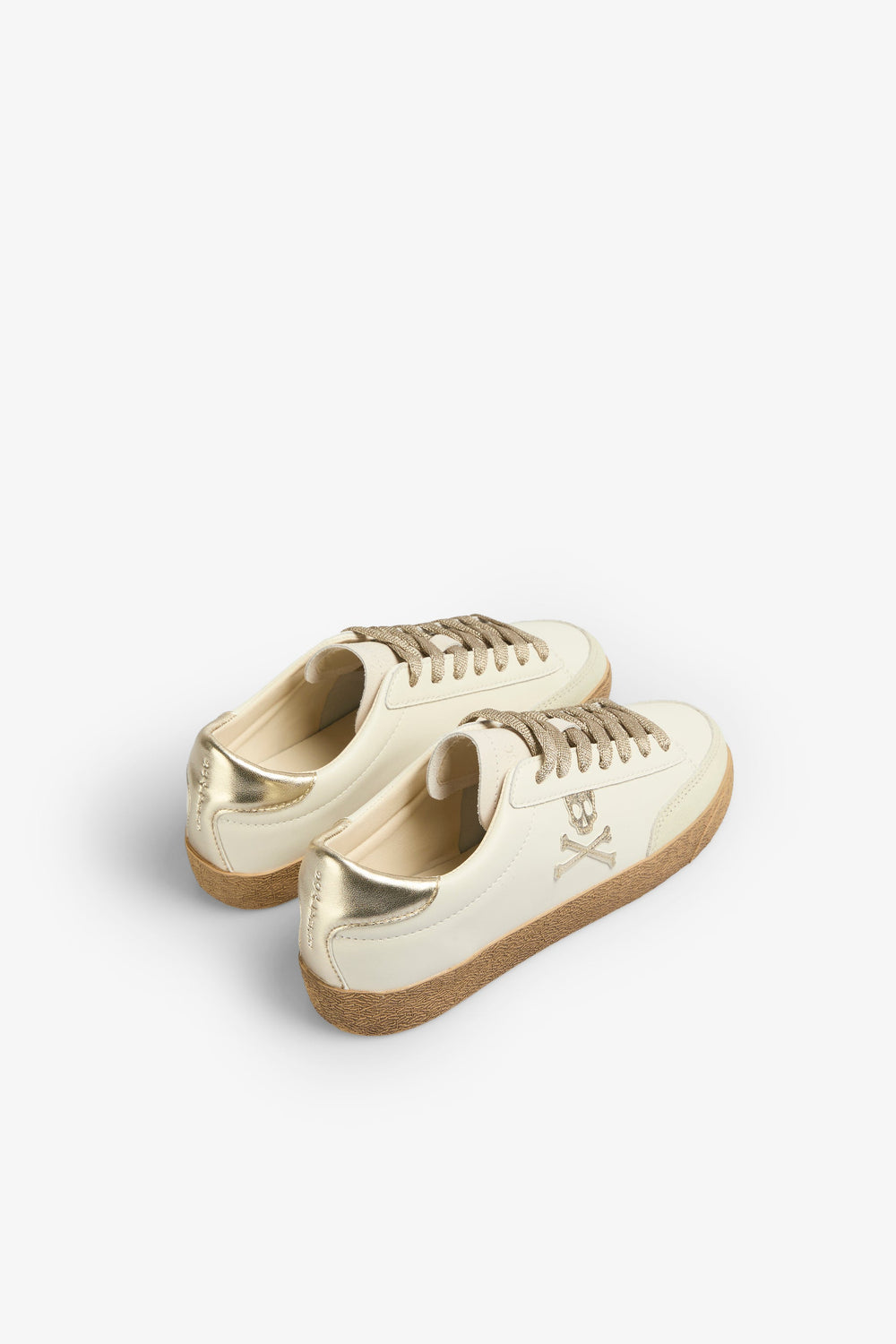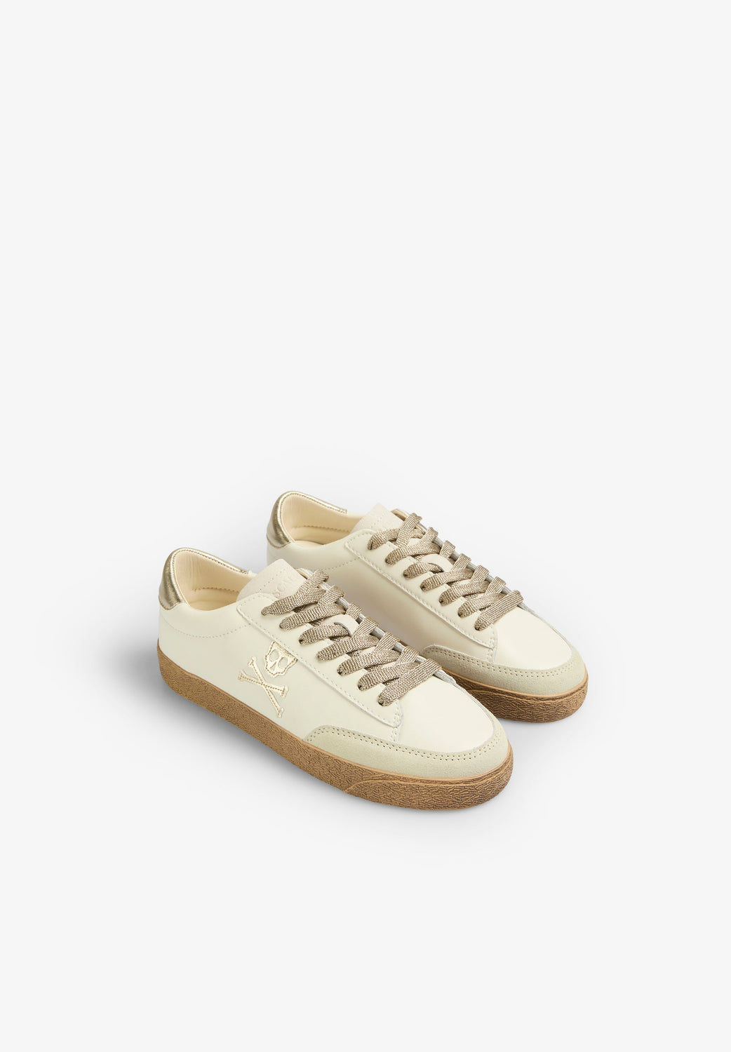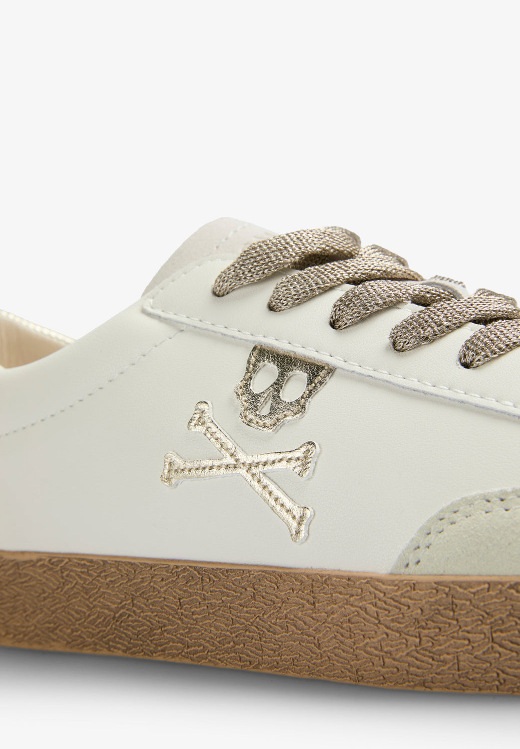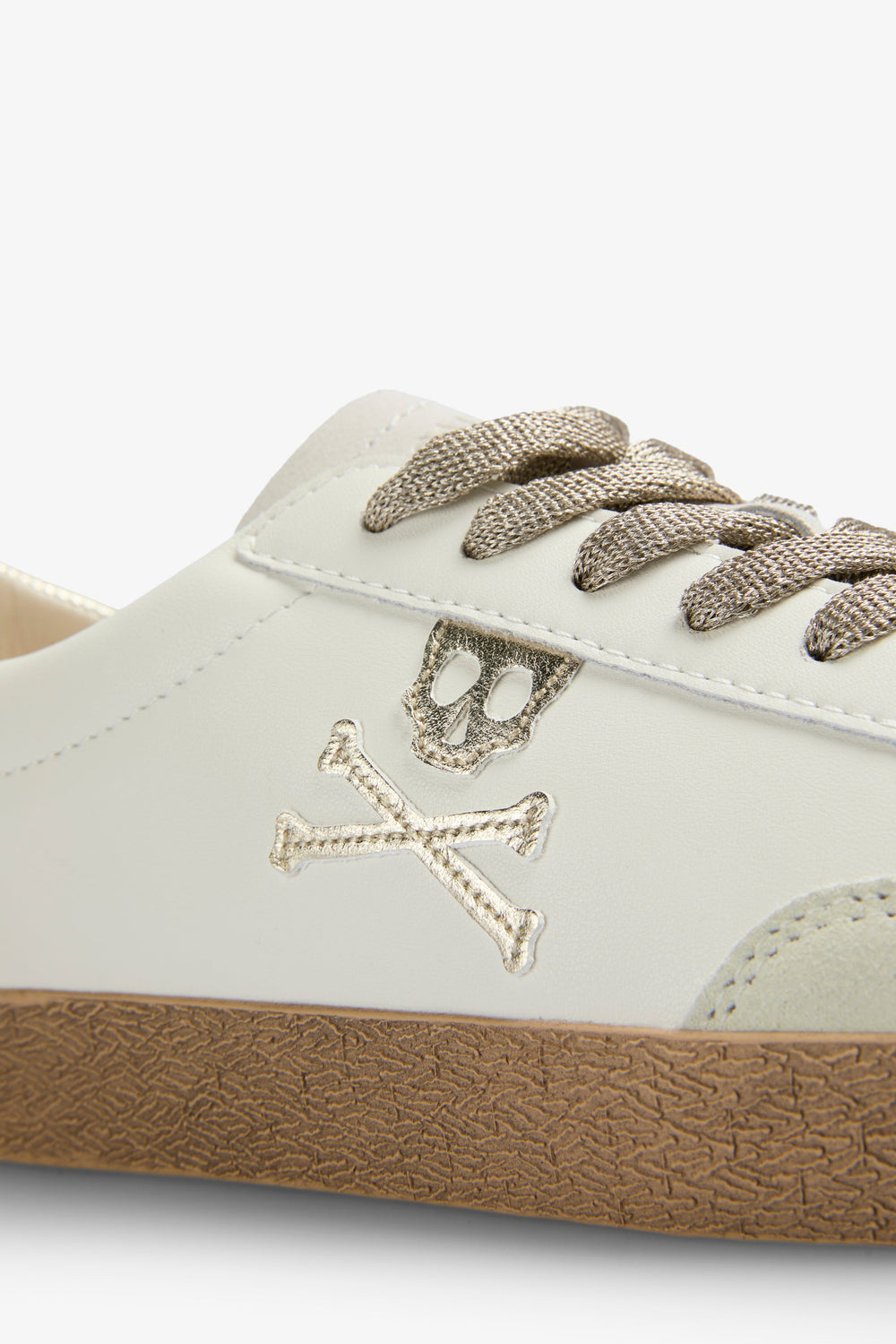 Sneakers bajas con calavera lateral a contraste metalizado y talón a contraste metalizado. Confeccionadas en ante. Cierre con cordones a contraste con glitter. Suela de goma caramelo. Detalles en ante a contraste en puntera. Detalles de logo grabado en talón.