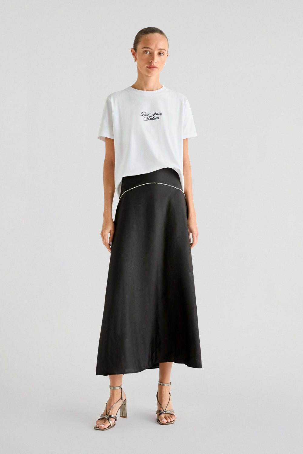 Falda midi confeccionada en tejido satinado. Regular fit, cierre con cremallera lateral y detalle de cristales.