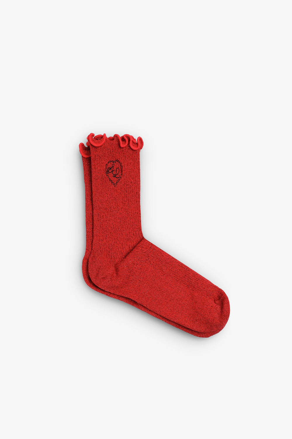 Calcetines confeccionados en tejido con lurex. Caña media terminada en frunce y logo bordado metalizado.