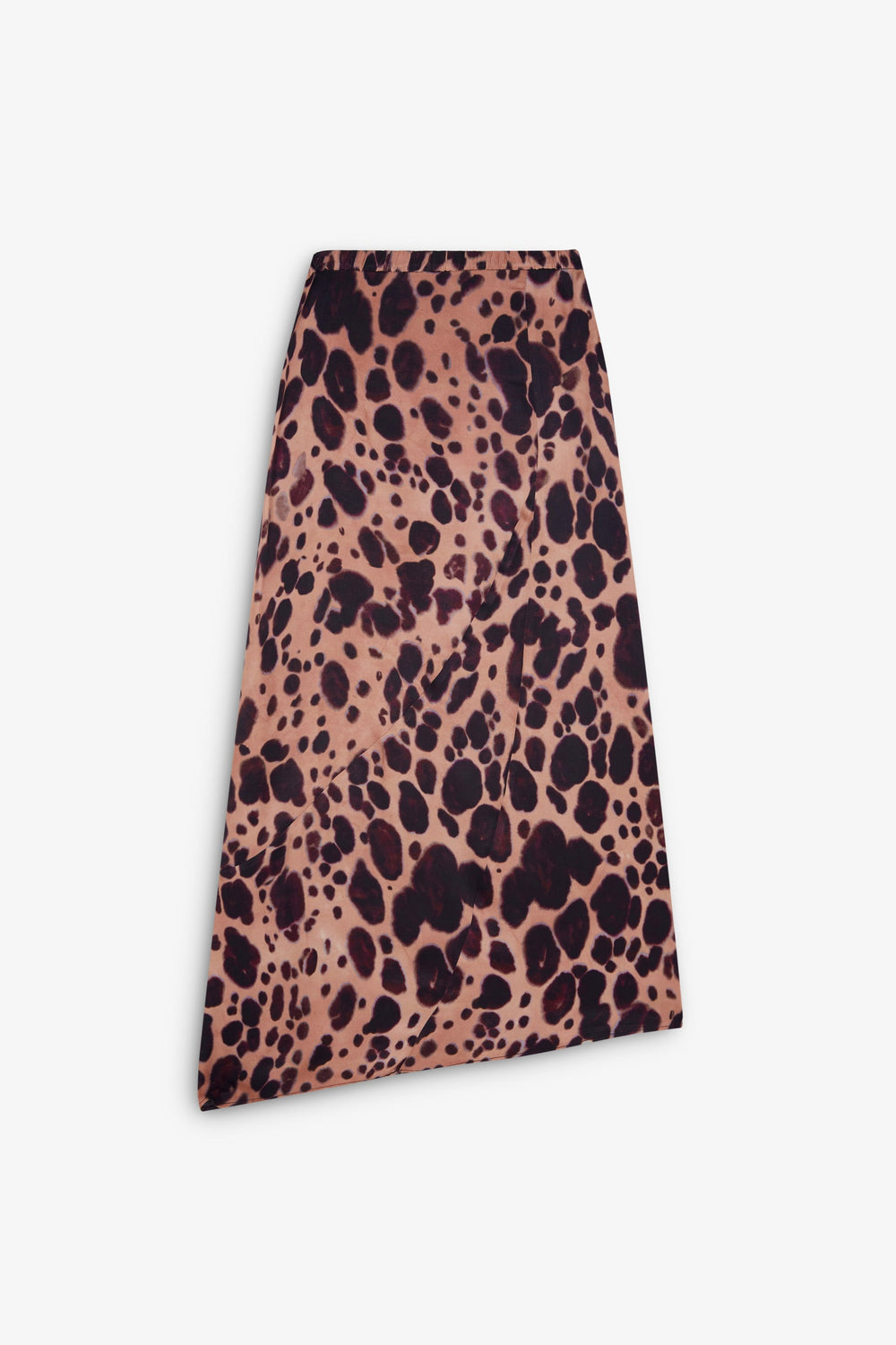 Falda midi estampada animal print confeccionada en tejido satinado fluido. Corte asimétrico en el bajo con cierre de cremallera lateral.