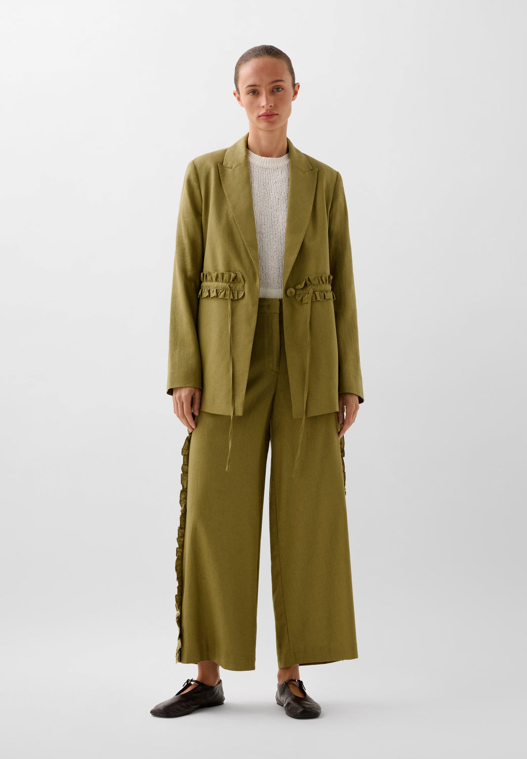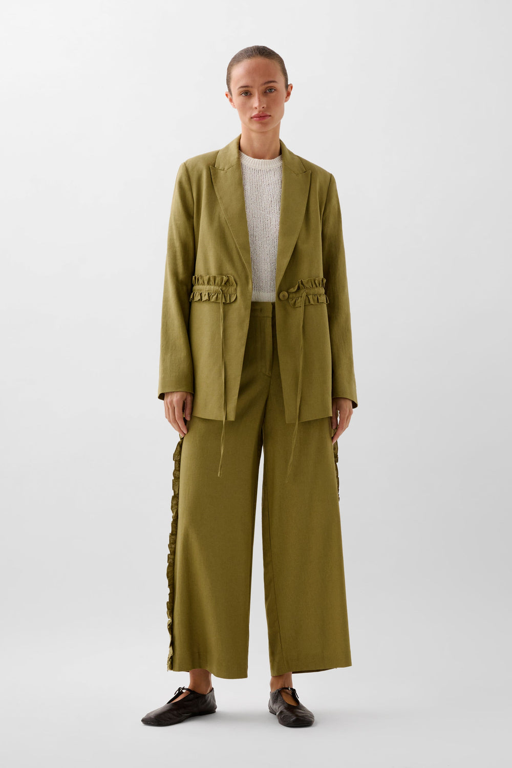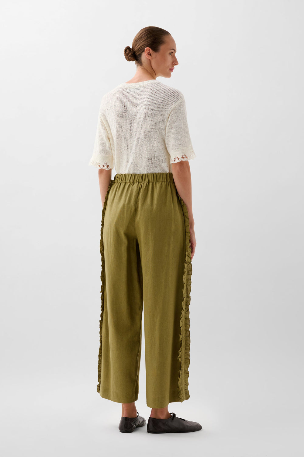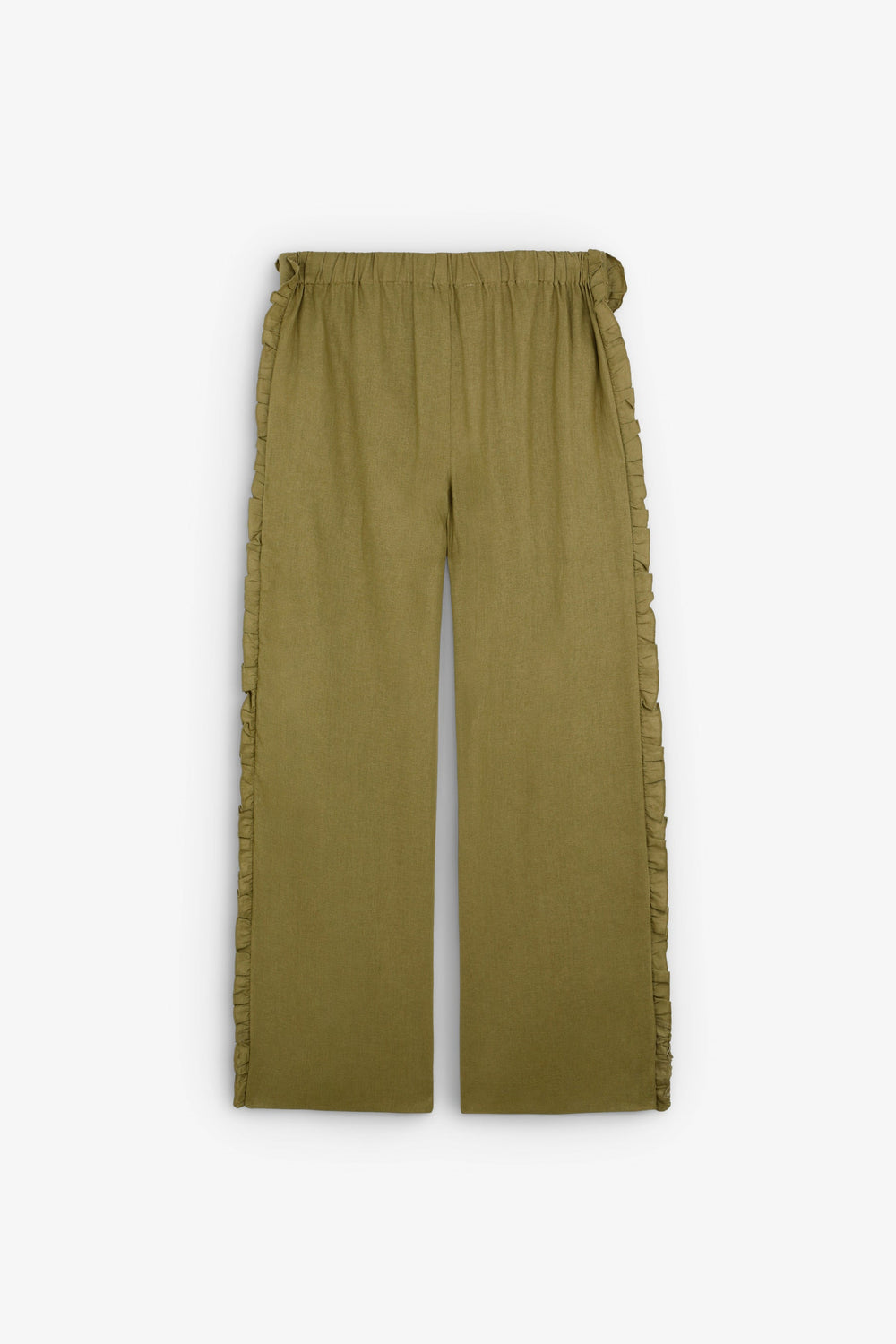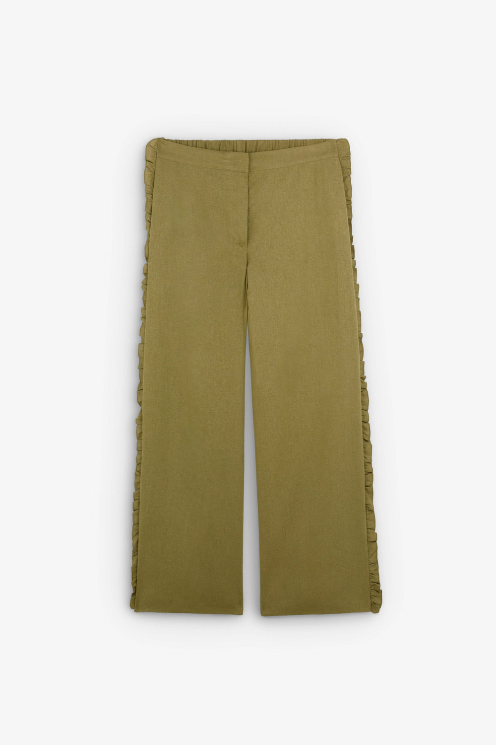 Pantalón confeccionado en Lino. Cierre por cremallera y botón no vistos en frontal. Tiro alto. Wide Leg. Detalle de volantes en lateral.