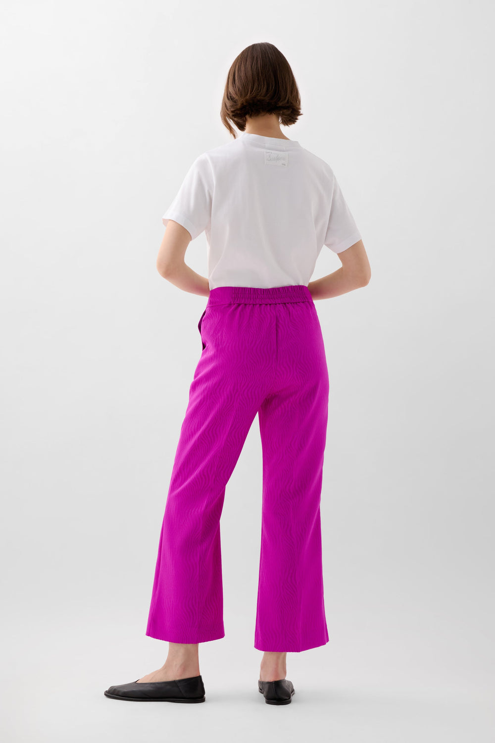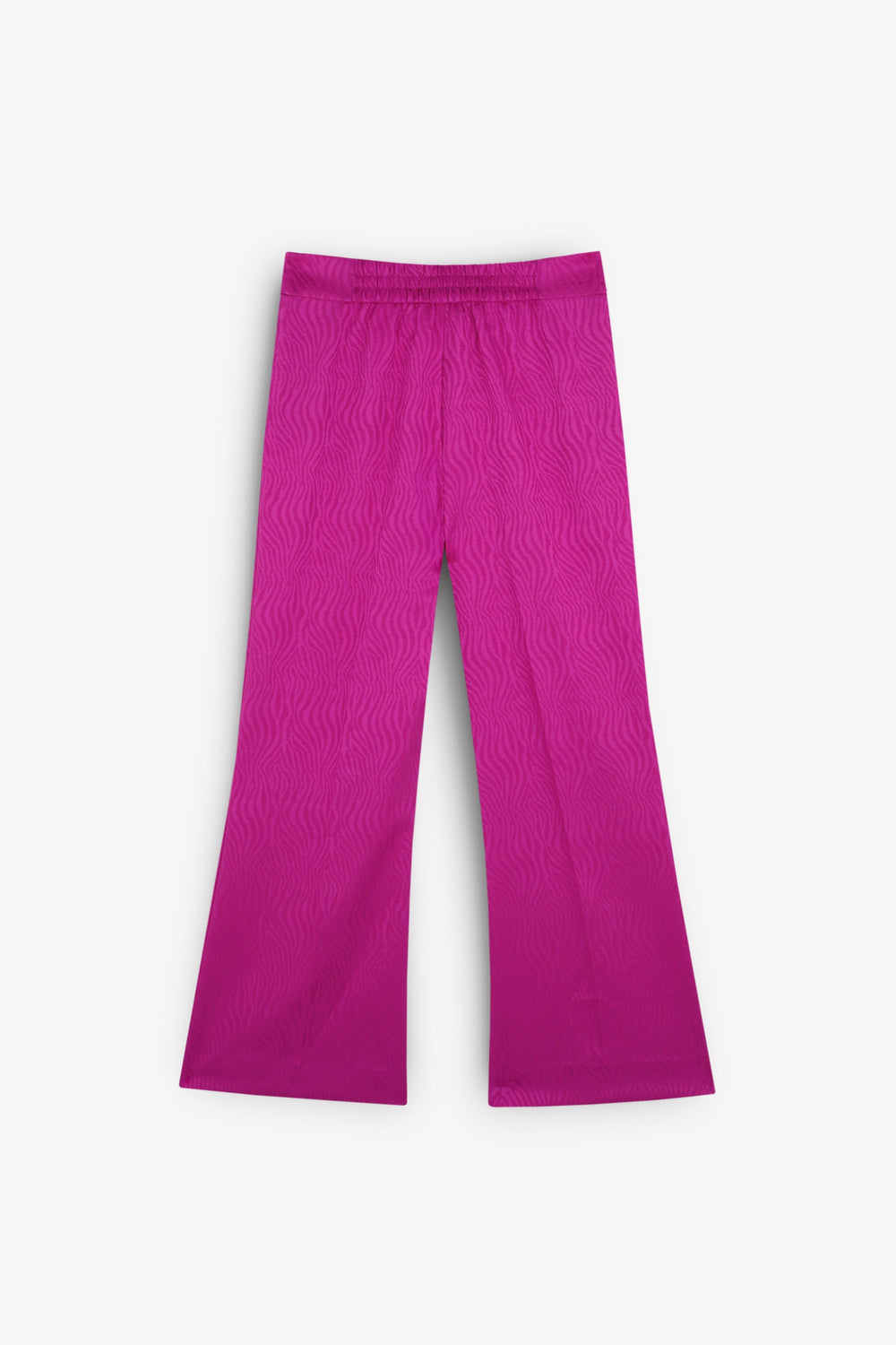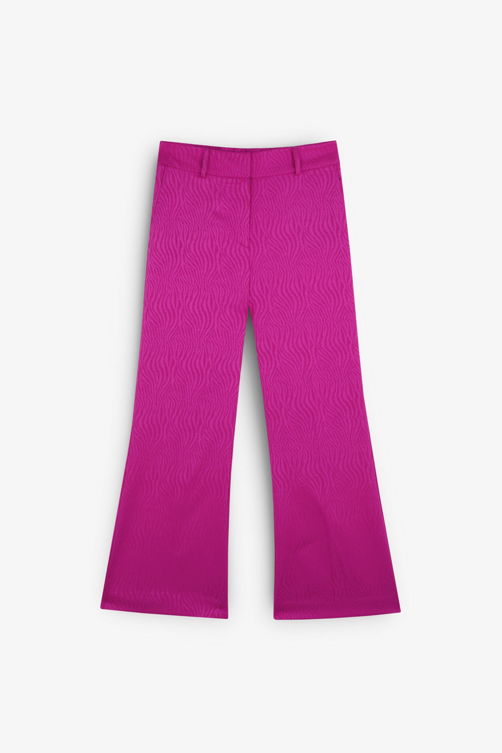 Pantalón confeccionado en tejido fluido con estampado jacquard. Corte flare con cierre de cremallera y enganche. Media cintura elástica con trabillas. Bolsillos inclinados.