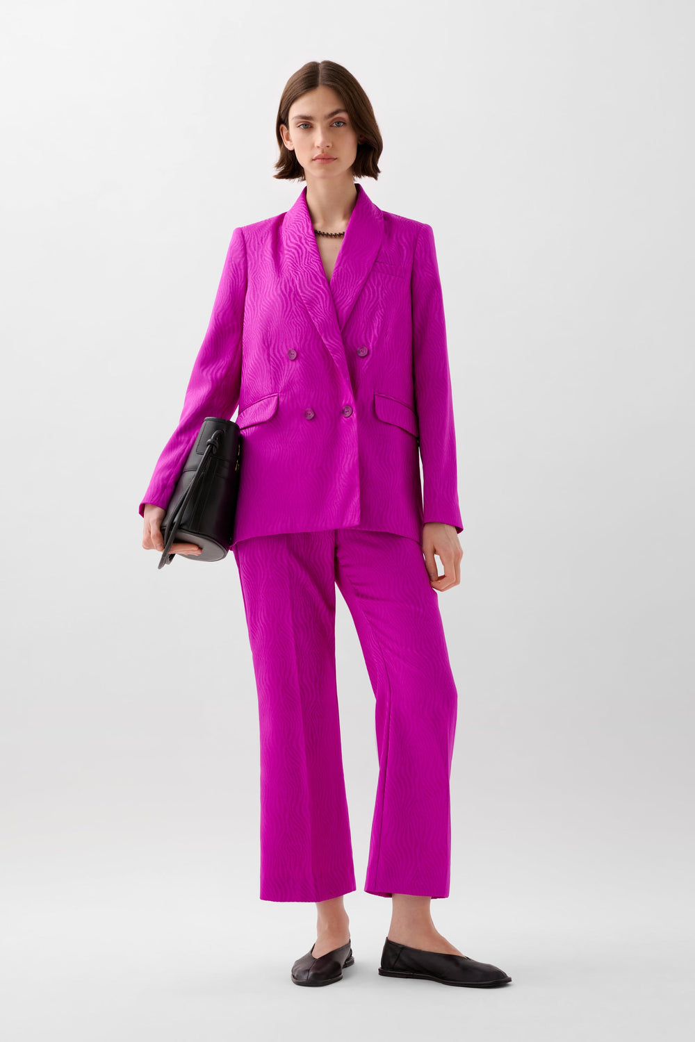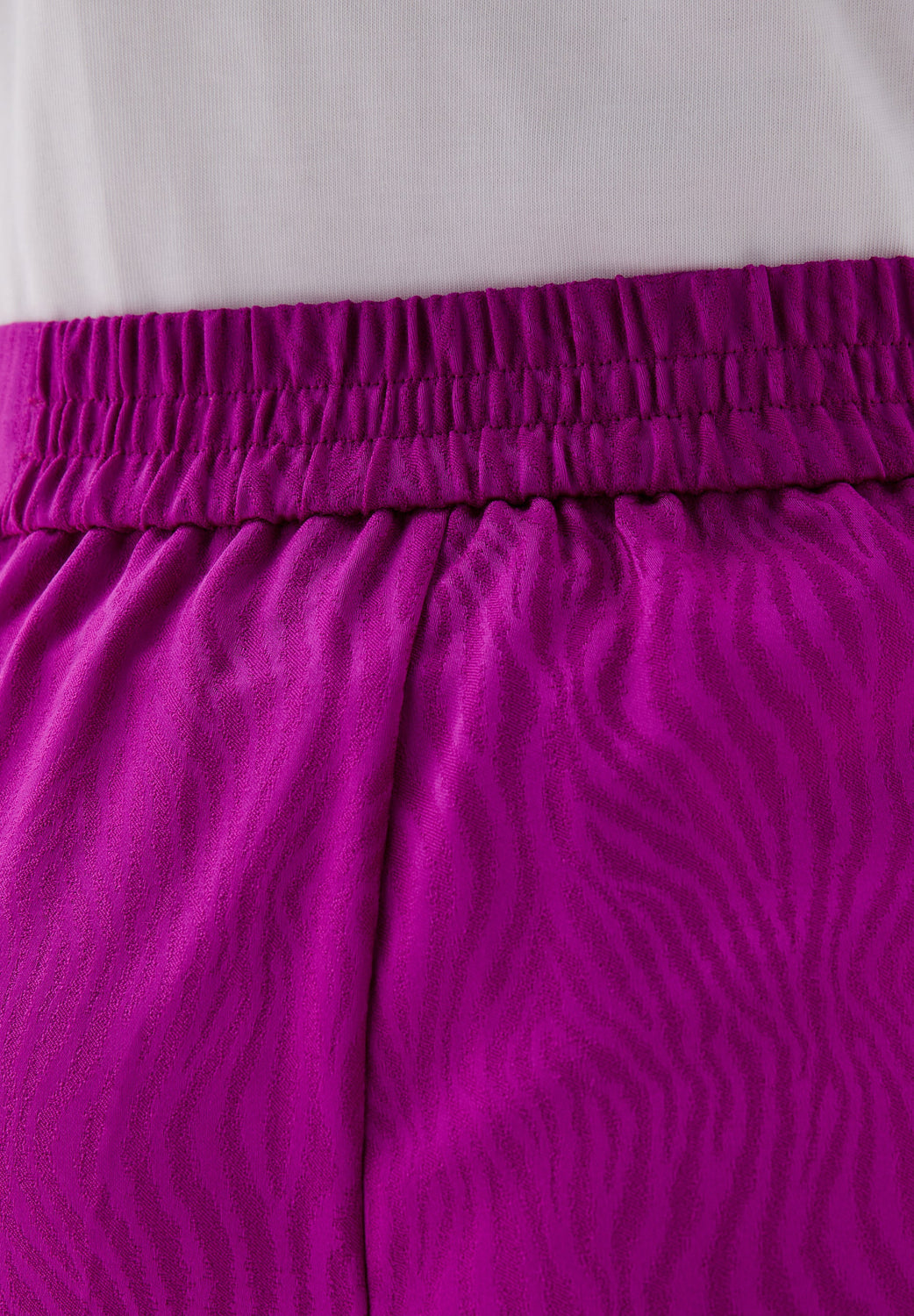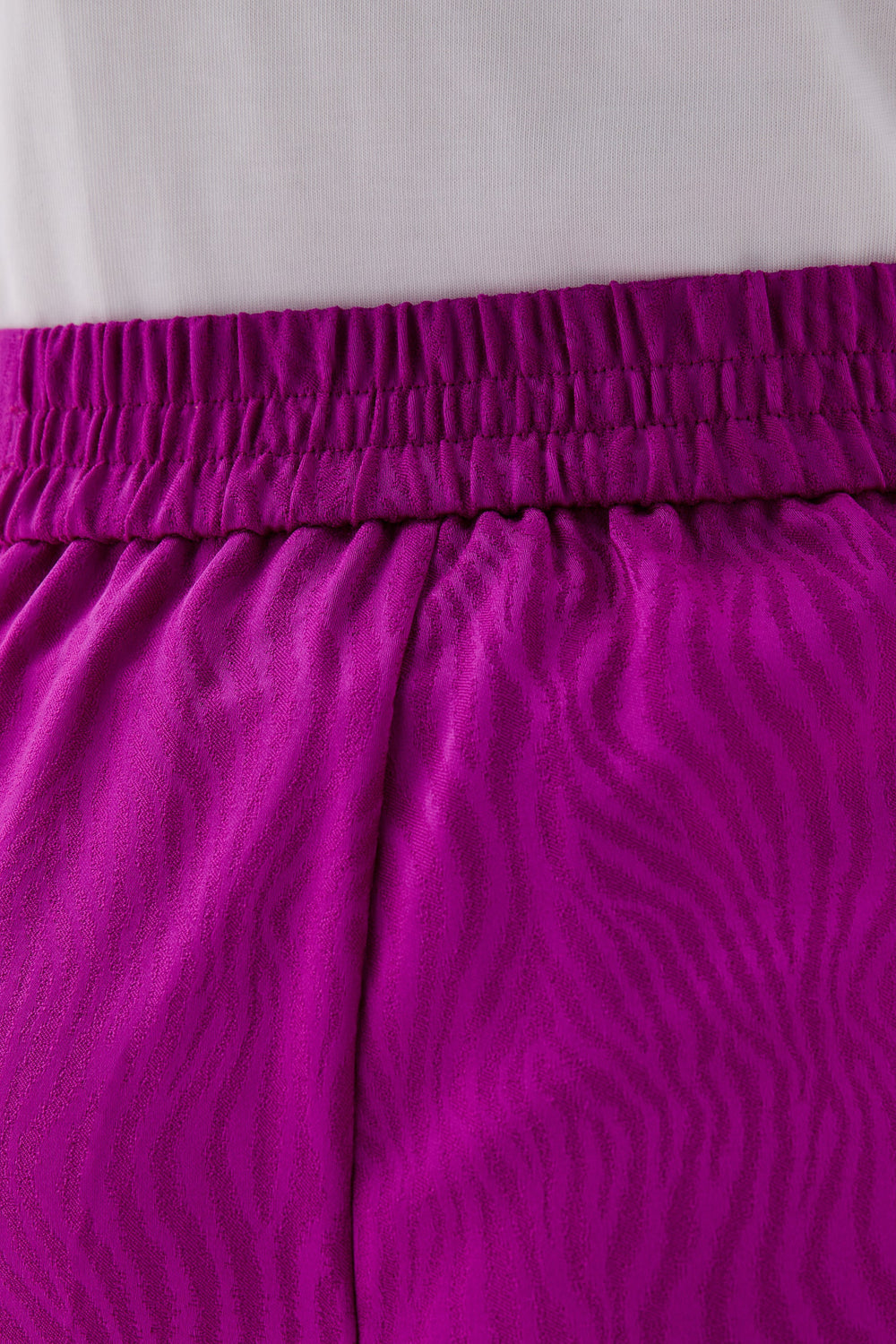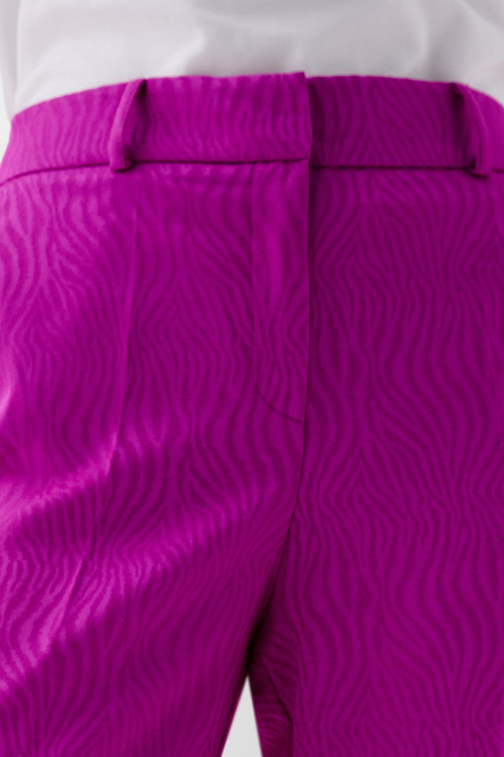 Pantalón confeccionado en tejido fluido con estampado jacquard. Corte flare con cierre de cremallera y enganche. Media cintura elástica con trabillas. Bolsillos inclinados.