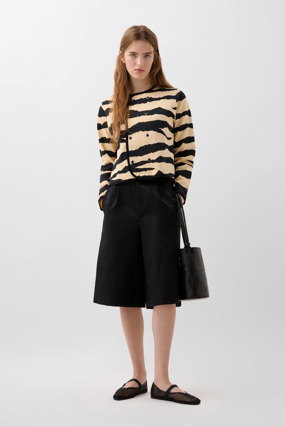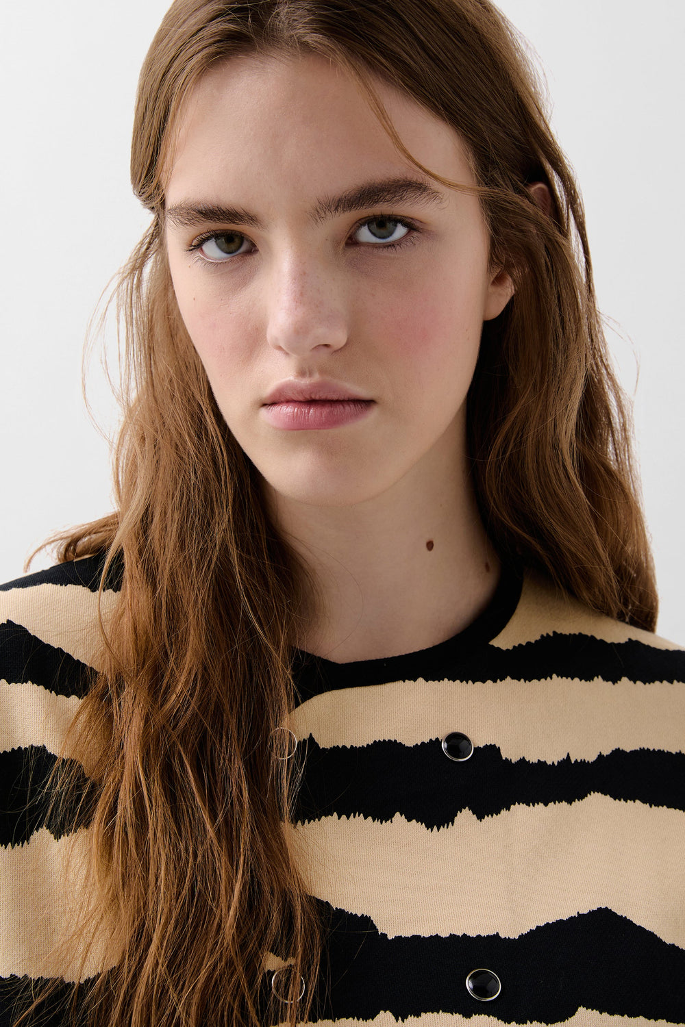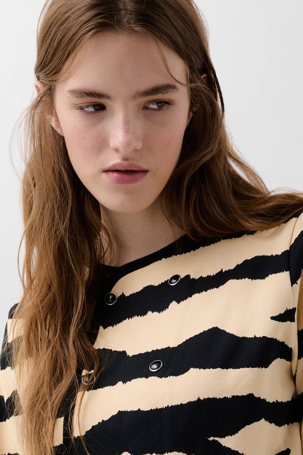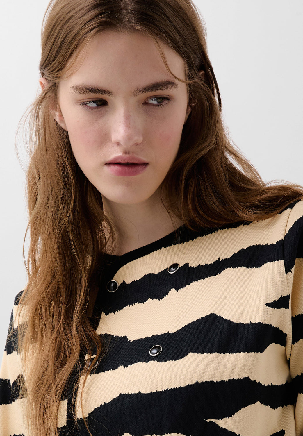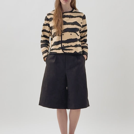 Chaqueta de cebra confeccionada en 100% algodón. Regular fit, cuello redondo y cierre con botones de snaps. Manga larga.