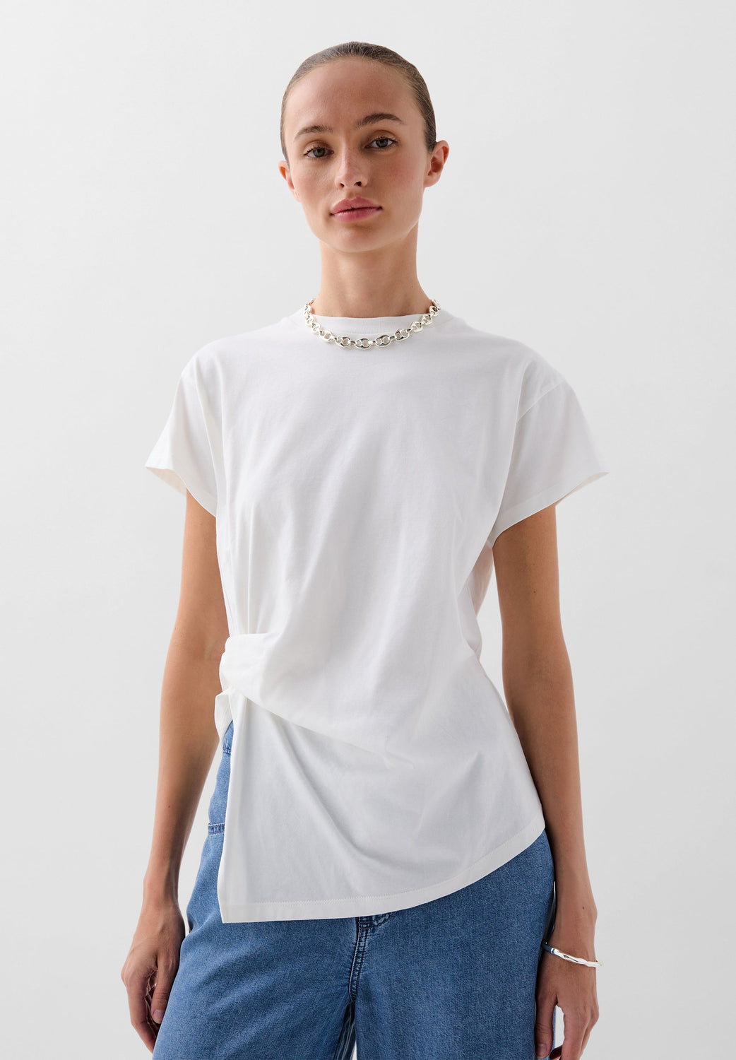Camiseta confeccionada en 100% algodón. Regular fit, cuello redondo y manga corta. Detalle de nudo lateral.