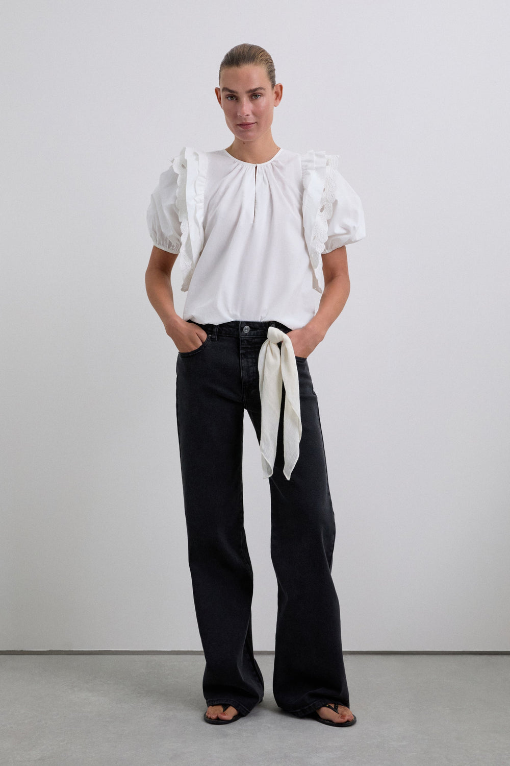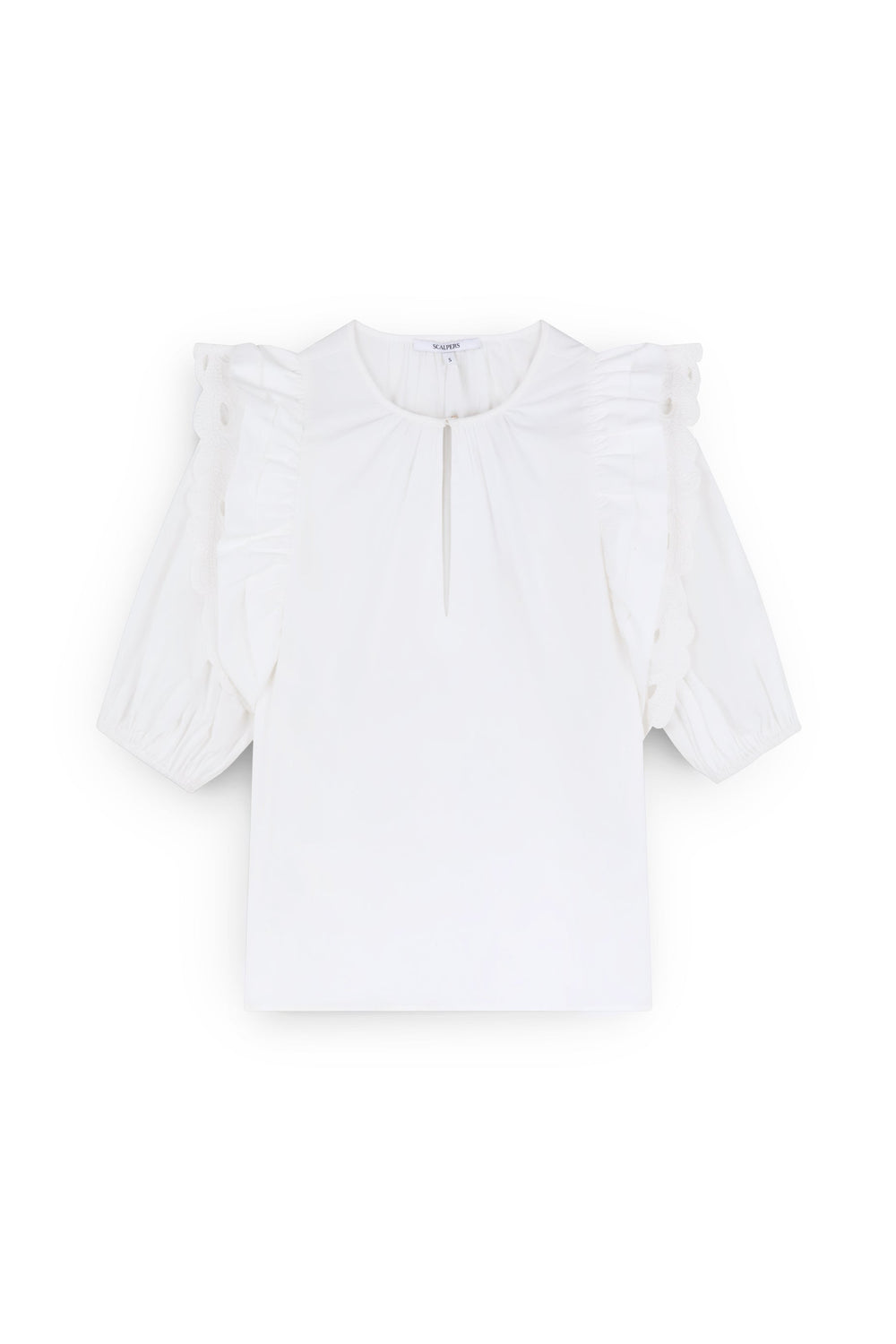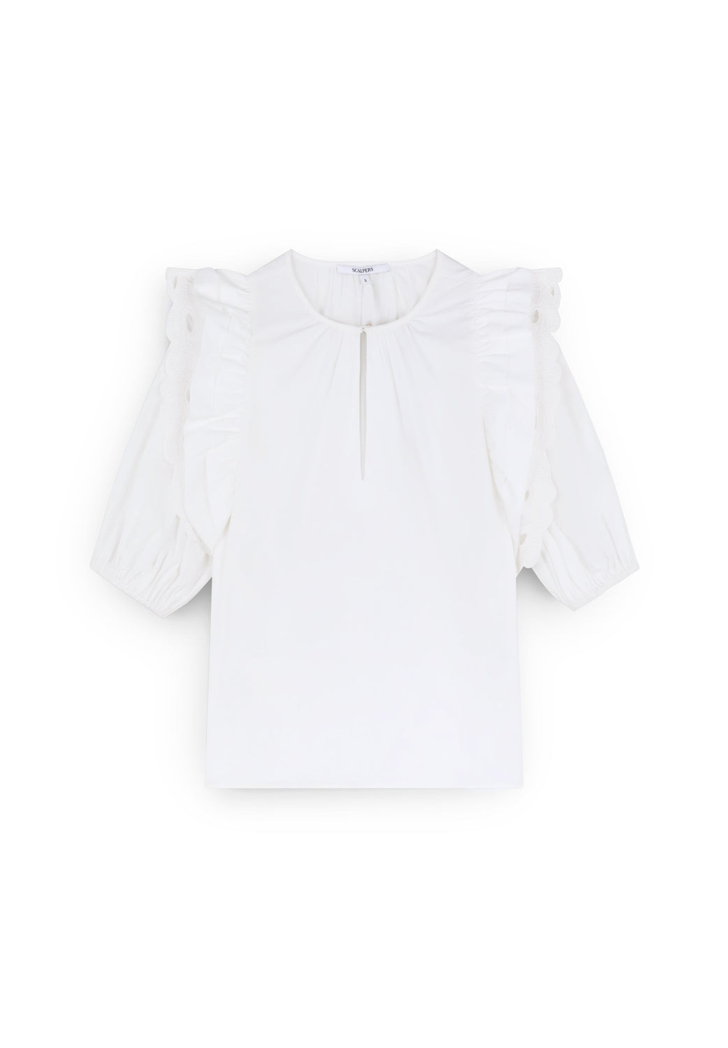 Top confeccionado en 100% algodón. Corte regular fit, cuello redondo y manga corta abullonada con terminación elástica. Detalles de bordados y volantes en manga.