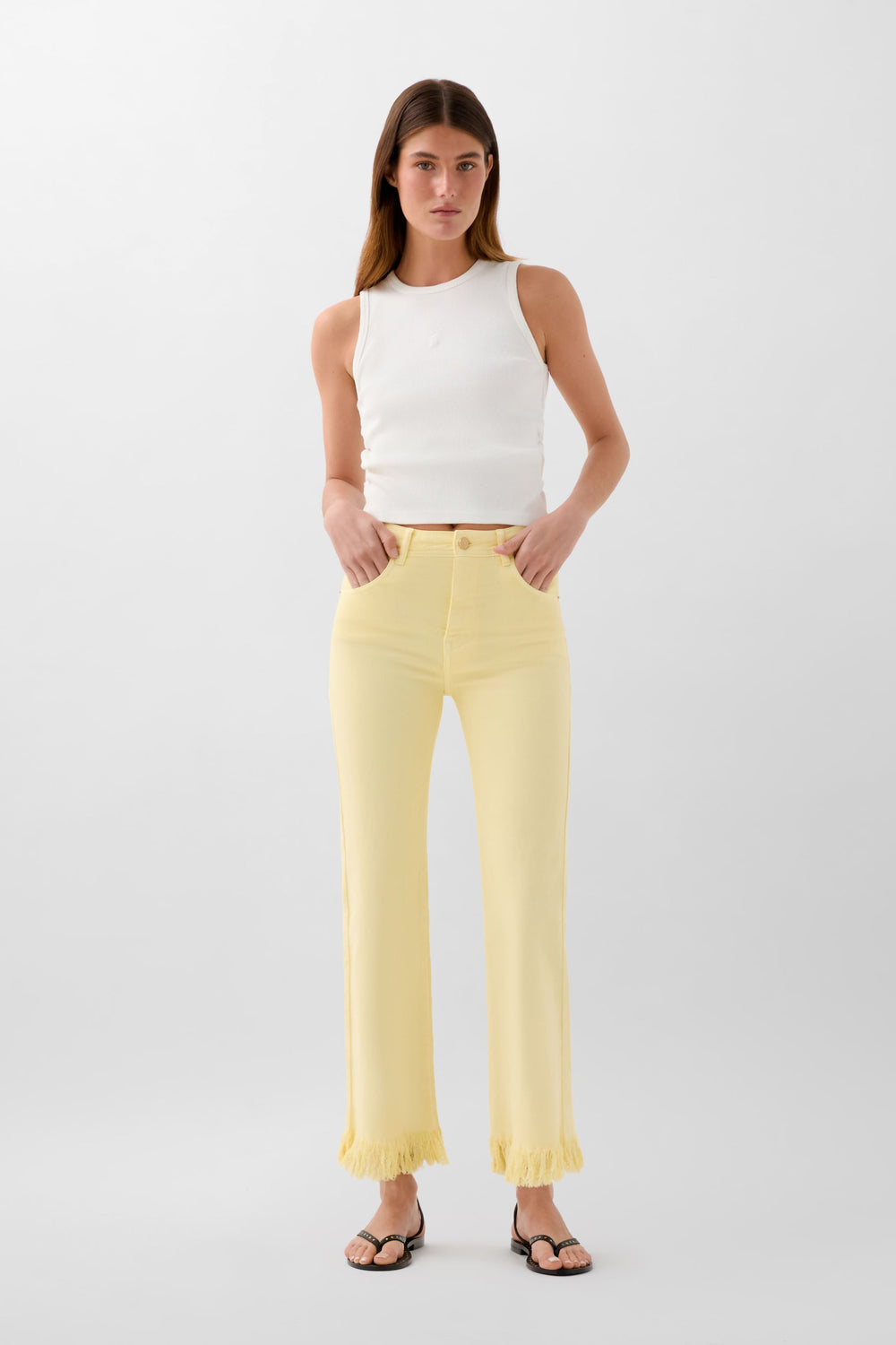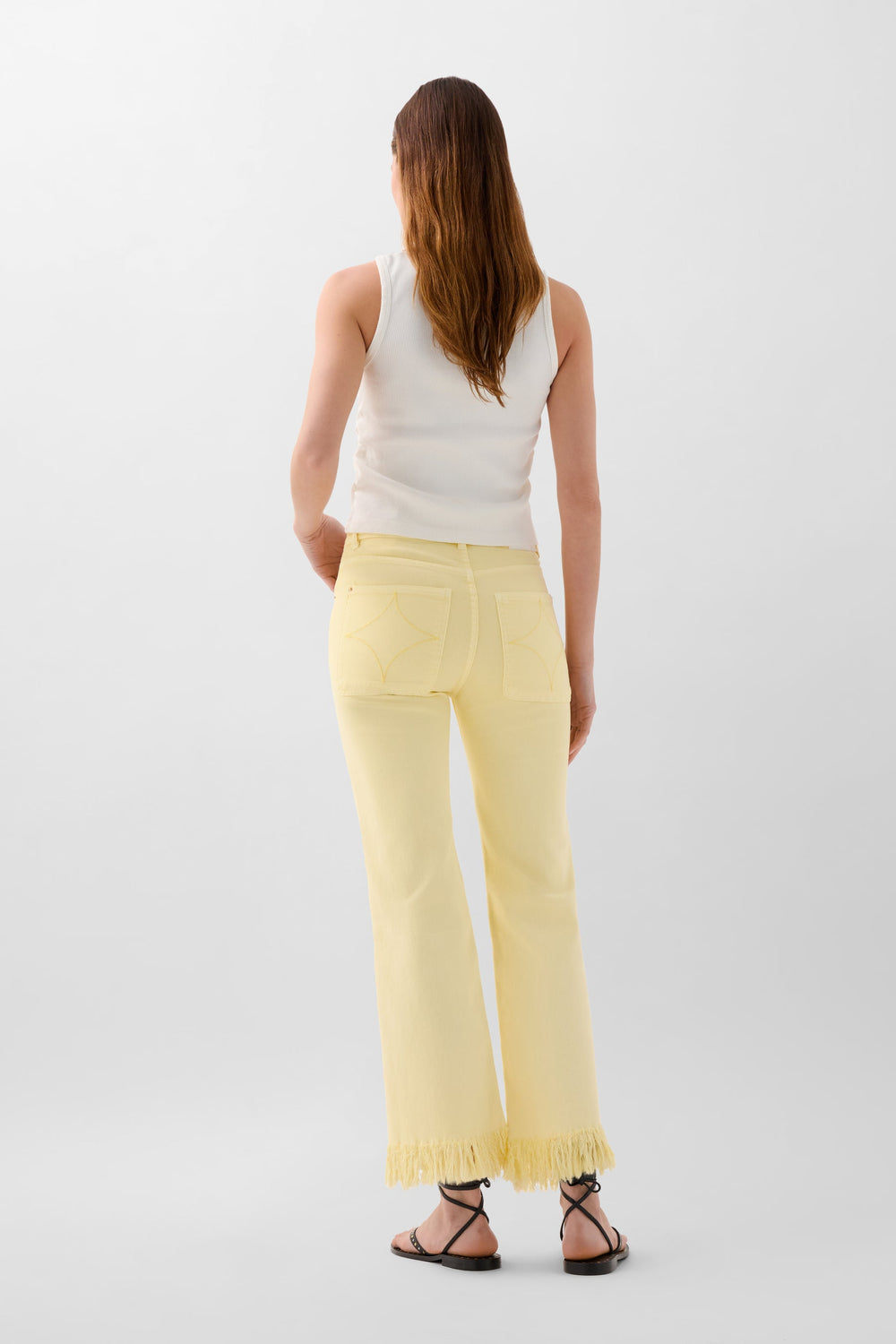 Pantalón vaquero confeccionado en 100% Algodón Orgánico BCI. Dos bolsillos en frontal. Dos bolsillos posteriores con detalle bordado. Motivo desflecado en bajos. Cierre mediante botón y cremallera.