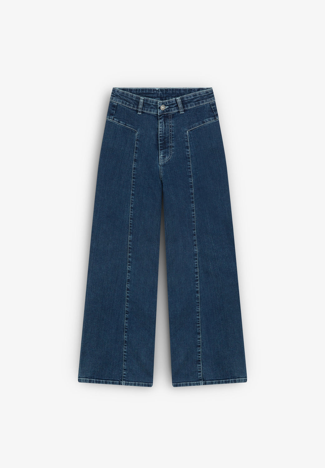 Jeans confeccionados en algodón ligeramente elástico. Corte culotte con tiro alto, cierre con botón y cremallera y trabillas en cintura. Detalle de costuras marcadas.