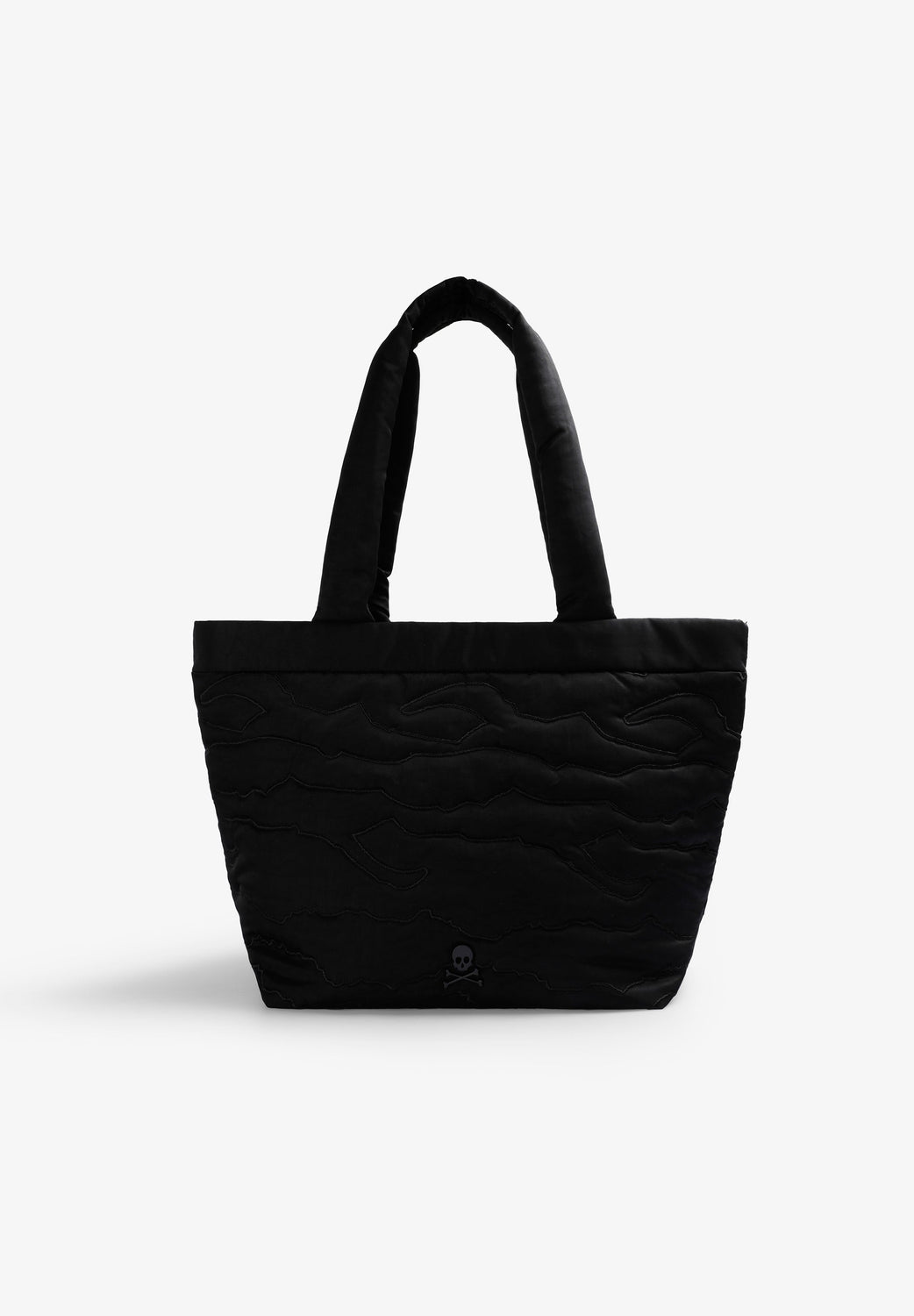 Bolso shopper acolchado confeccionado en nylon. Doble asa y cierre con snaps. Parche de calavera.