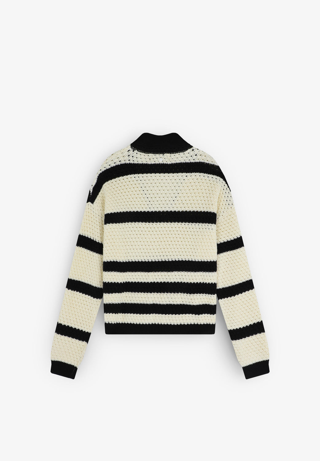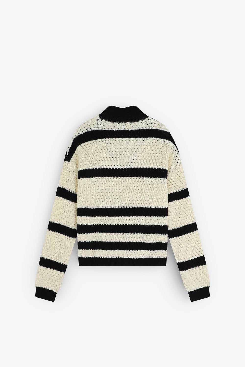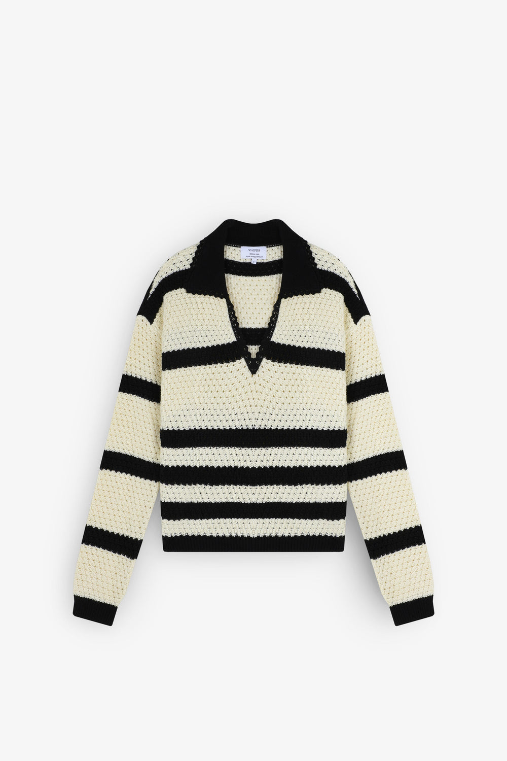 Jersey confeccionado en punto de crochet. Estampado de rayas, cuello polo, escote ligeramente en V y manga larga.