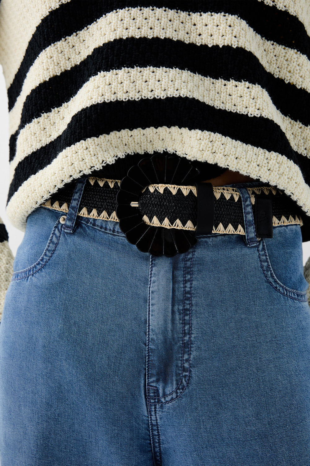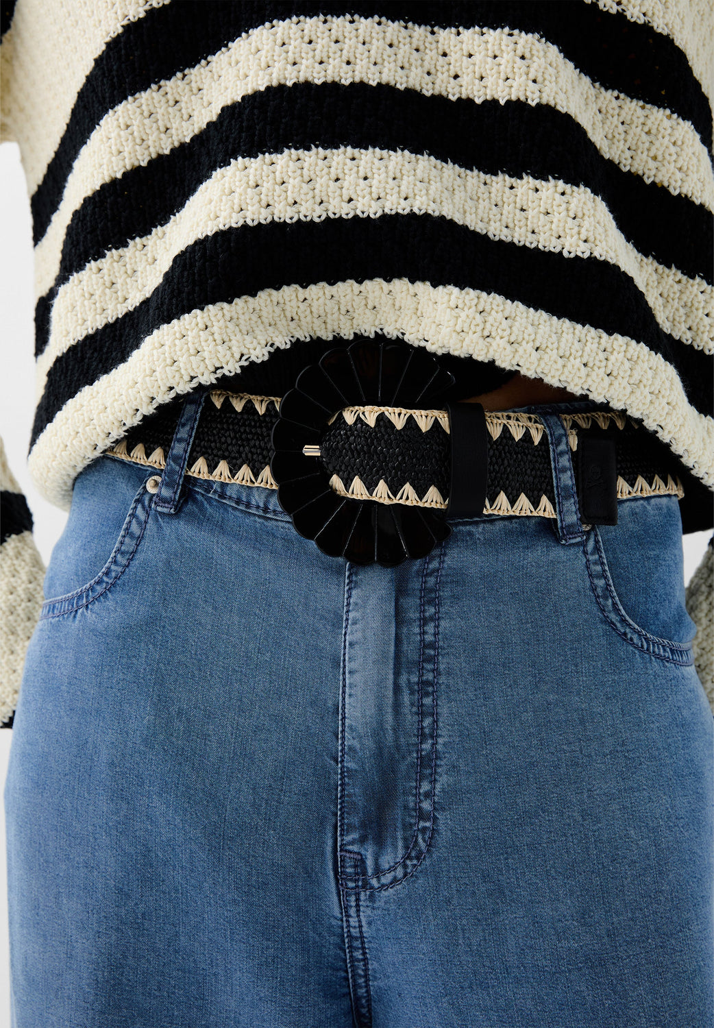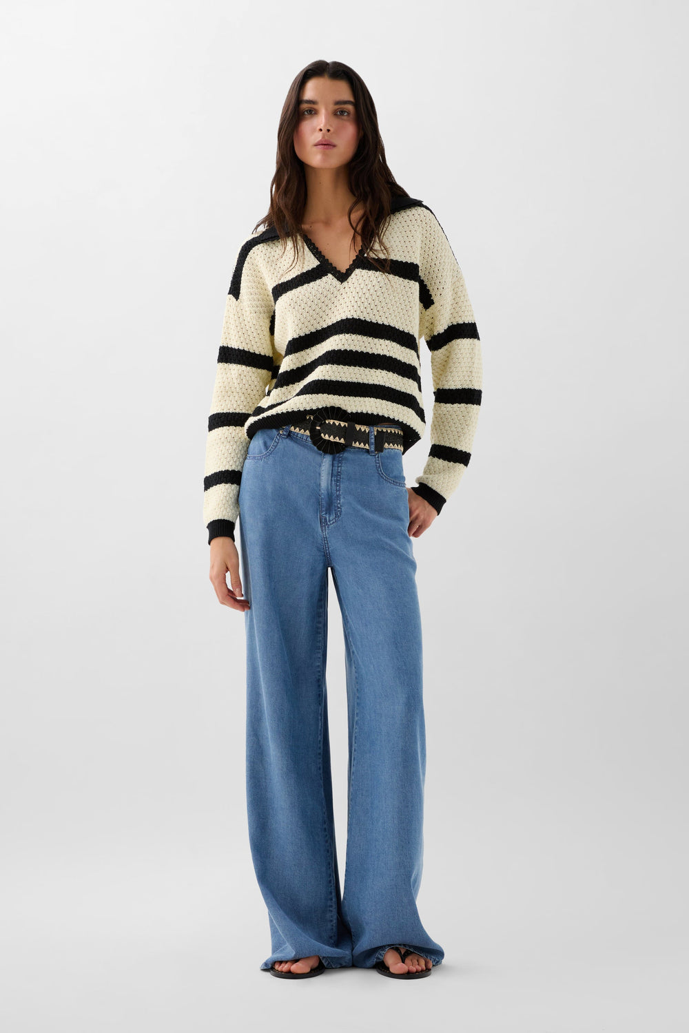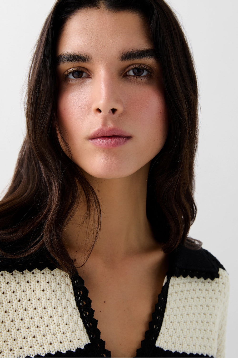 Jersey confeccionado en punto de crochet. Estampado de rayas, cuello polo, escote ligeramente en V y manga larga.