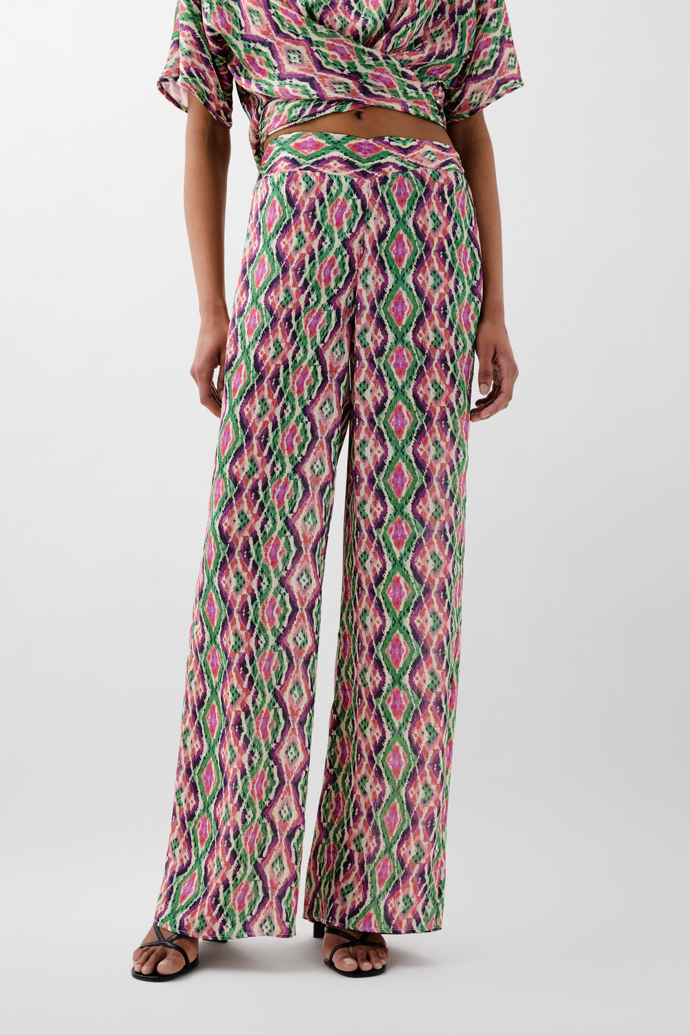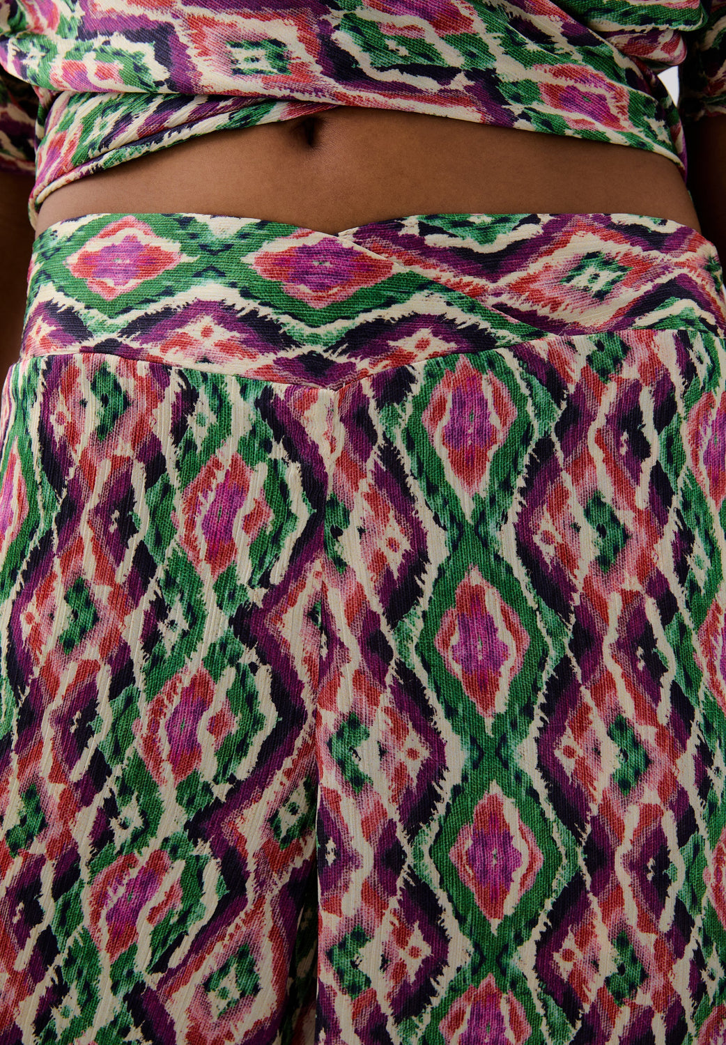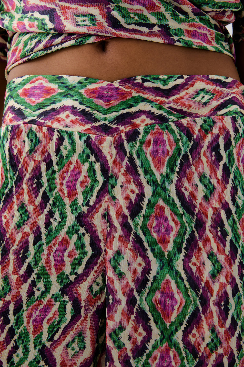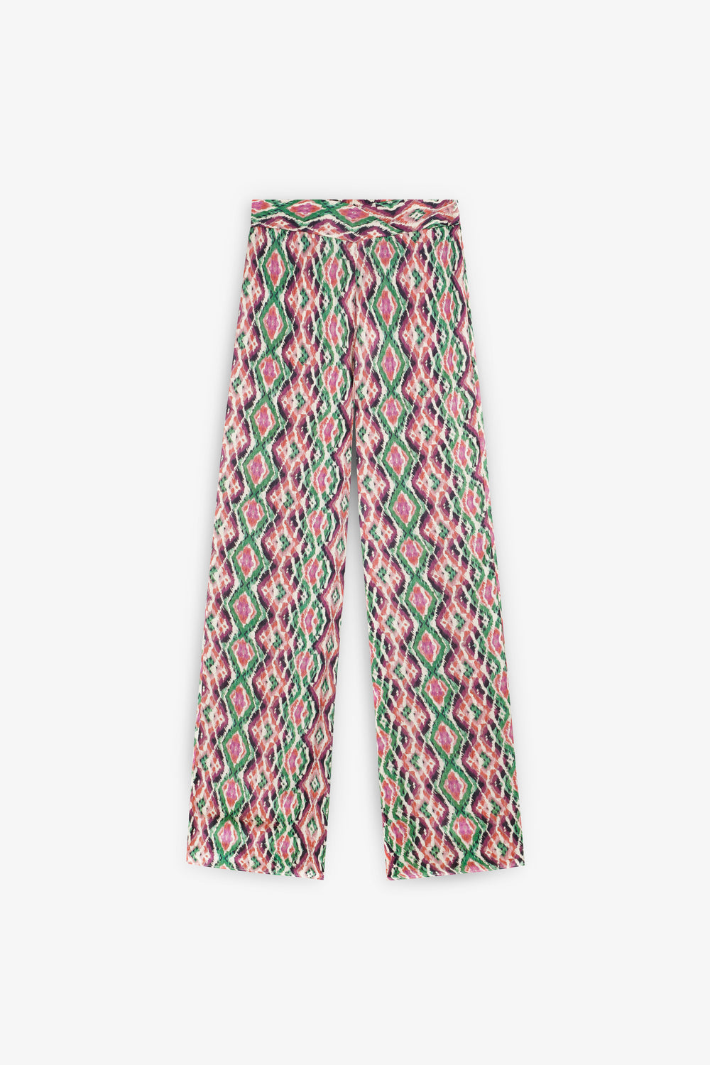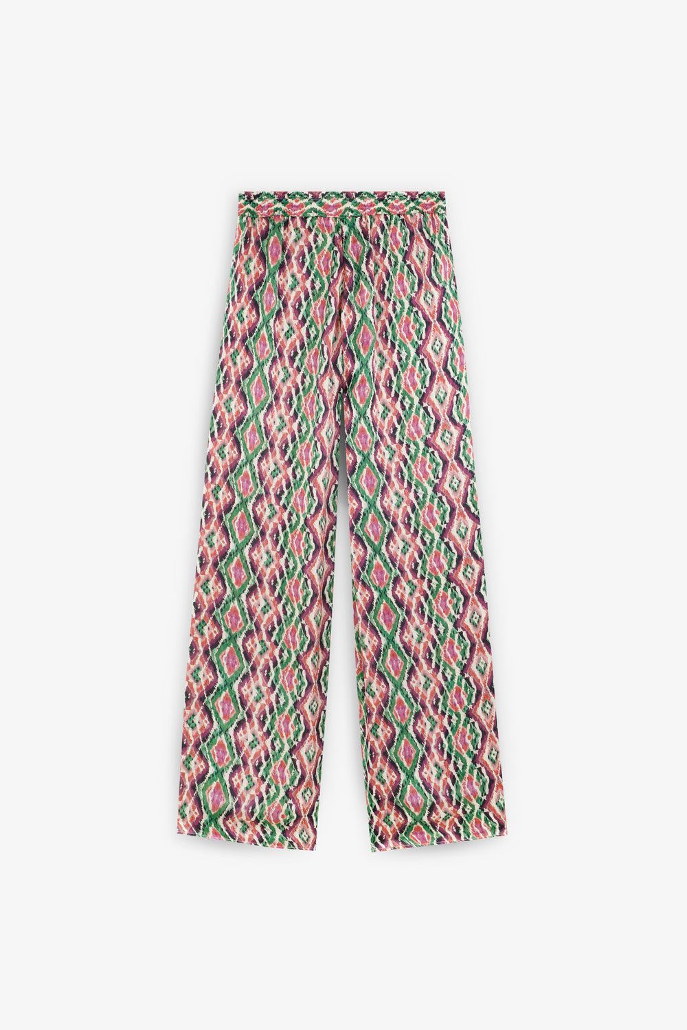 Pantalón confeccionado en tejido fluido con estampado de rombos. Corte full length, regular fit, con cierre de cremallera lateral oculta. Elástico en parte trasera de cintura. Bolsillos delanteros inclinados.
