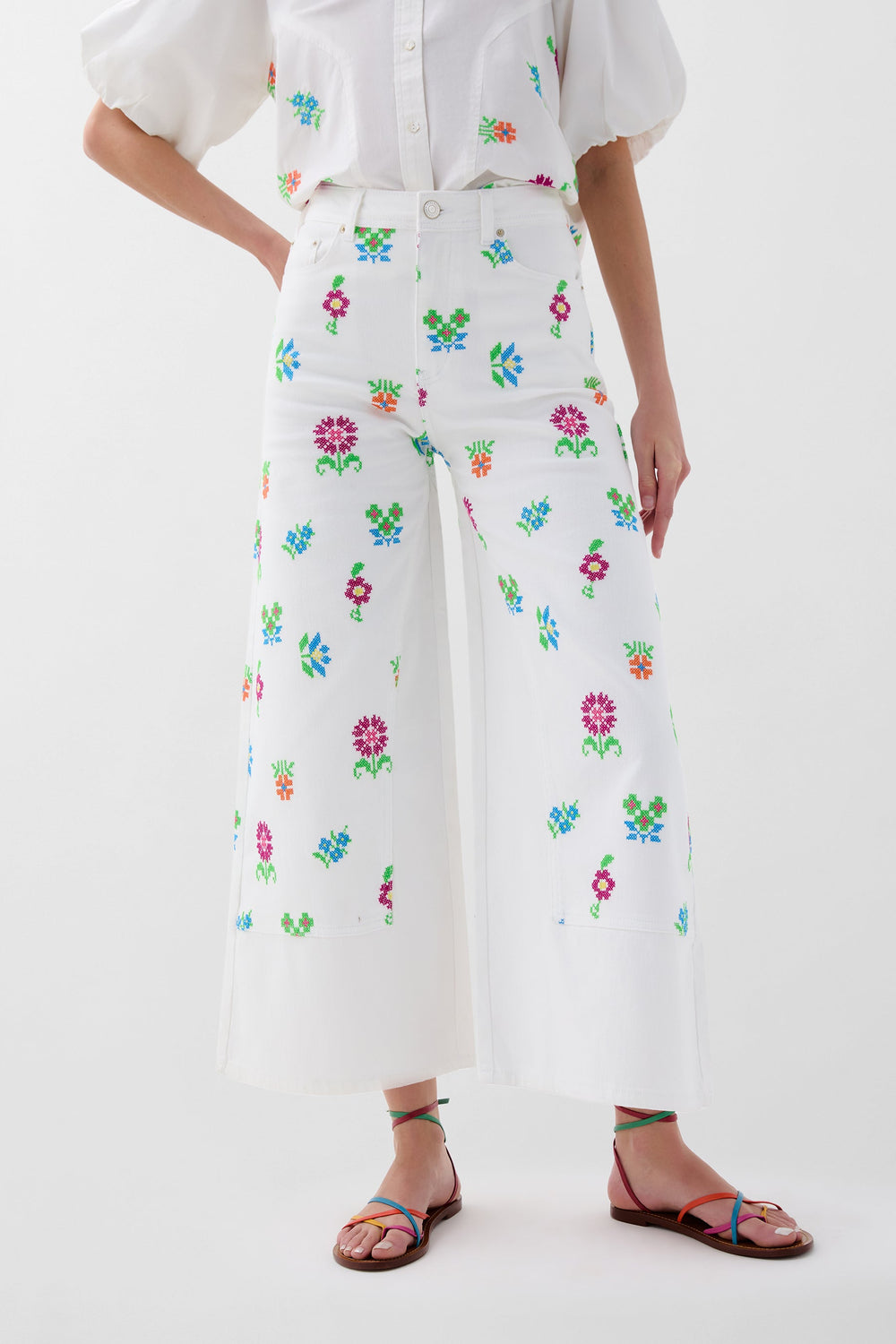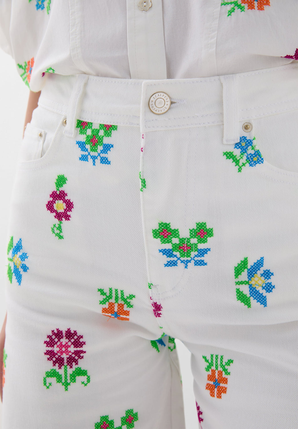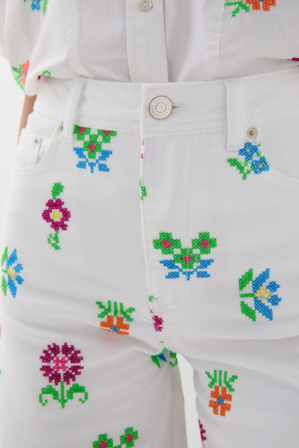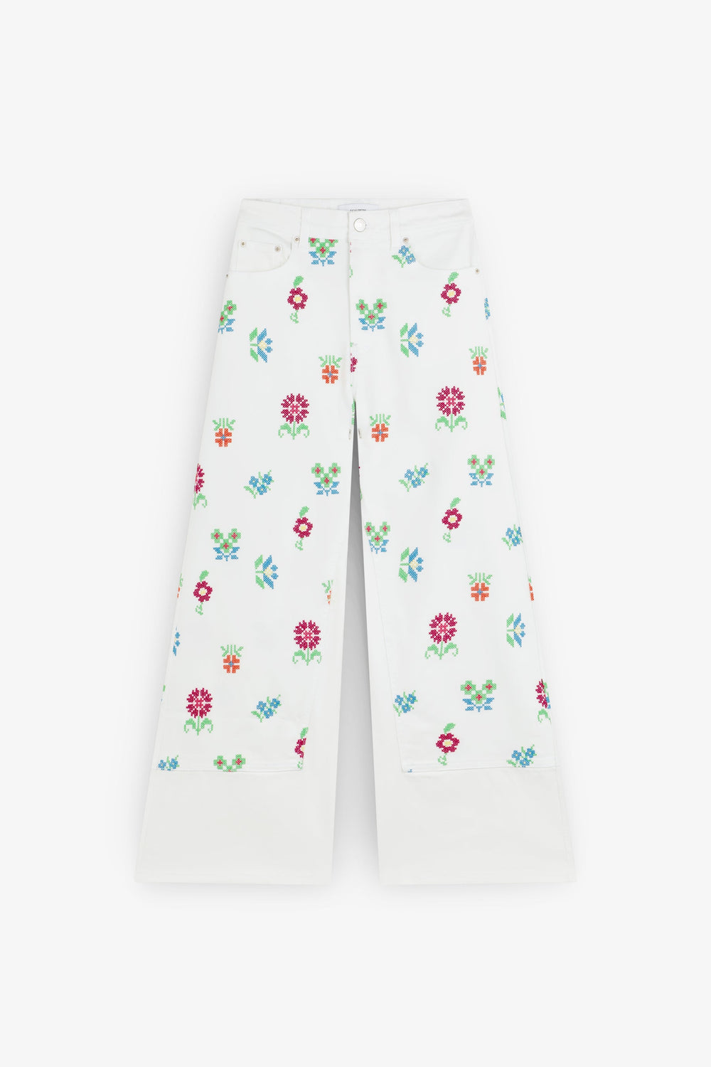 Pantalón denim culotte con bordados de flores. Corte regular fit, tiro alto. Cierre con cremallera y botón. Bolsillos delanteros inclinados y traseros de parche. Trabillas en cintura.