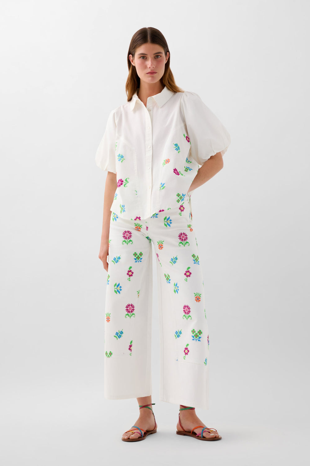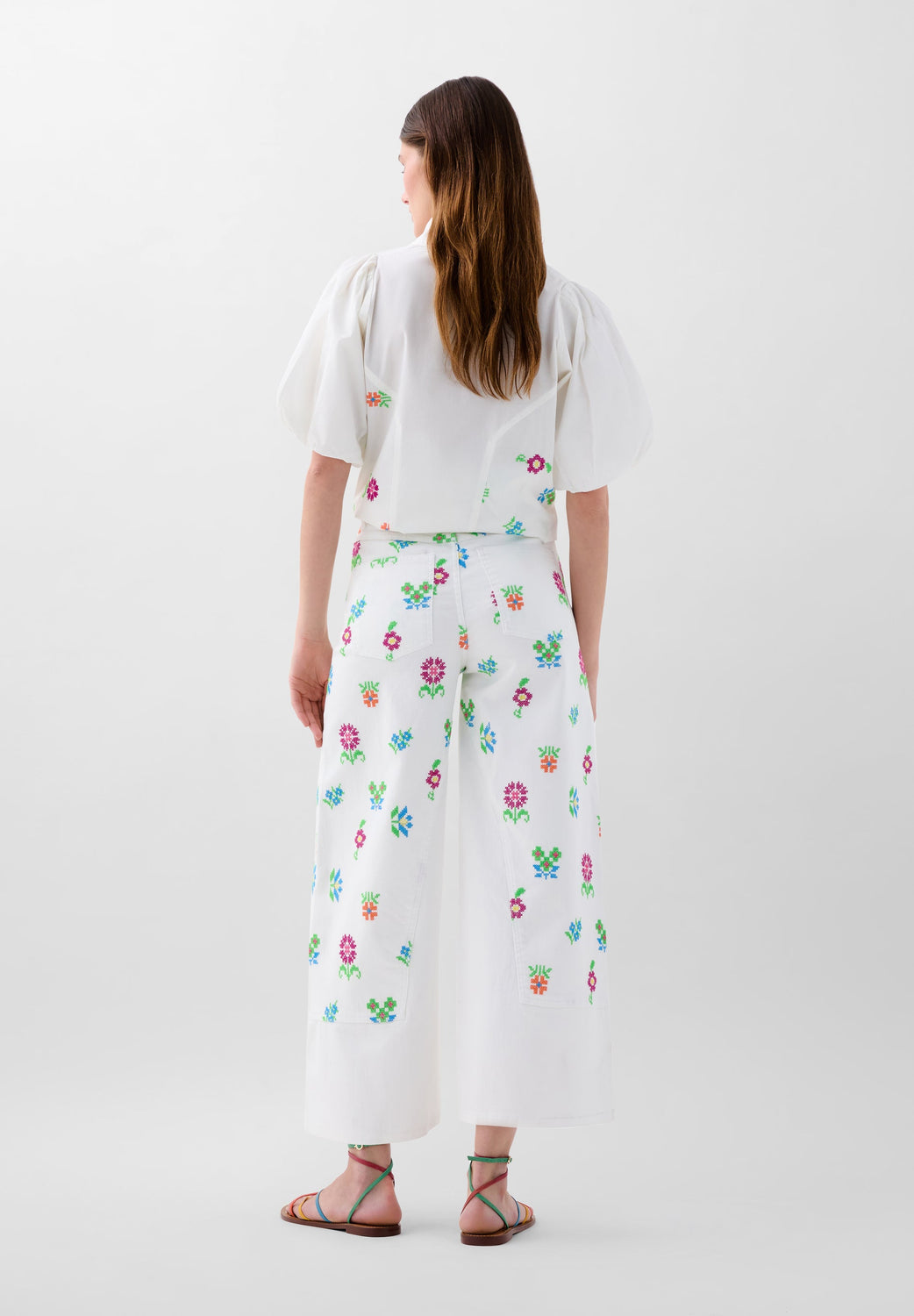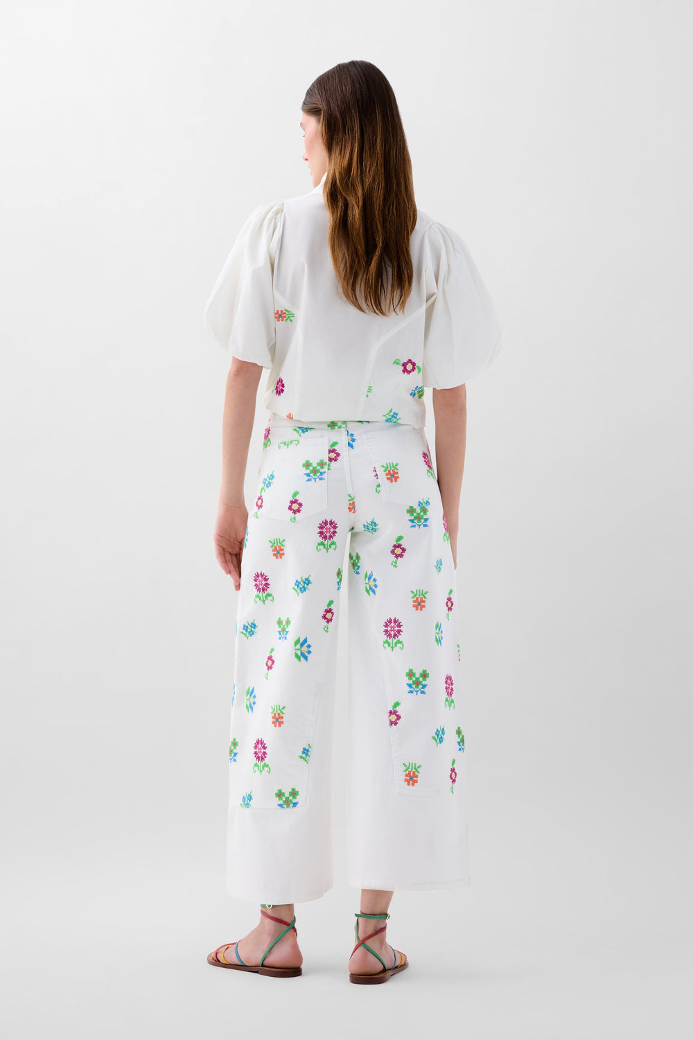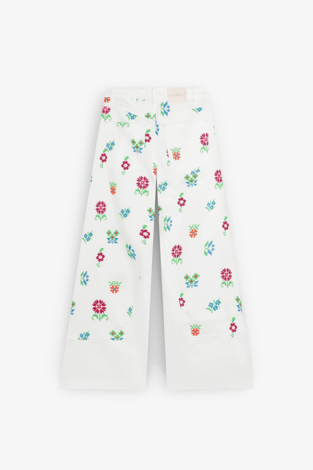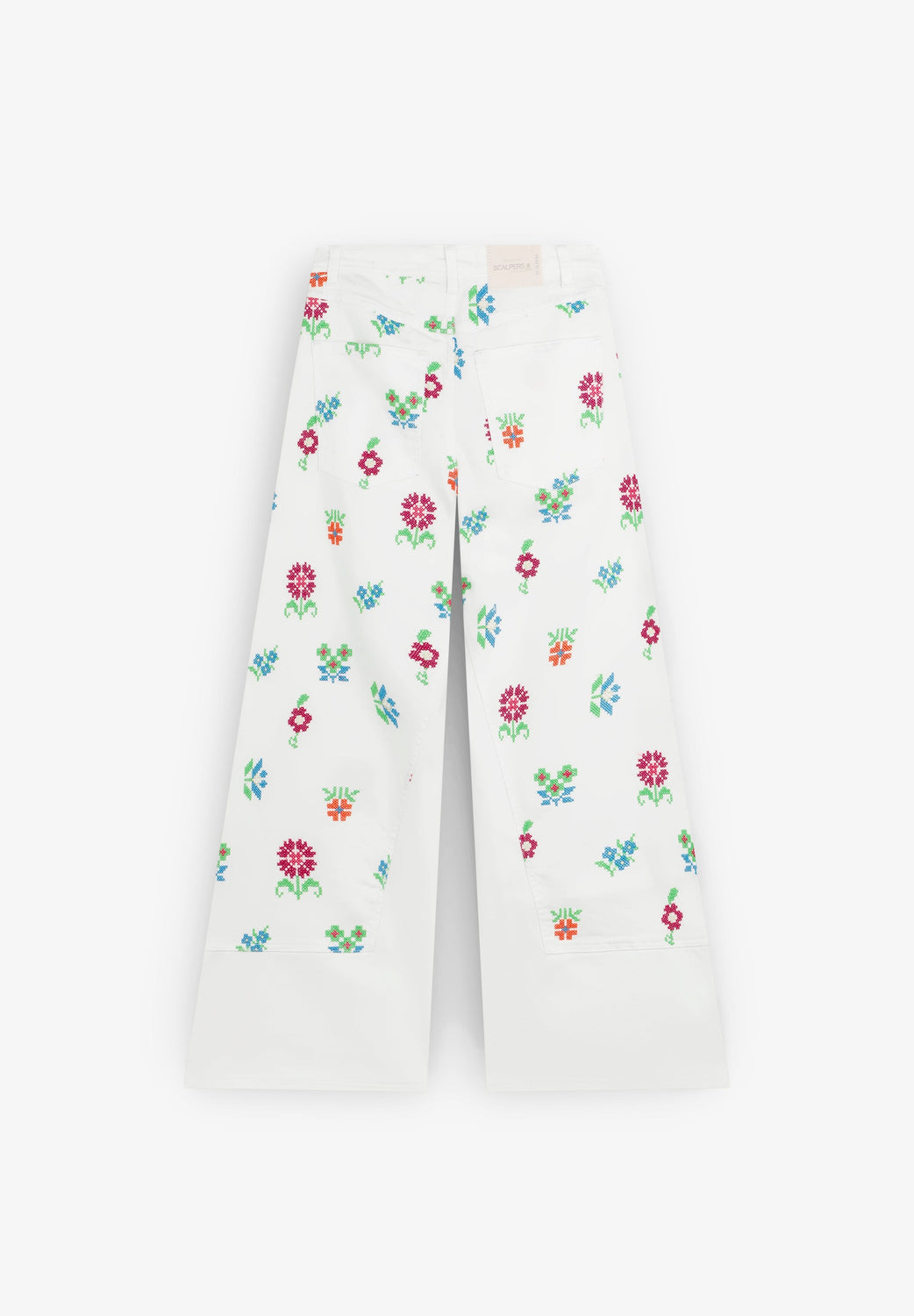 Pantalón denim culotte con bordados de flores. Corte regular fit, tiro alto. Cierre con cremallera y botón. Bolsillos delanteros inclinados y traseros de parche. Trabillas en cintura.