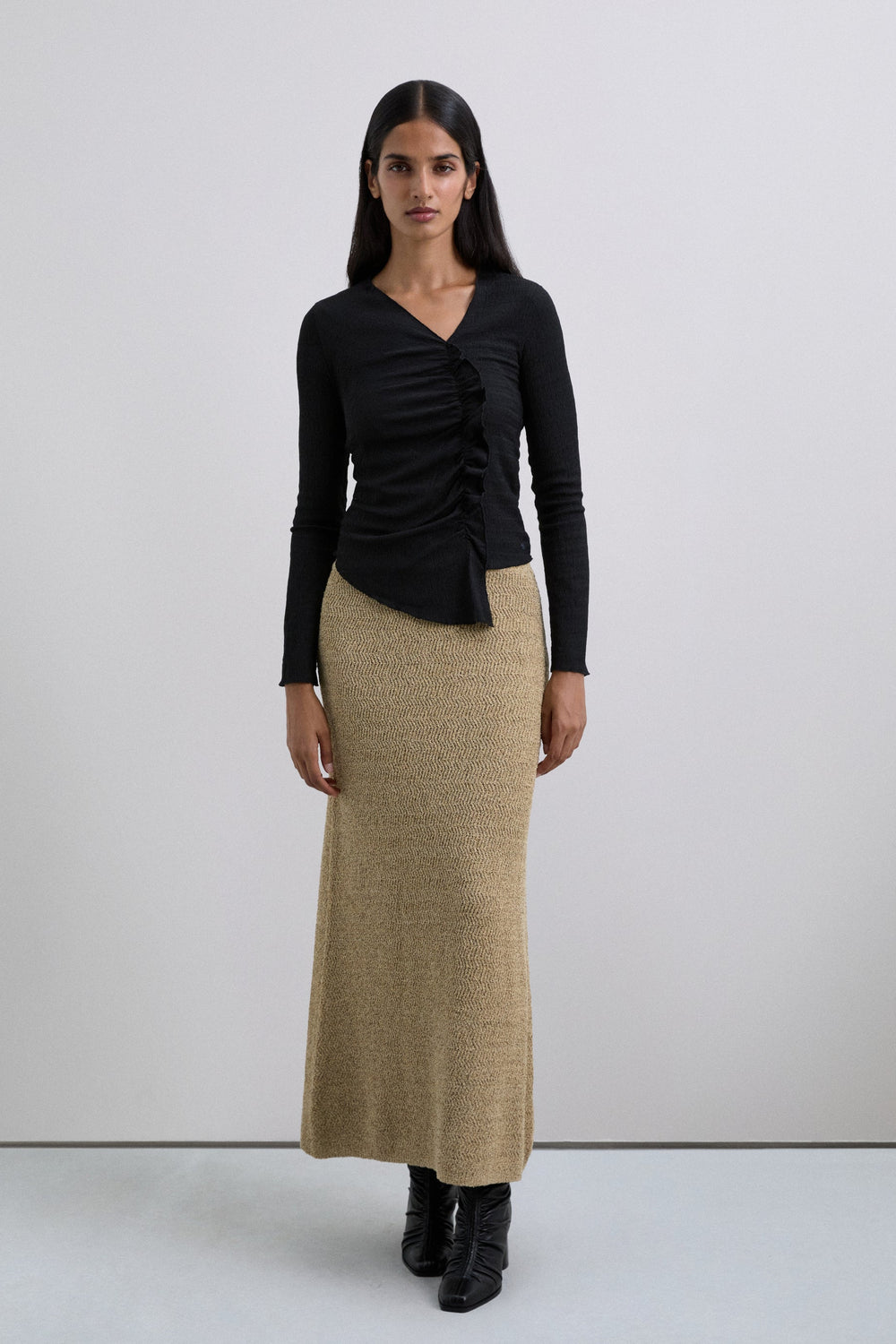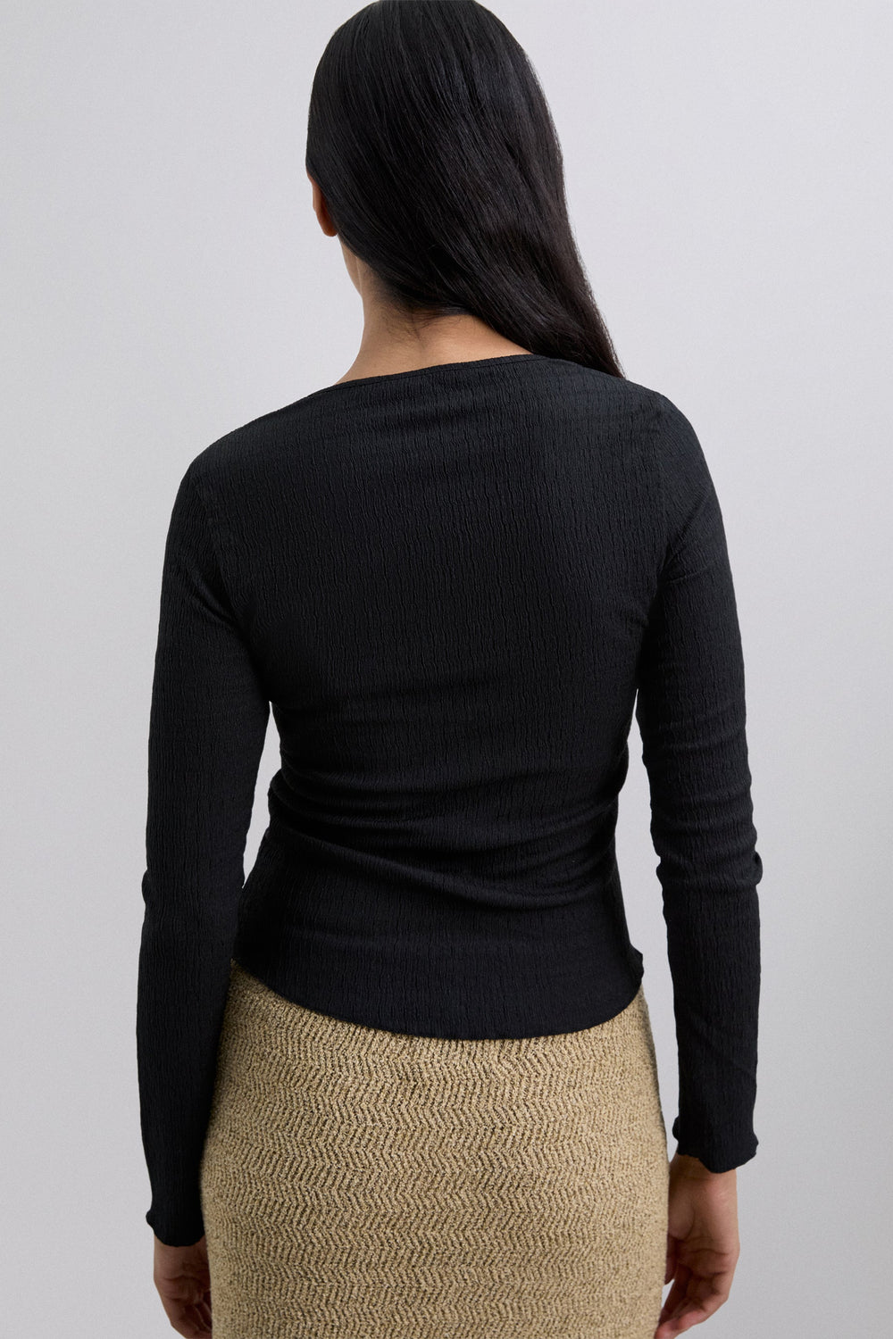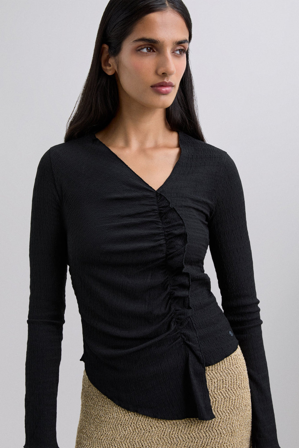 Top acabado textura de escote asimétrico en pico con volantes y manga larga.