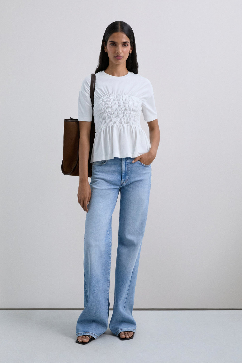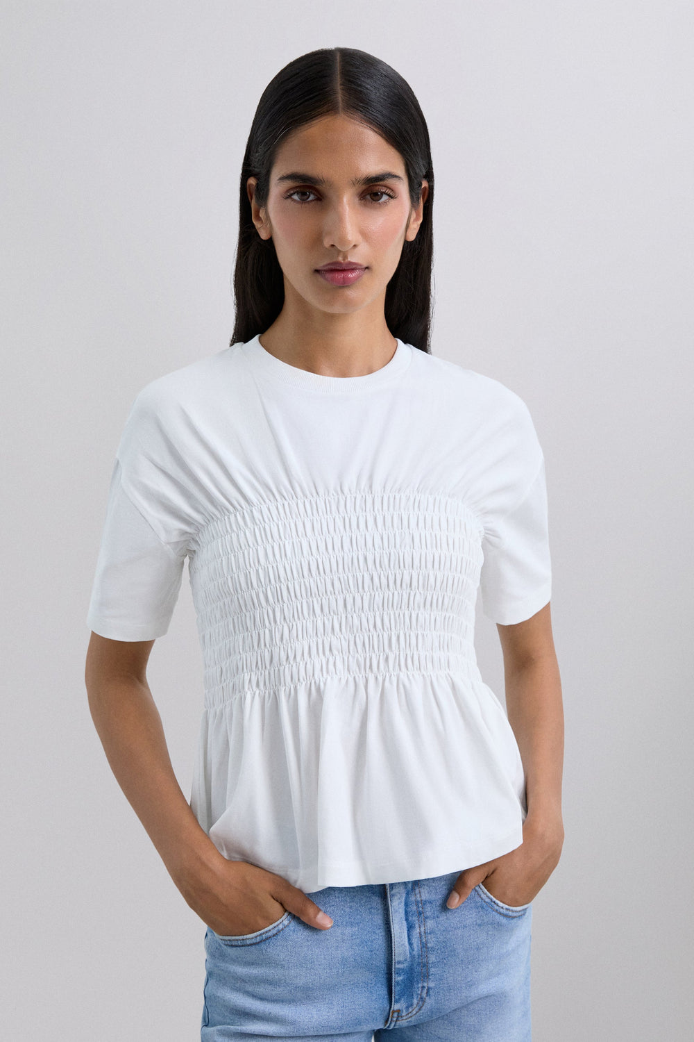 Camiseta de manga corta confeccionada en mezcla de algodón con volantes en las mangas. Cuello redondo. Volantes en la parte inferior. Fruncido en la parte frontal.