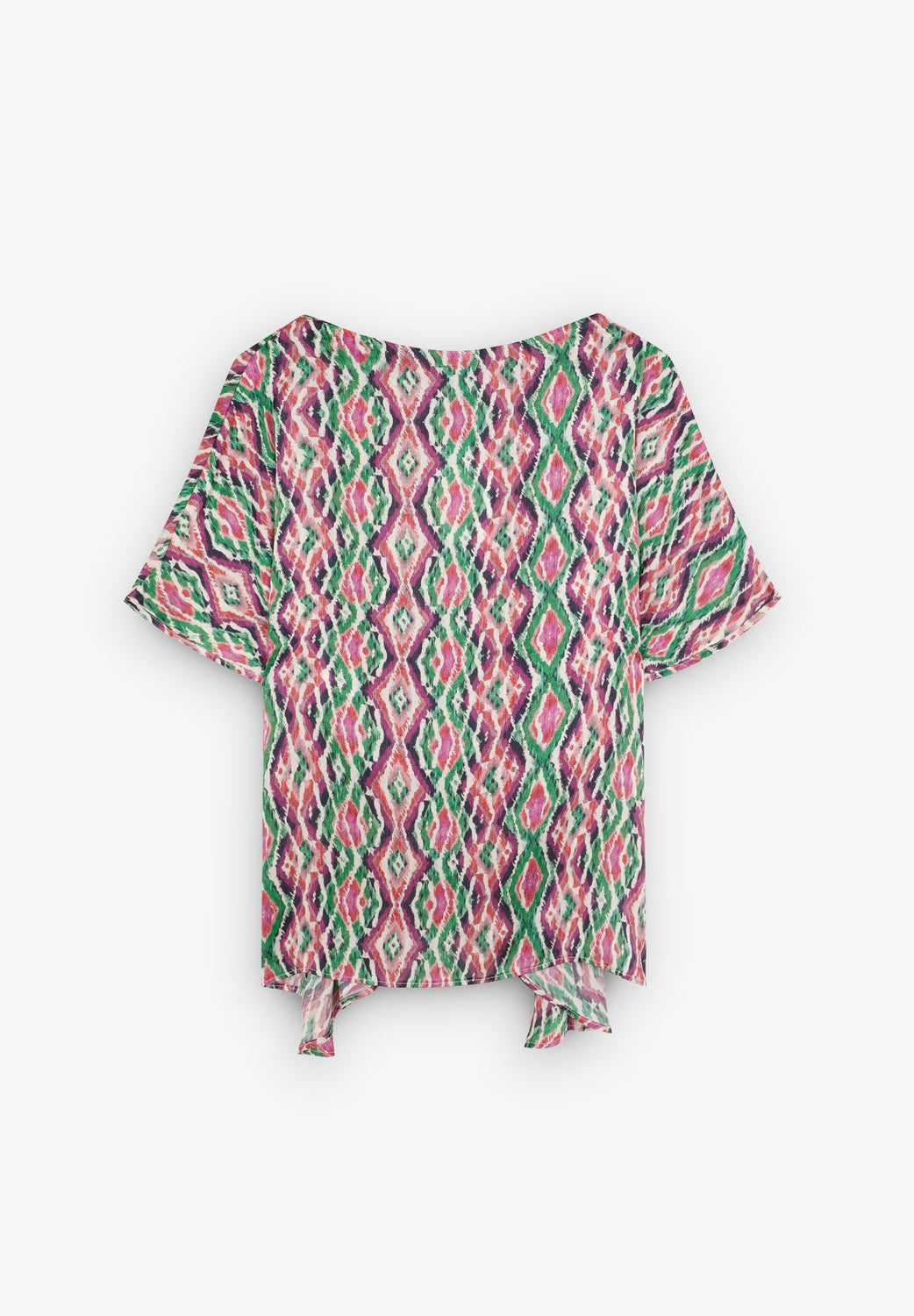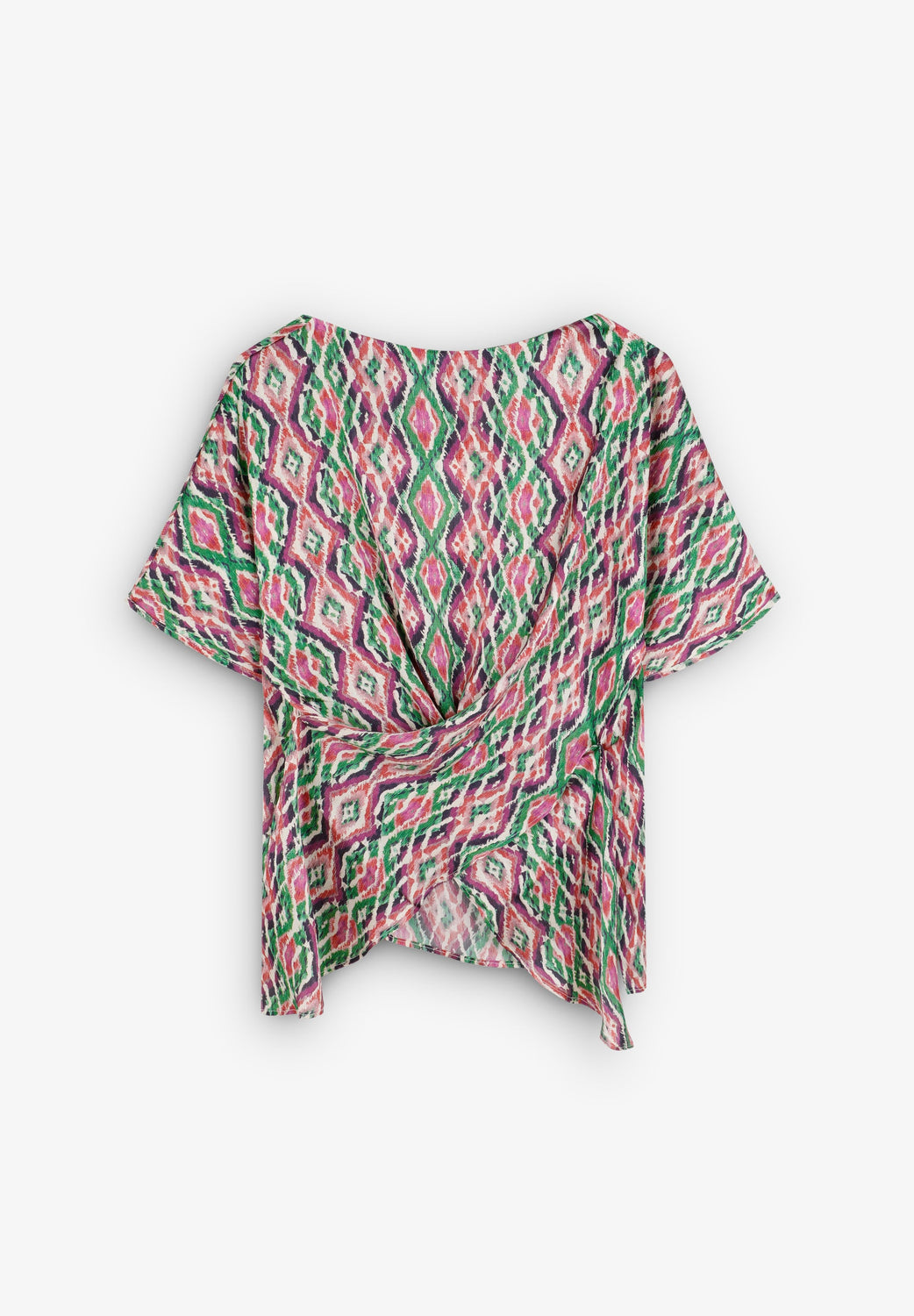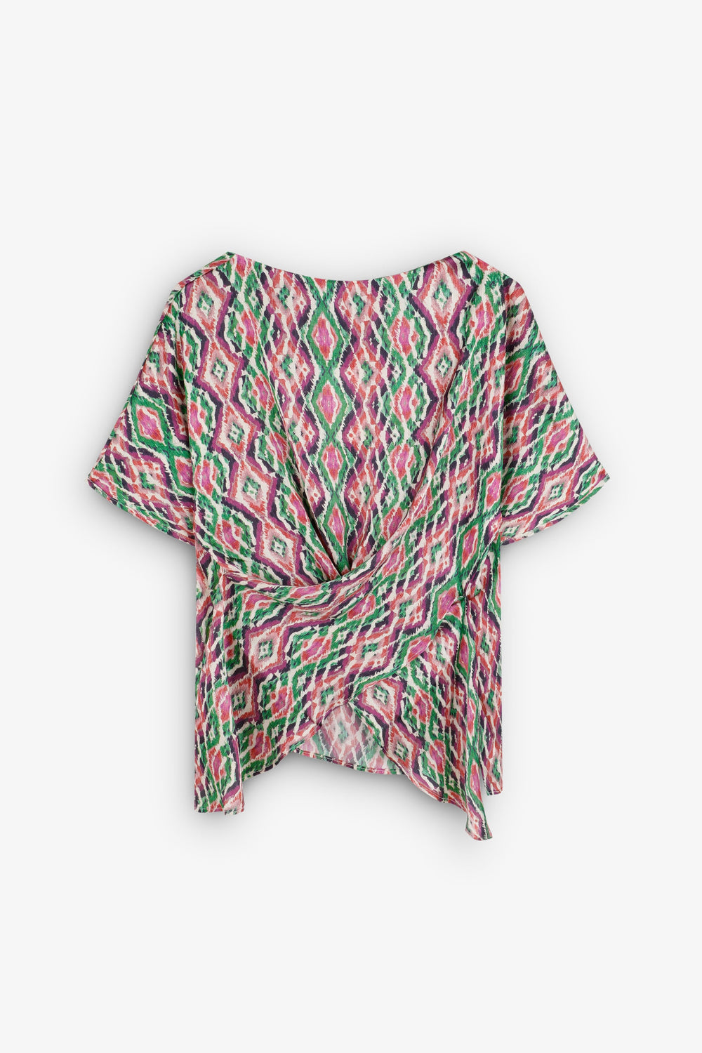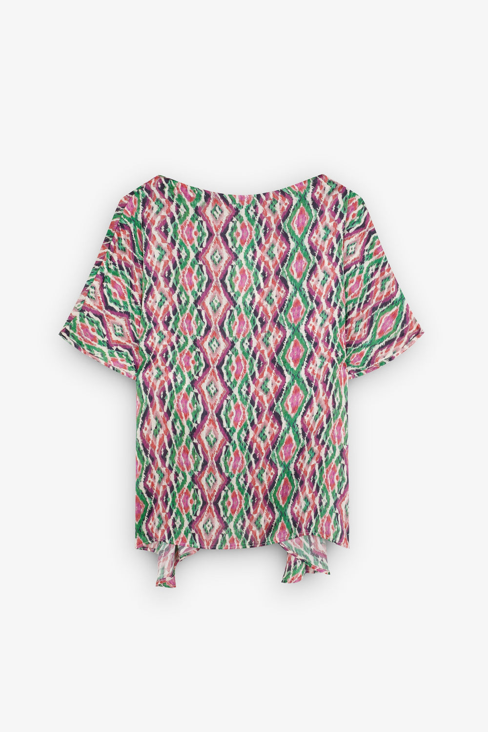 Camiseta confeccionada en tejido fluido con estampado. Corte regular fit, cuello redondo y manga corta. Detalle cruzado en cintura con bajo en abertura.