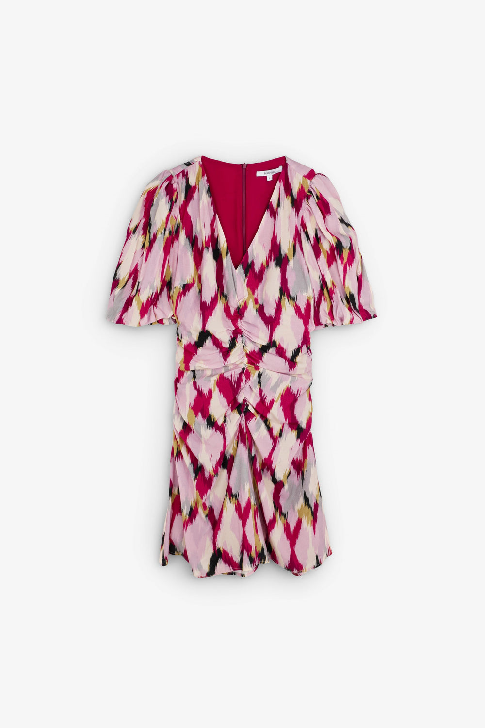 Vestido confeccionado en tejido fluido. Mini, corte Slim Fit, escote en V con frunces en cintura y manga corta abullonada. Forro interior y cierre trasero con cremallera oculta.