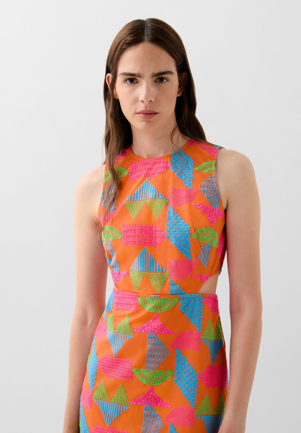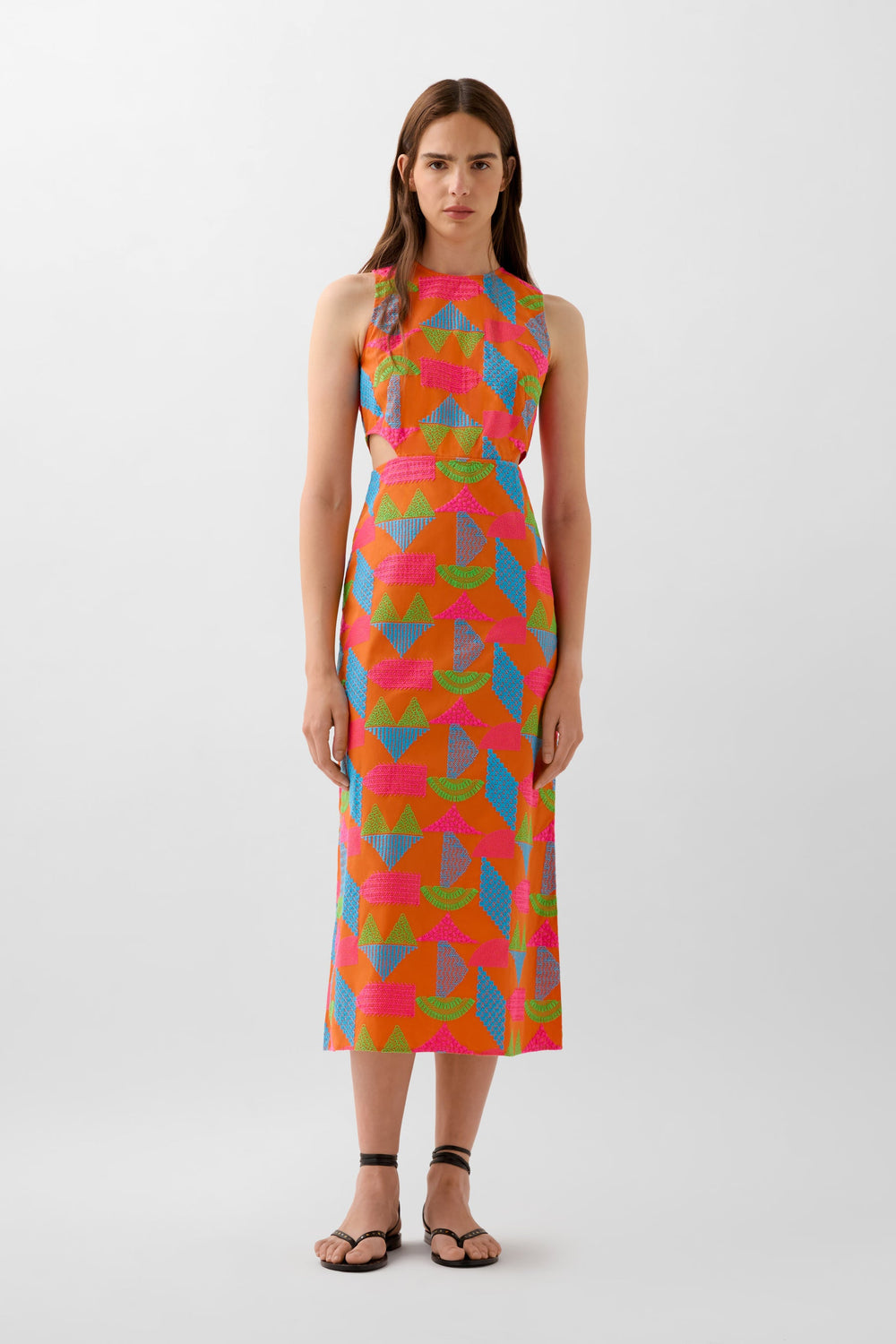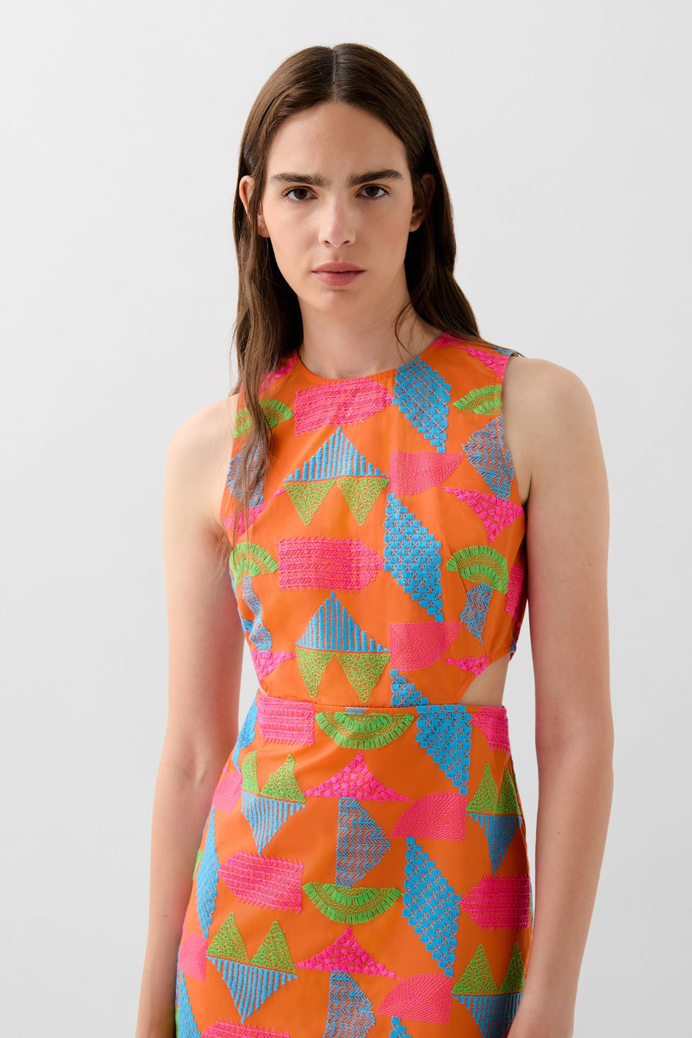 Vestido confeccionado en algodón 100% con estampado geométrico y cut outs laterales. Corte regular fit, midi, escote redondo, manga en sisa y cierre con cremallera trasera oculta.