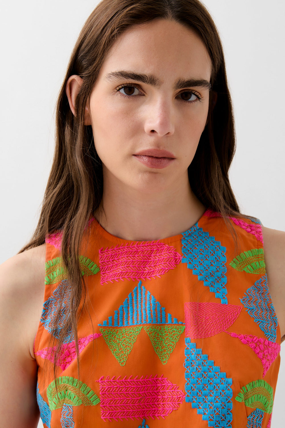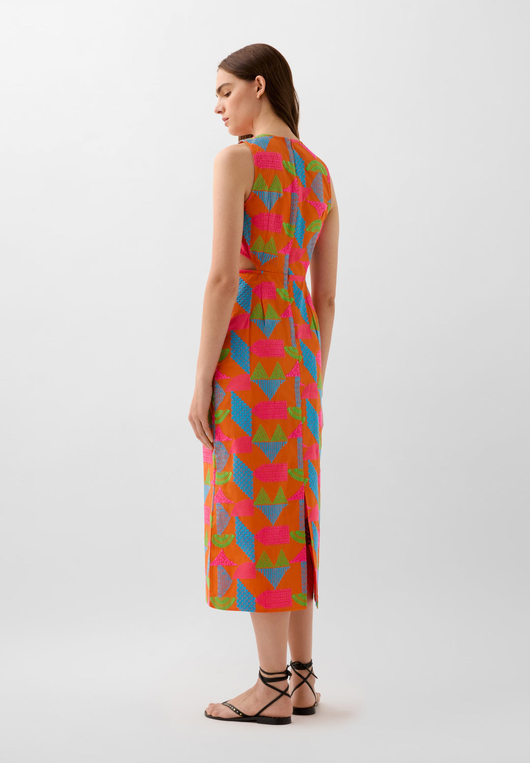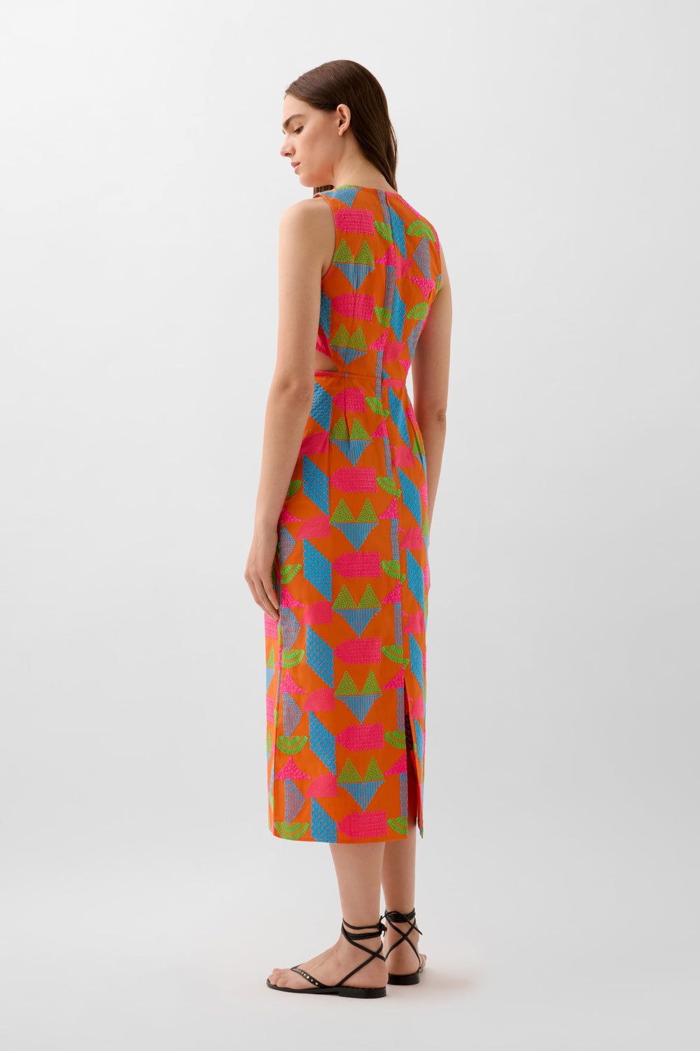 Vestido confeccionado en algodón 100% con estampado geométrico y cut outs laterales. Corte regular fit, midi, escote redondo, manga en sisa y cierre con cremallera trasera oculta.