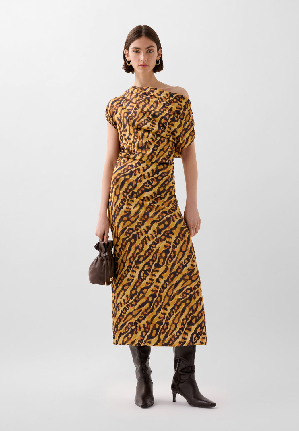 Vestido de corte midi. Escote asimétrico. Manga corta. Cierre mediante cremallera en la parte lateral. Un hombro descubierto. Tejido fluido de acabado satinado. Slim fit