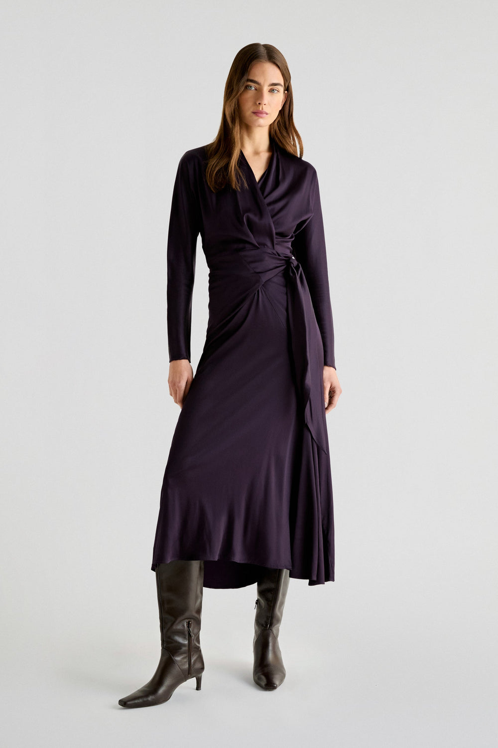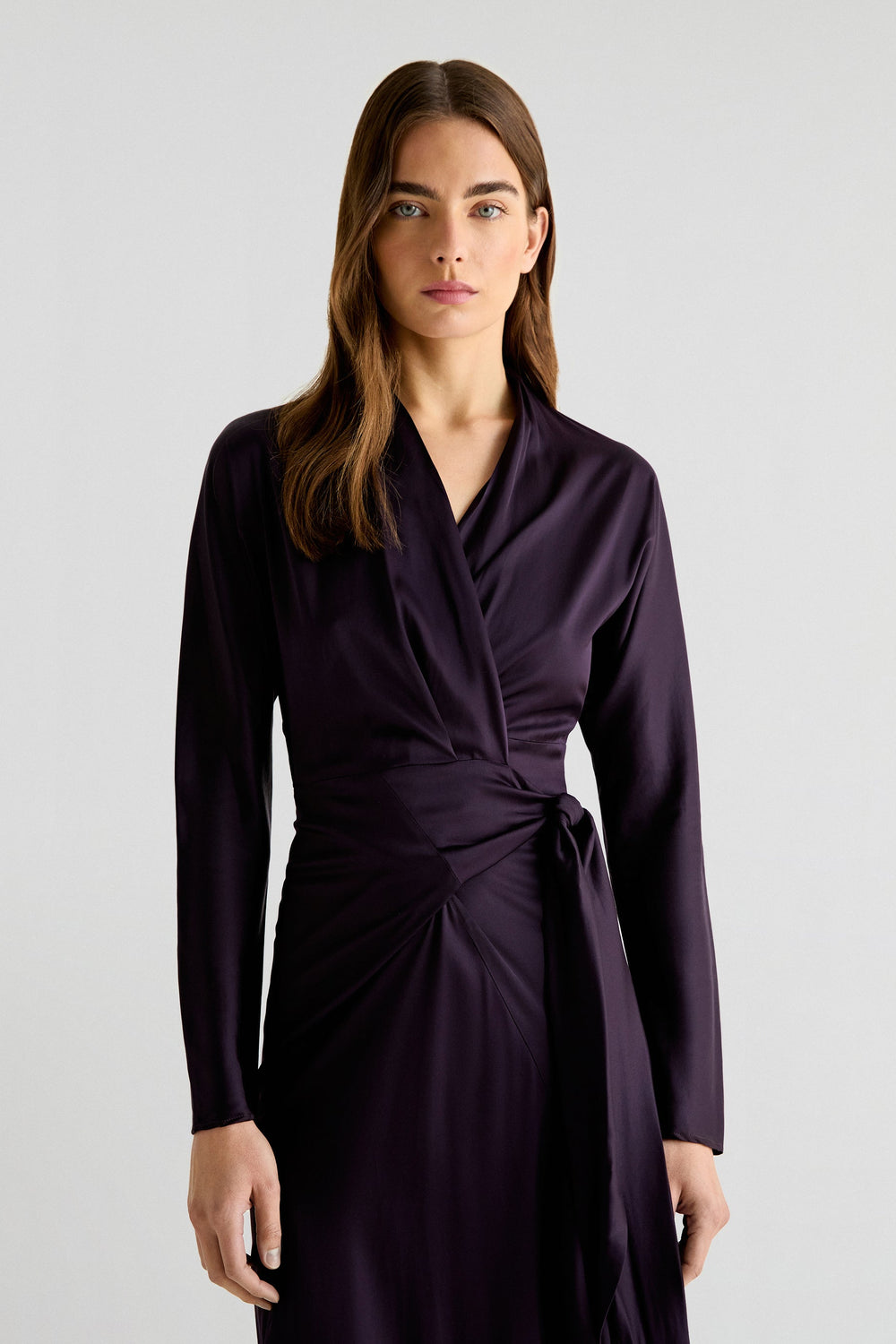 Vestido satinado confeccionado en tejido fluido. Regular fit, escote de pico y cierre con lazada tipo pareo. Manga larga.