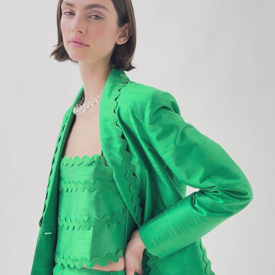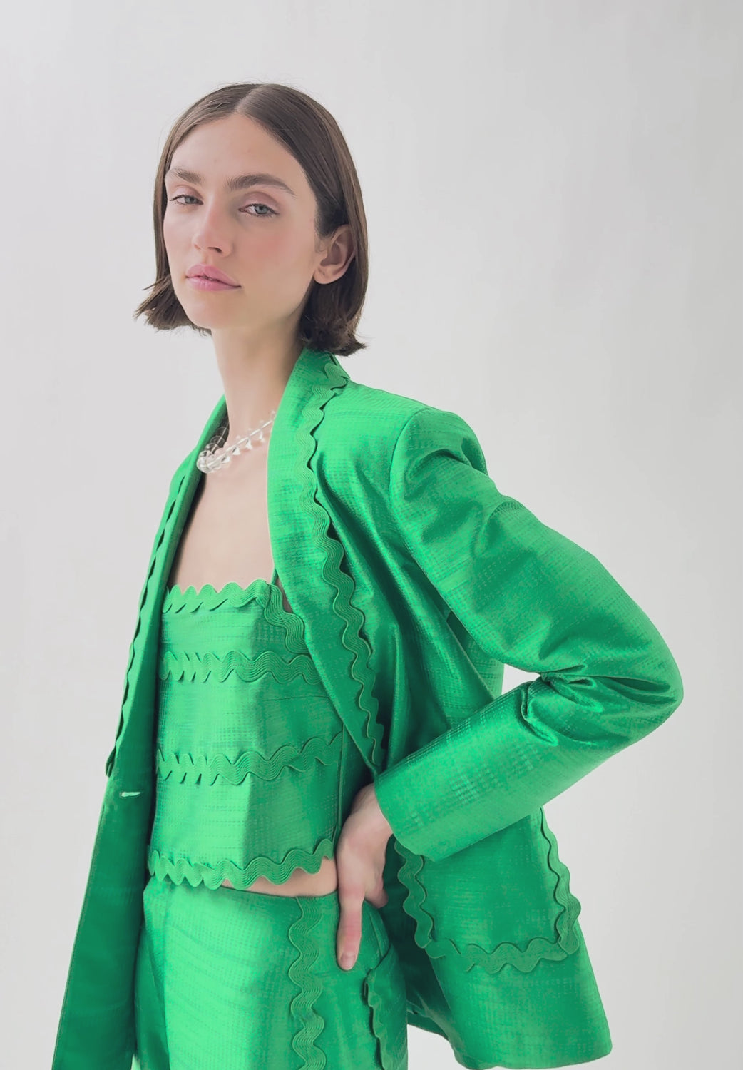 Blazer confeccionada en tejido ligeramente satinado. Regular fit con estructura, cuello con solapas y cierre con botón. Manga larga con hombreras y bolsillos de parche. Detalle de ondas en solapas y bolsillos.