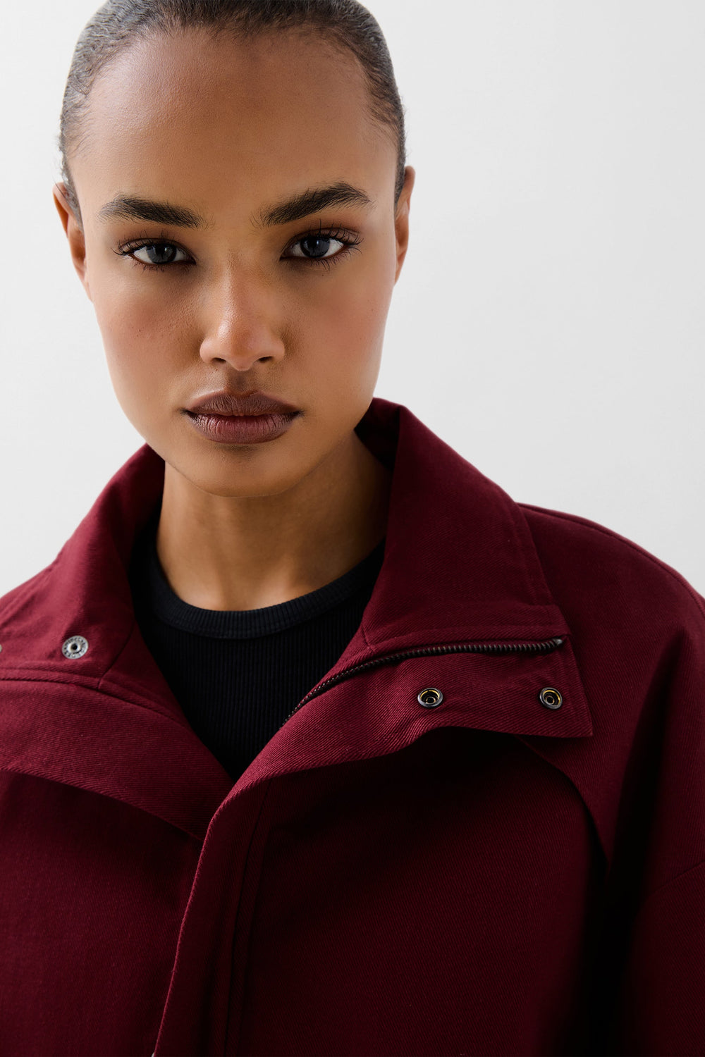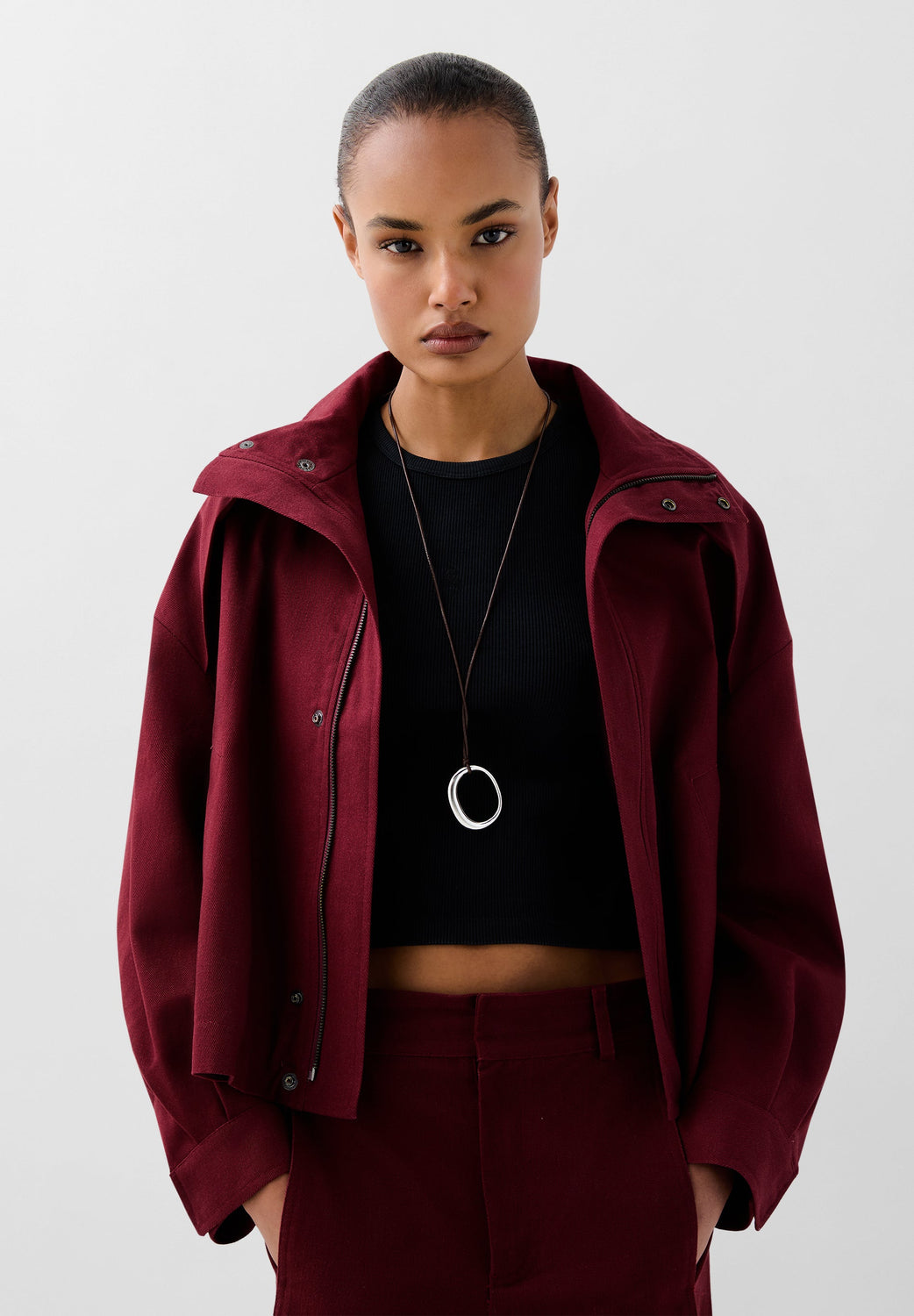 Cazadora confeccionada en 100% Algodón Orgánico. Manga ranglán. Cierre mediante cremallera frontal oculta por tapeta. Cuello cerrado. Dos bolsillos laterales. Puño con cierre de botón tipo snap. Detalle pliegues en manga. Hecho en España.