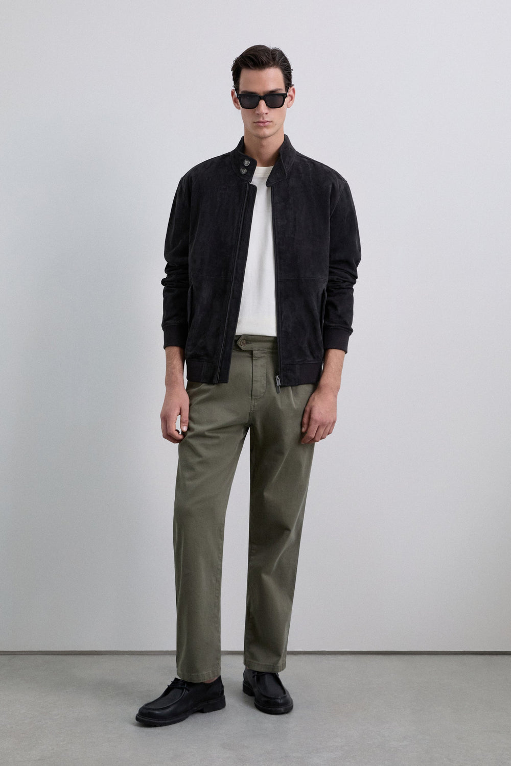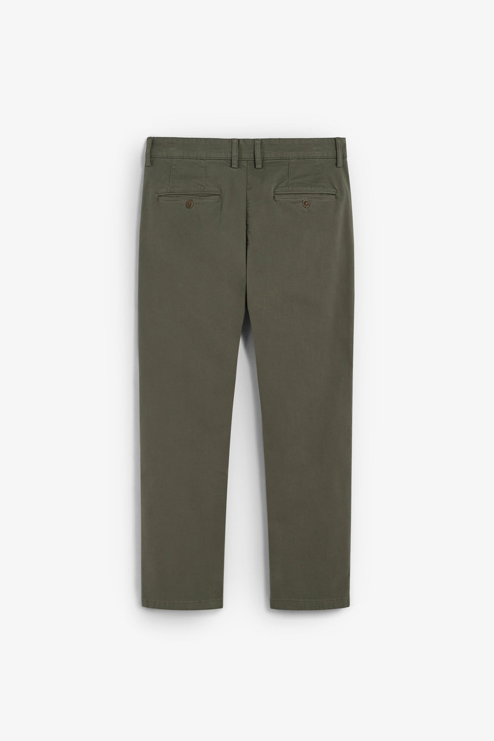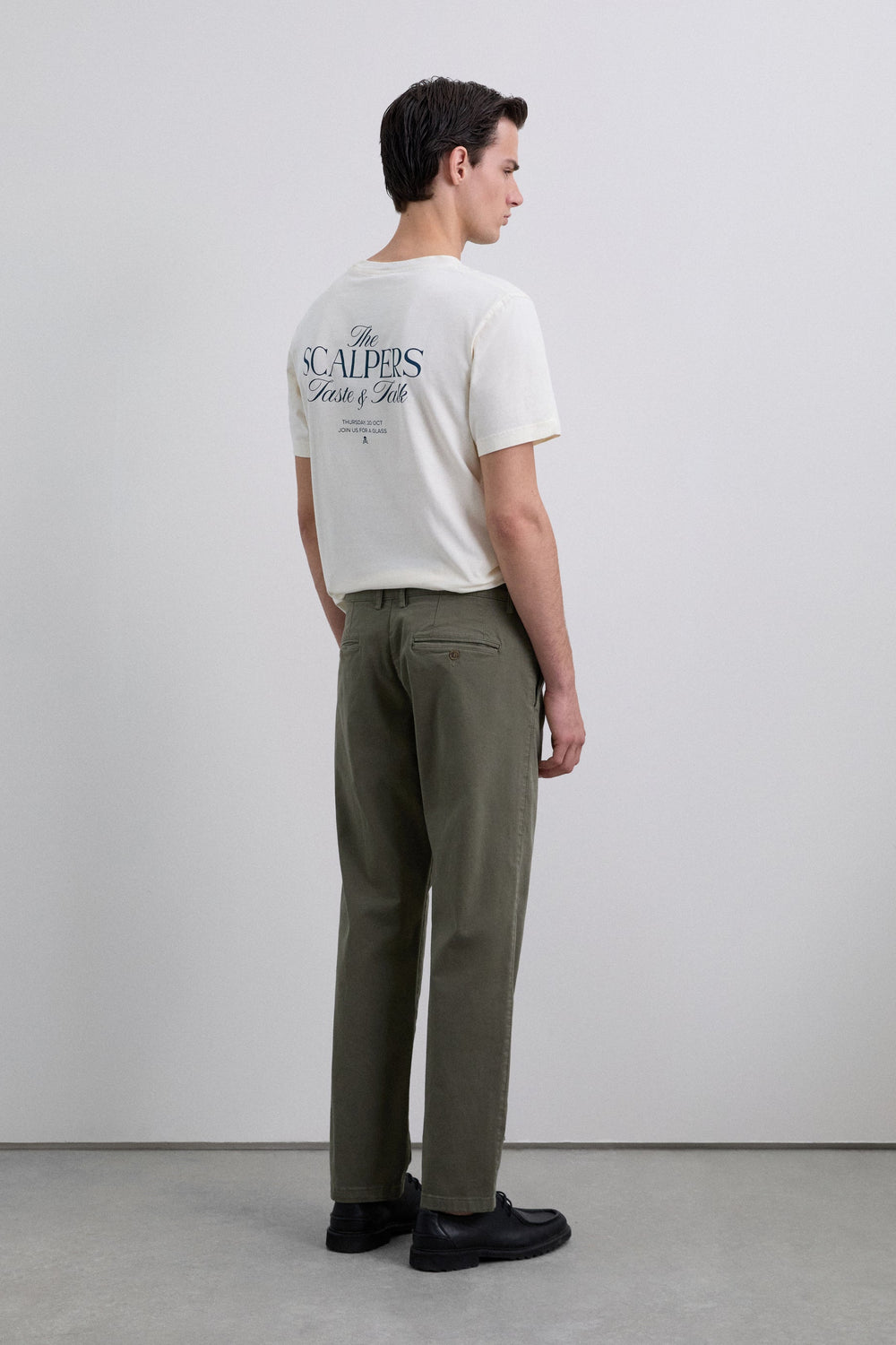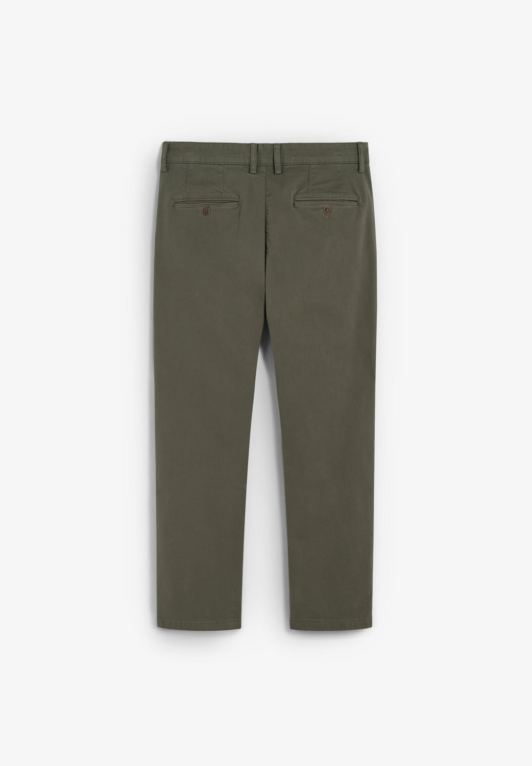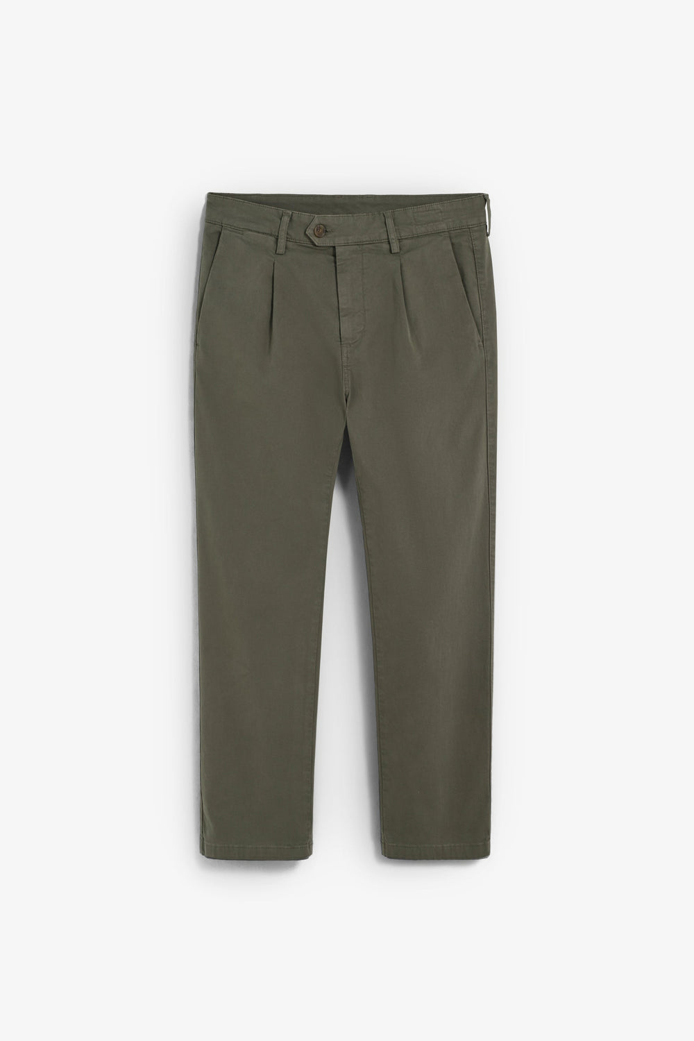 Pantalón chino confeccionado algodón ligeramente elástico. Corte holgado con pliegues. Cierre mediante cremallera oculta con tapeta y botón en la cintura. Bolsillos laterales y traseros. Trabillas en la cintura.
