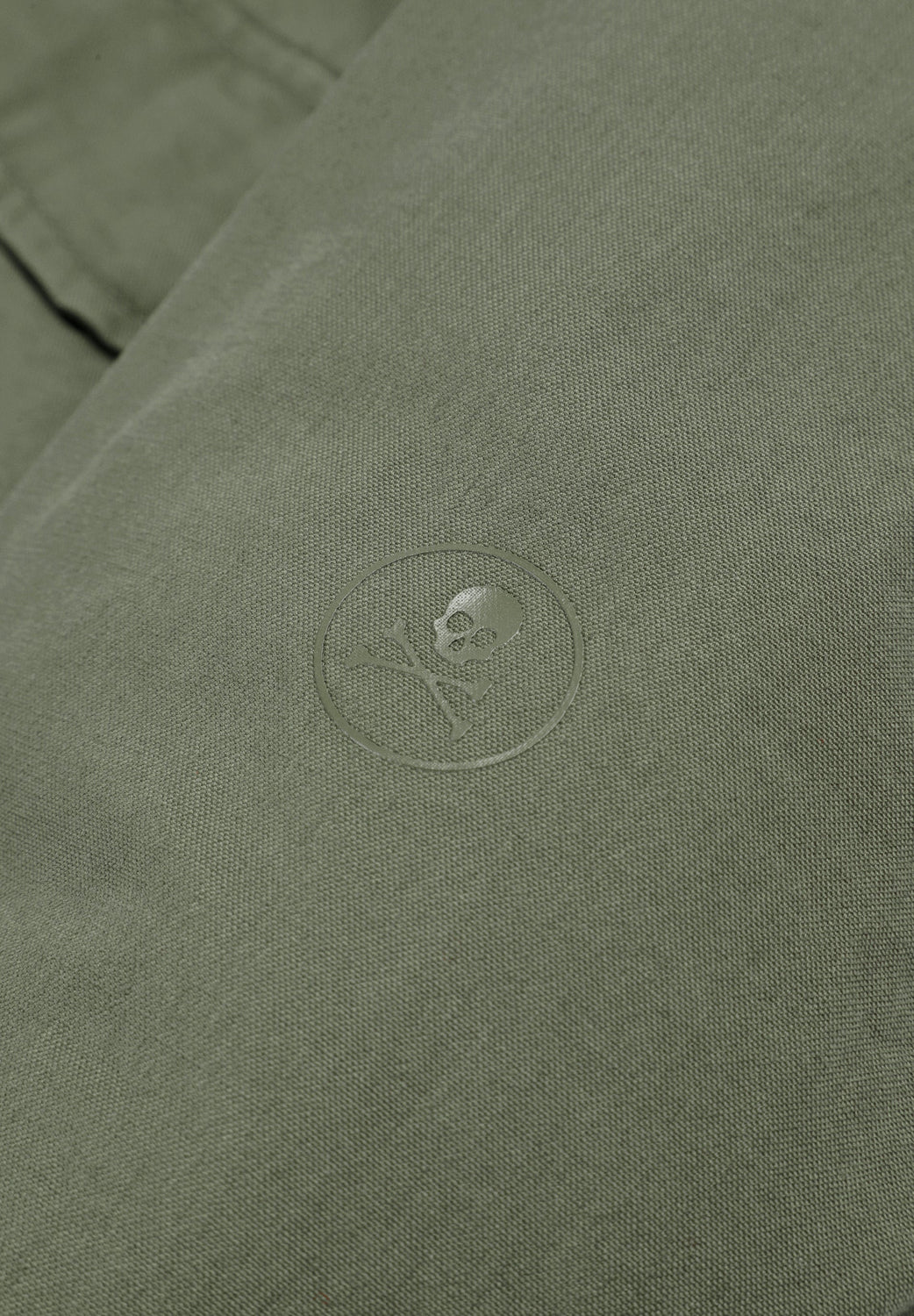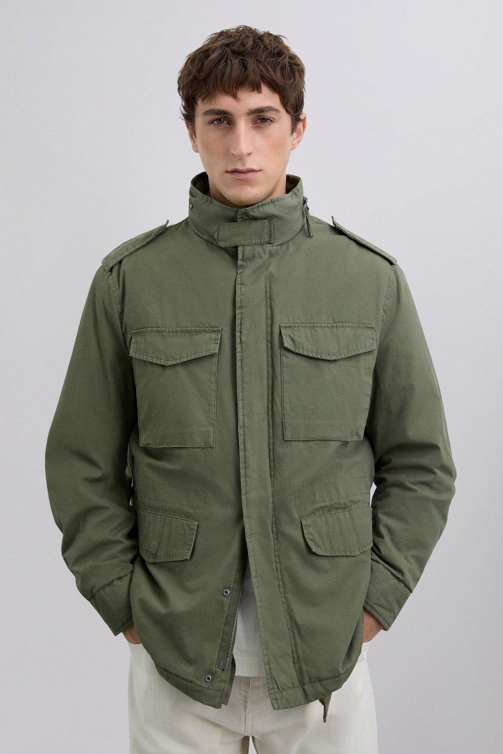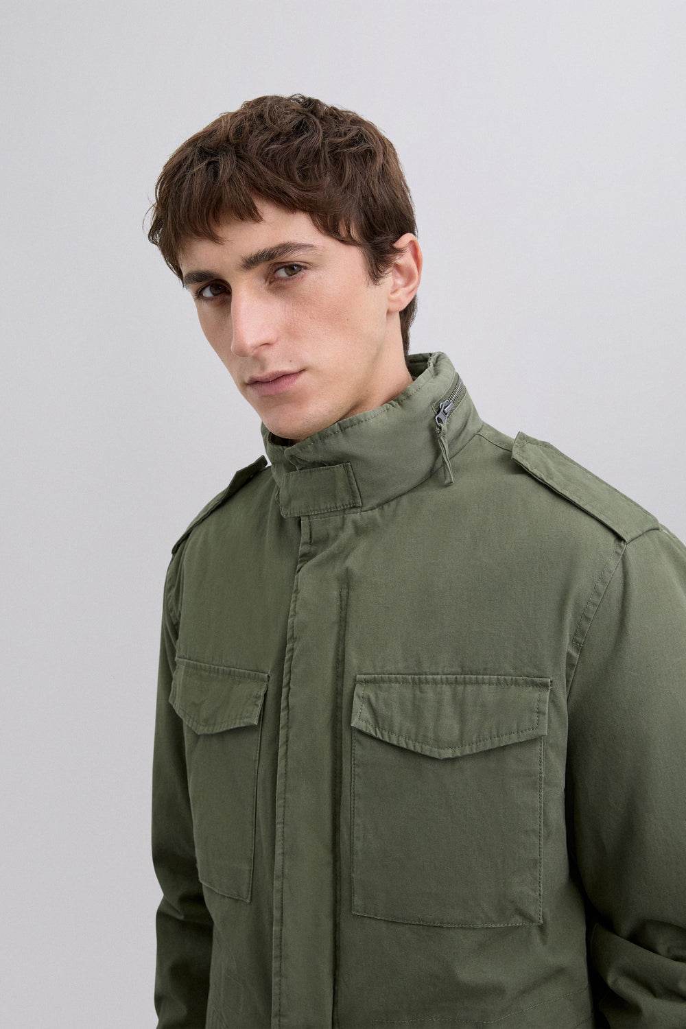 Parka confeccionada en algodón orgánico. Estilo militar. Cuatro bolsillos en frontal. Detalle de cierre en el cuello. Cordón interior ajustable. Cierre delantero con cremallera y capucha de contraste oculta en cuello. Interior forrado con motivo rombos. Puños ajustables. Detalle de logo alta densidad en manga.