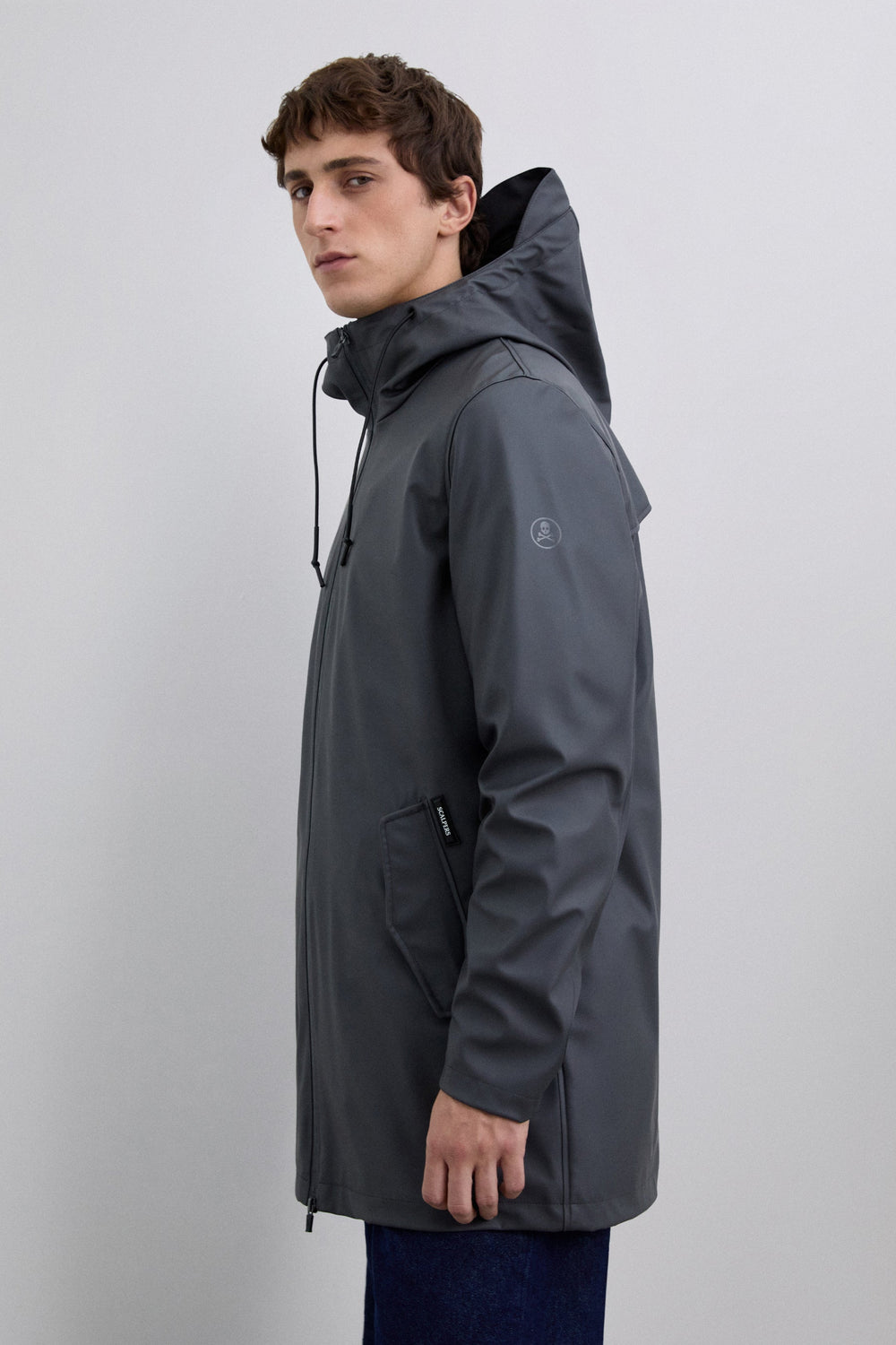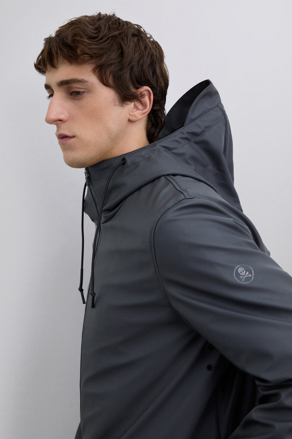 Chaqueta impermeable. Cuello con capucha ajustable con cordón. Cierre con cremallera de doble carro termosellada. Manga larga. Bolsillos laterales con tapeta y snap. Detalle logo engomado a contraste en frontal inferior y calavera a tono en manga.