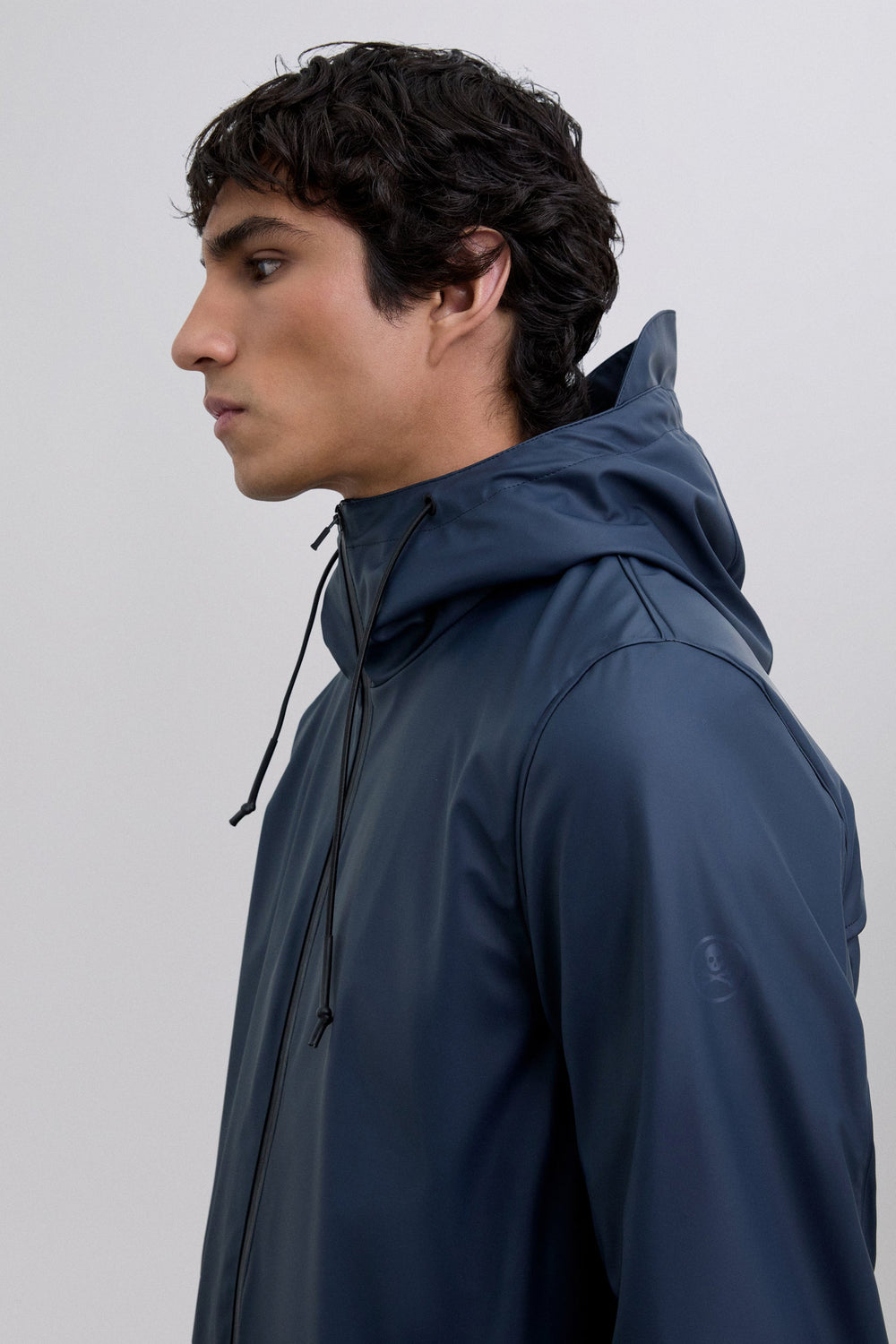 Chaqueta impermeable. Cuello con capucha ajustable con cordón. Cierre con cremallera de doble carro termosellada. Manga larga. Bolsillos laterales con tapeta y snap. Detalle logo engomado a contraste en frontal inferior y calavera a tono en manga.
