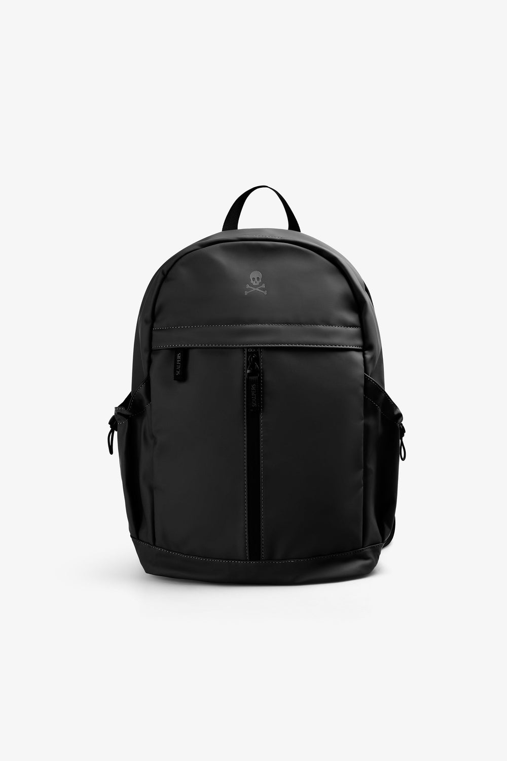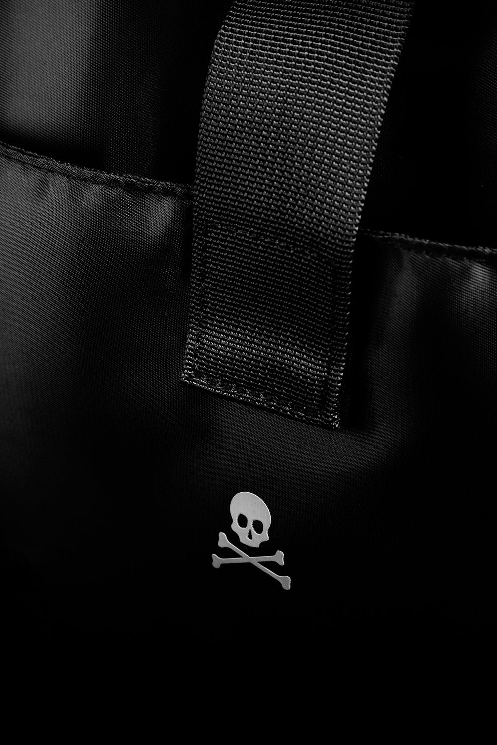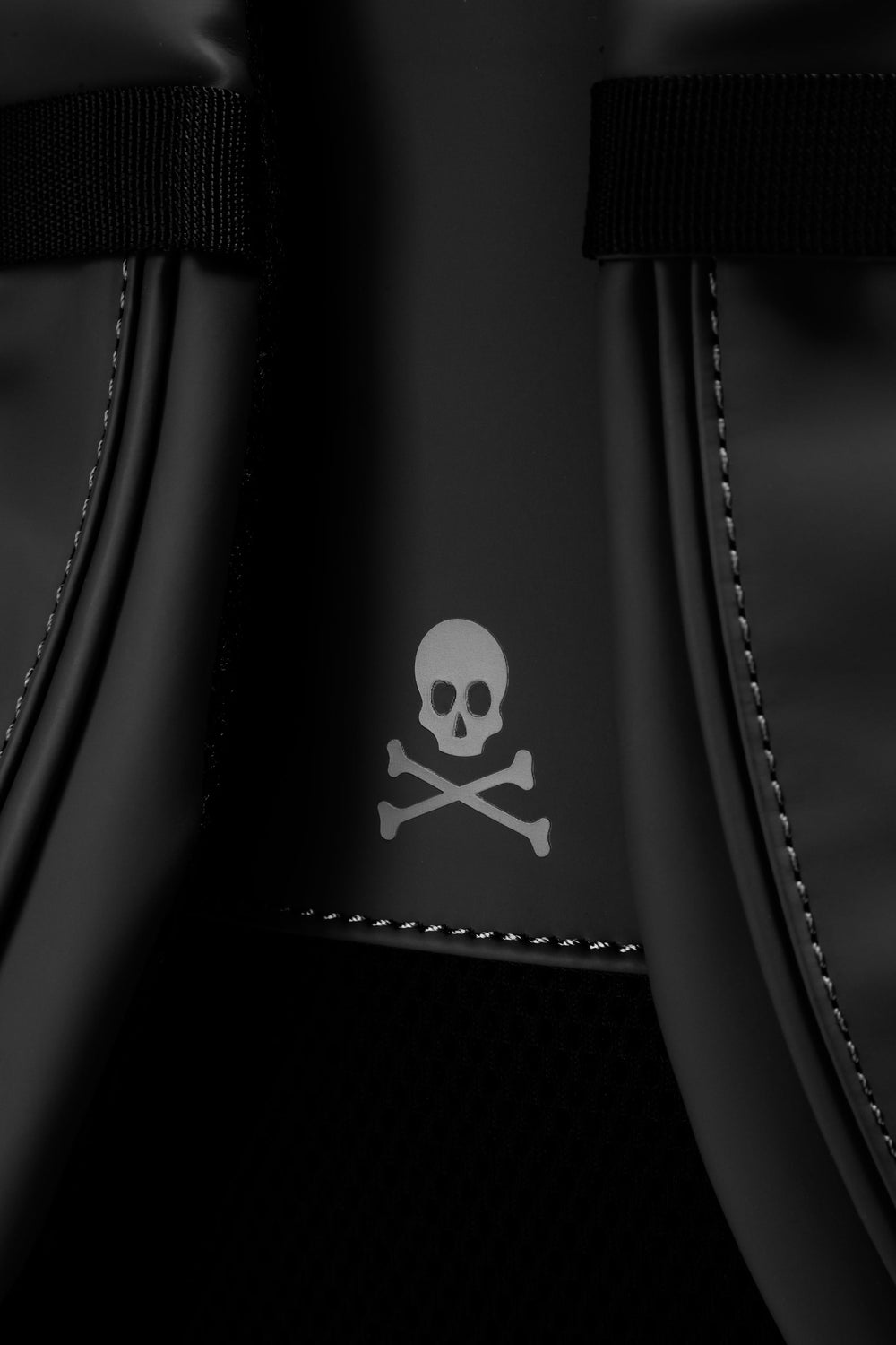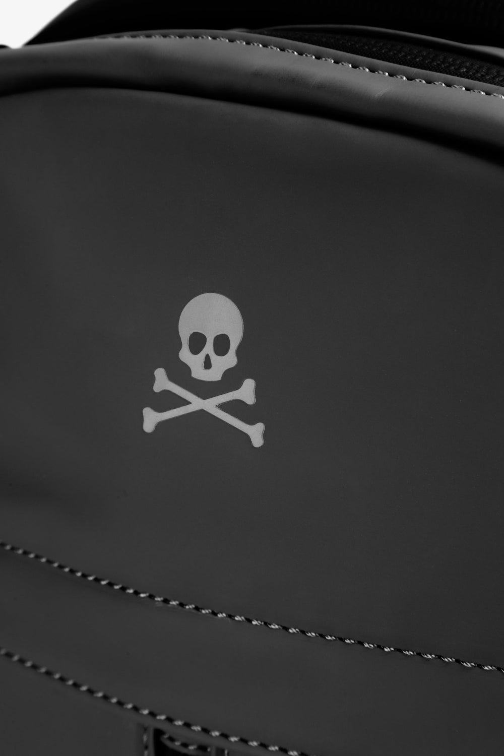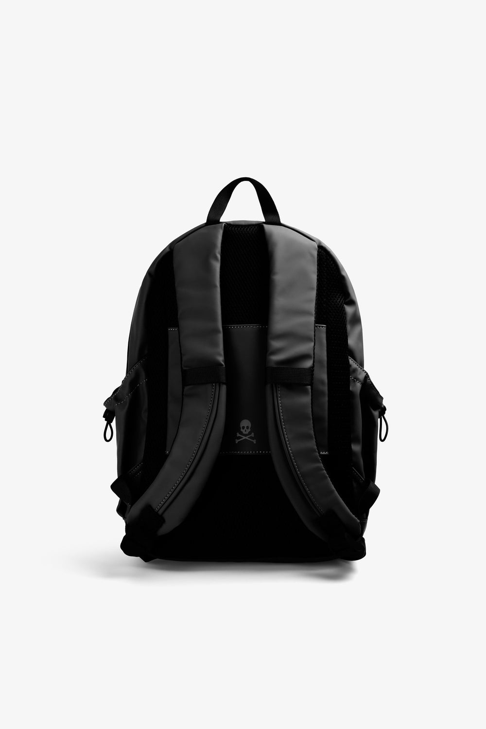 Mochila confeccionada en tejido técnico. Doble bolsillo frontal exterior. Cierre ajustable con hebillas. Detalle de calavera en print frontal y trasero. Asa superior. Ajustes de sujeción en laterales y espalda. Refuerzo acolchado en espalda.