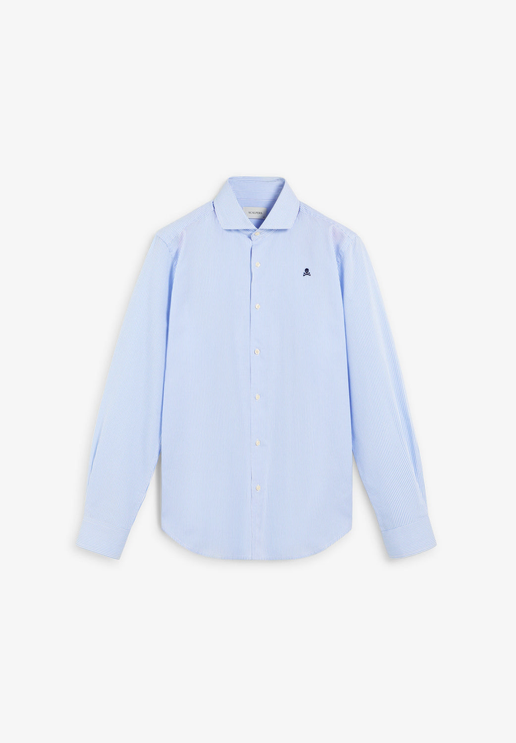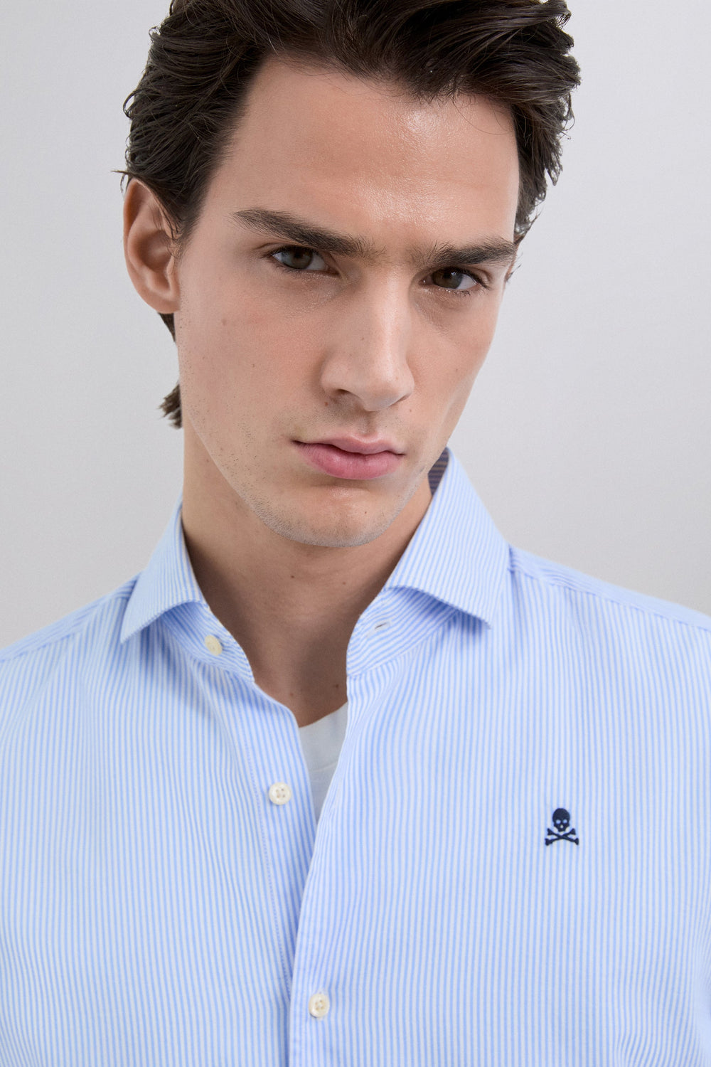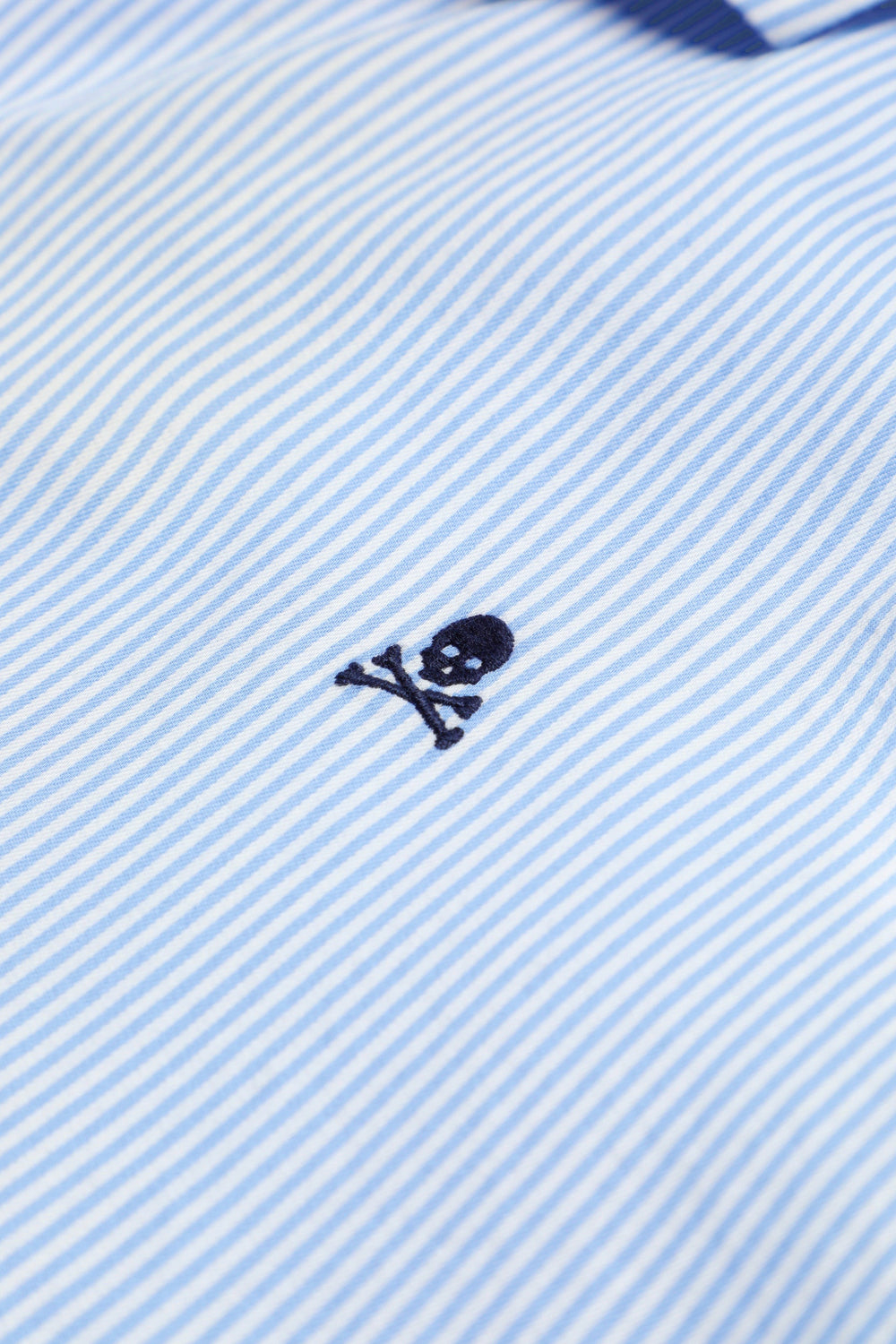 Camisa confeccionada en 100% algodón BCI. Regular Fit. Manga larga. Estampado de rayas. Cierre frontal y en puño mediante abotonadura. Detalle calavera bordada a contraste en pecho.