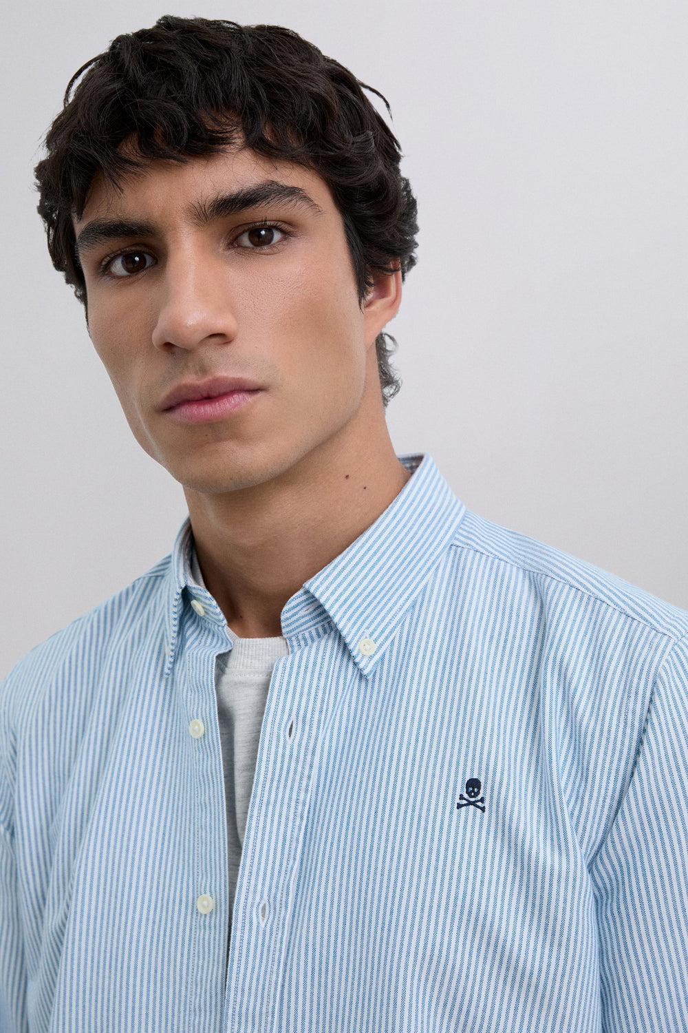Camisa Oxford confeccionada en 100% algodón BCI. Cierre mediante abotonadura, Estampado de rayas. Manga larga con cierre mediante botón. Detalle de calavera bordada a contraste en pecho.