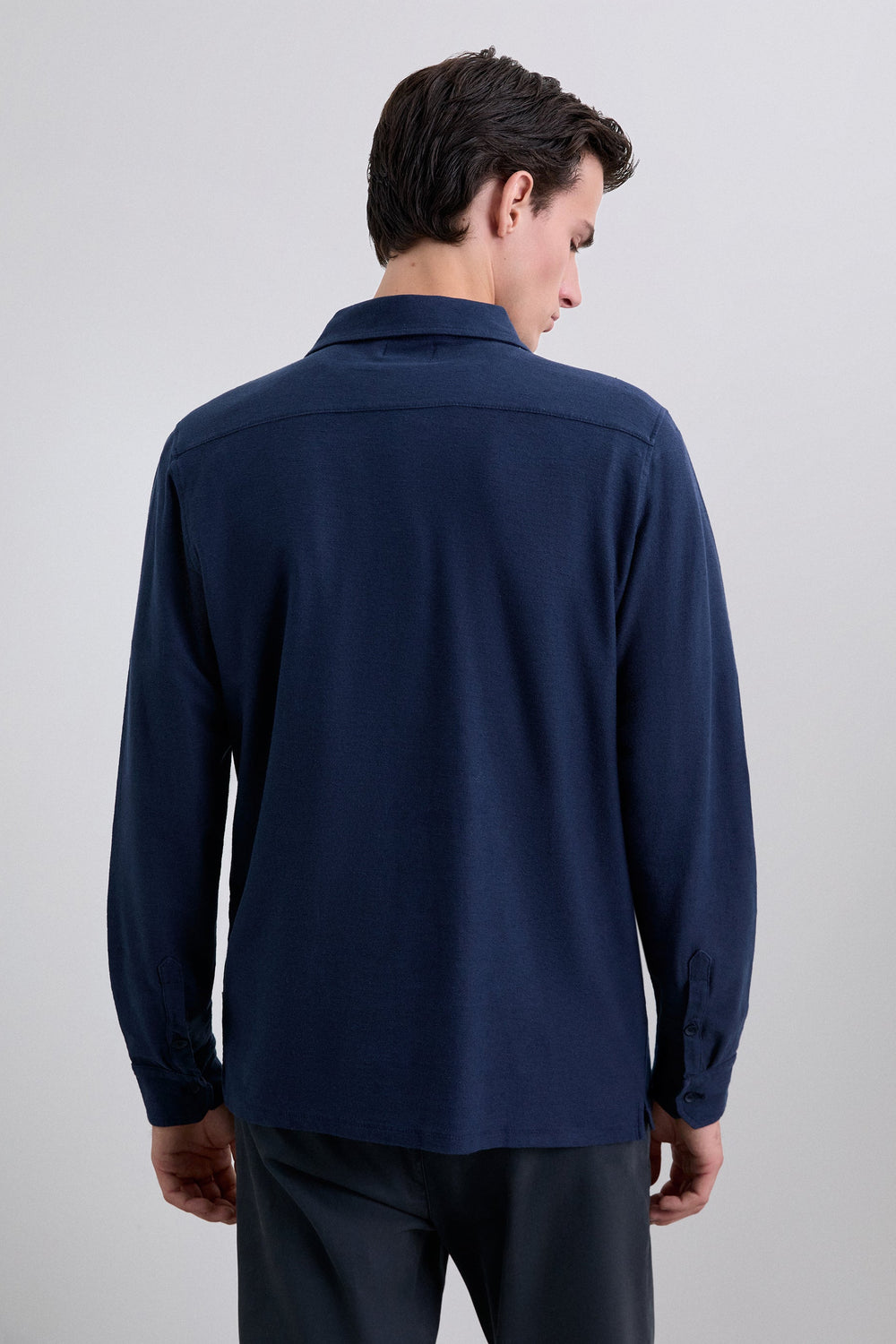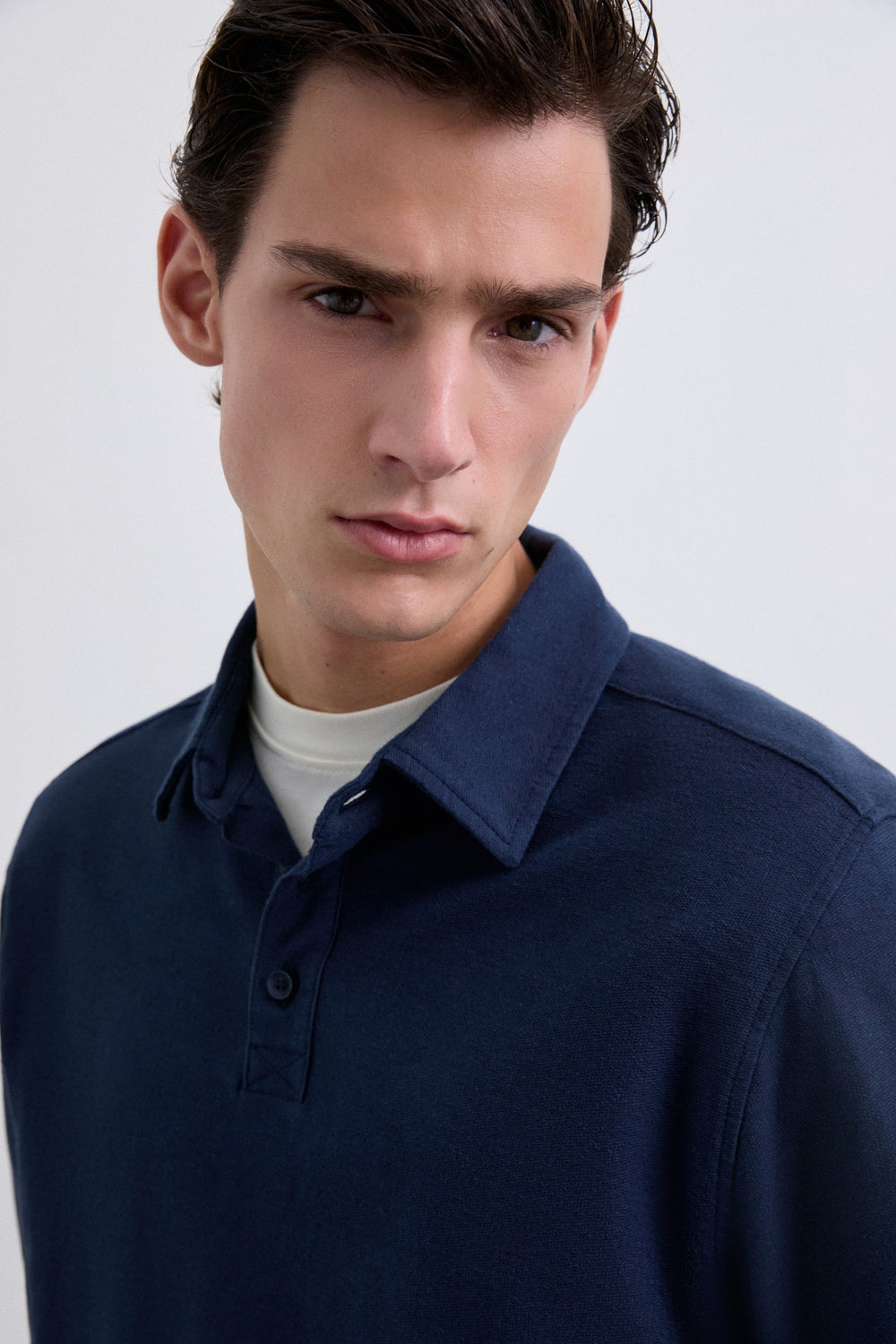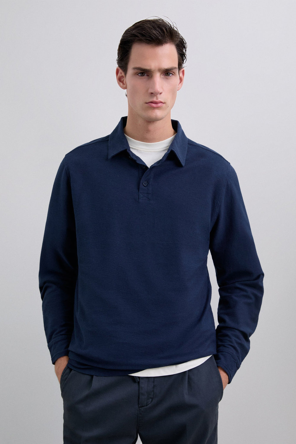 Polo manga larga de punto. Confeccionado en mezcla de algodón, y lino ligeramente elástico. Cuello polo con cierre de botones. Cierre de botones en manga.