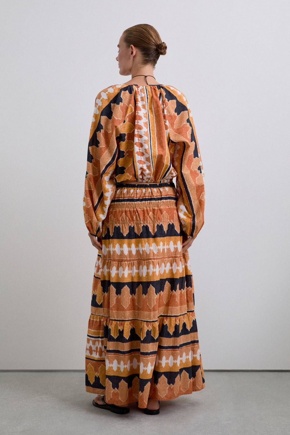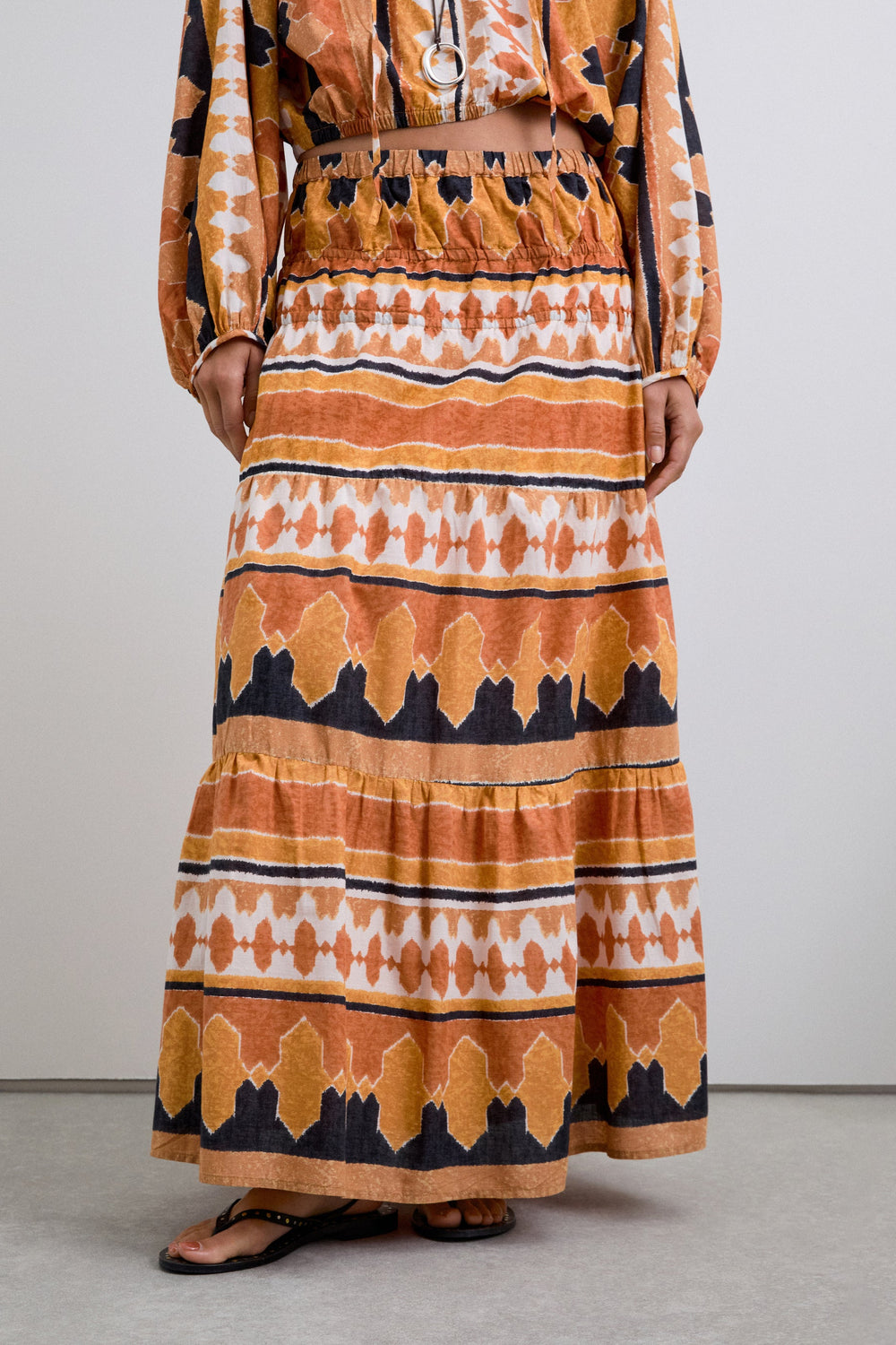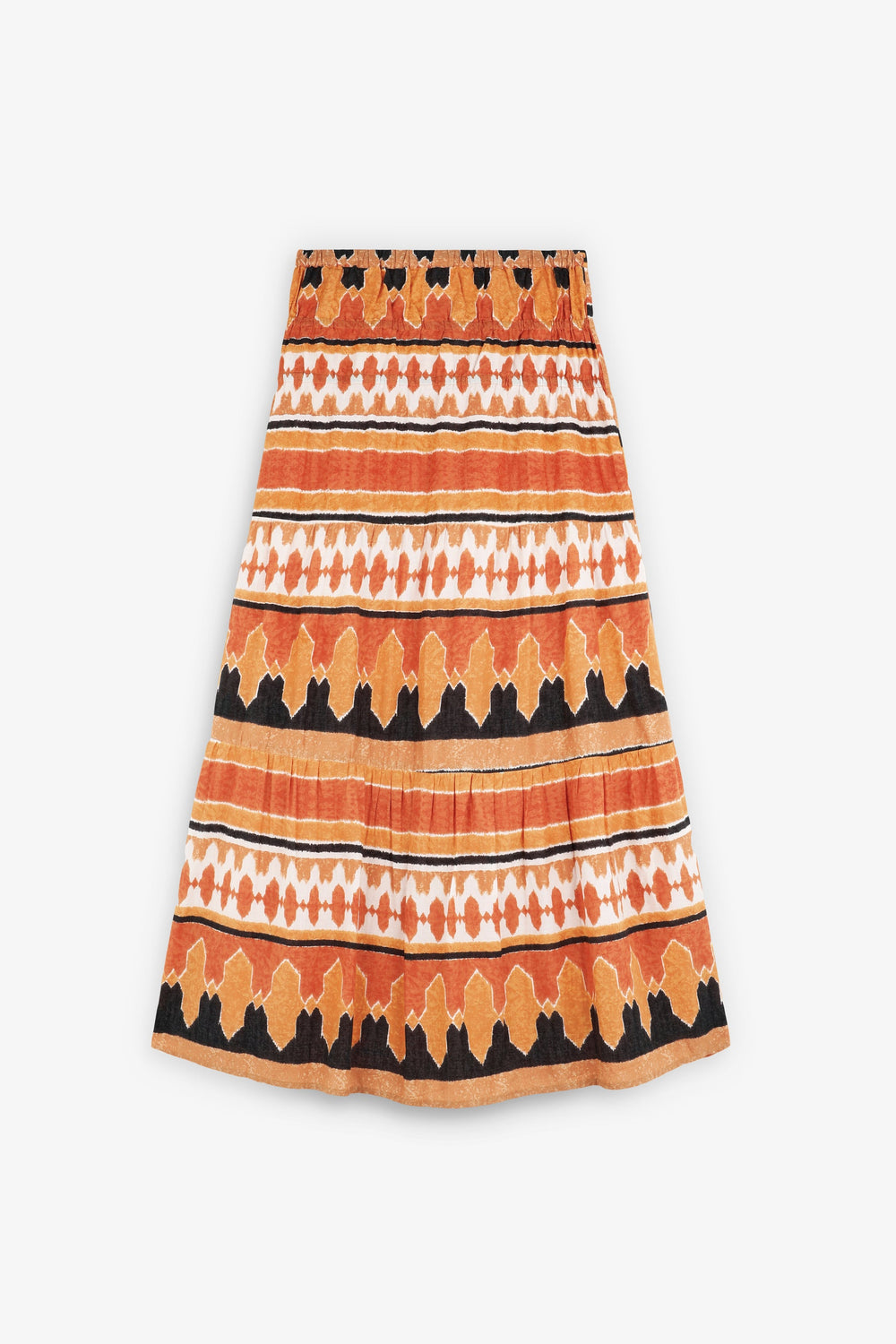 Falda estampada confeccionada en tejido 100% algodón BCI. Cintura ligeramente elástica. Corte Evasé.