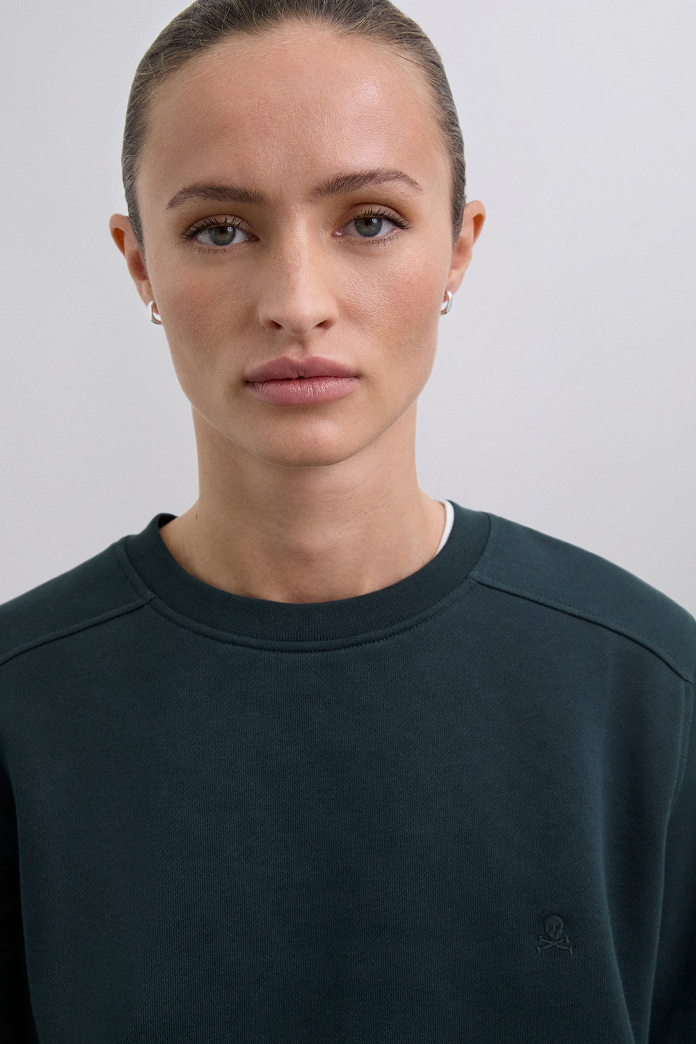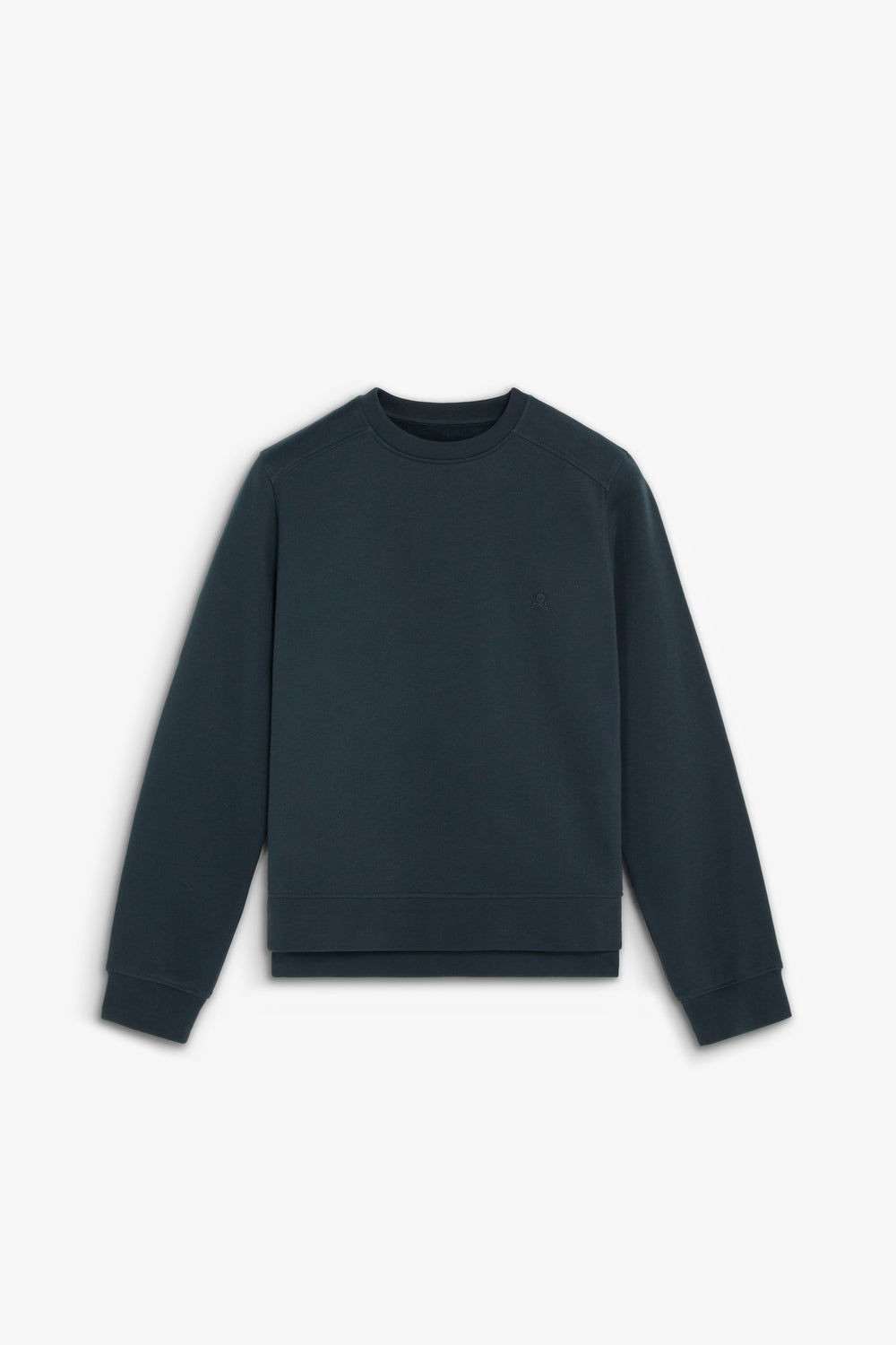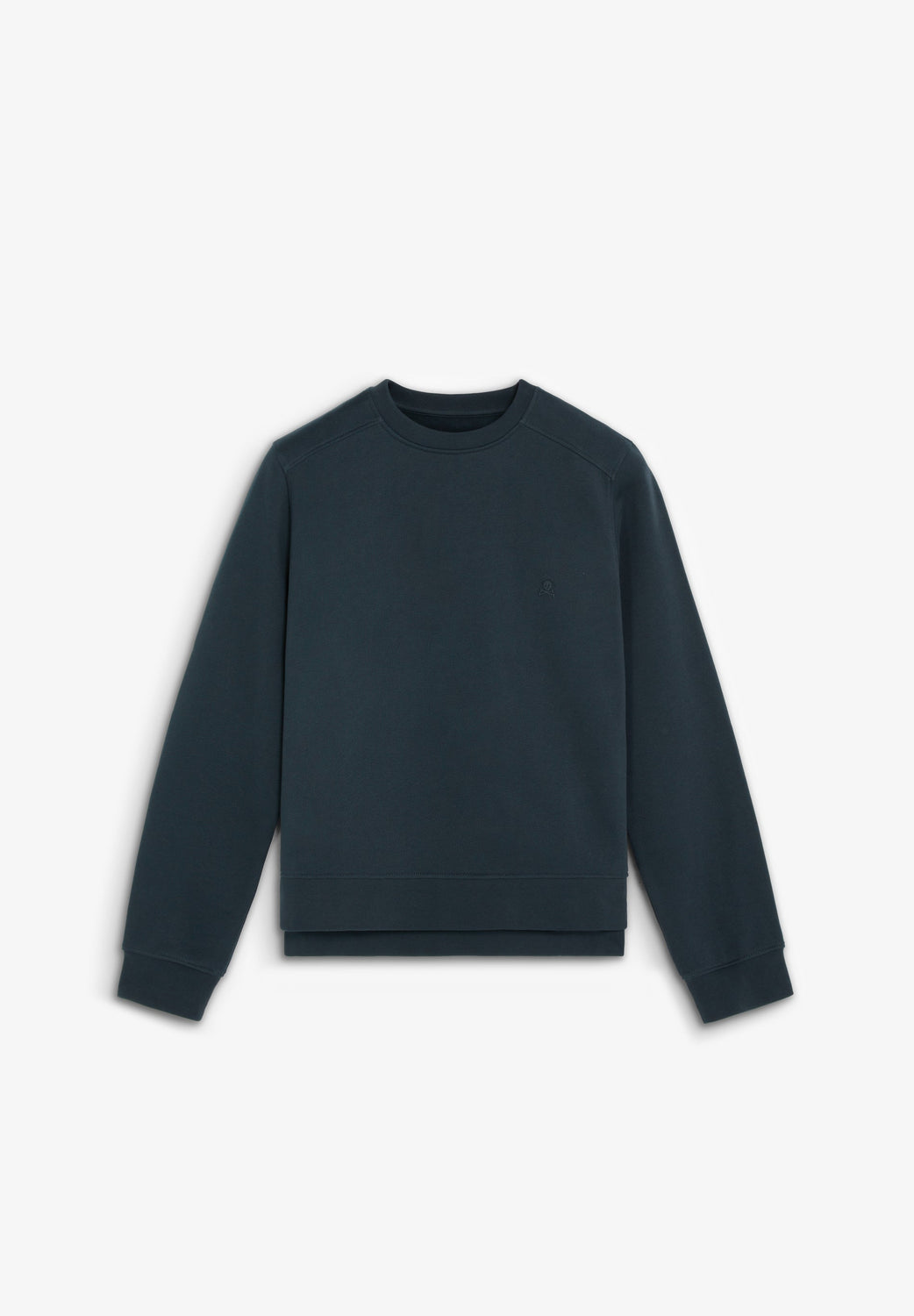 Sudadera confeccionada en algodón orgánico 100%. Corte regular fit, cuello redondo y manga larga con puños acabados en rib. Bajo asimétrico, parte trasera alargada. Detalle de calavera bordada en pecho.